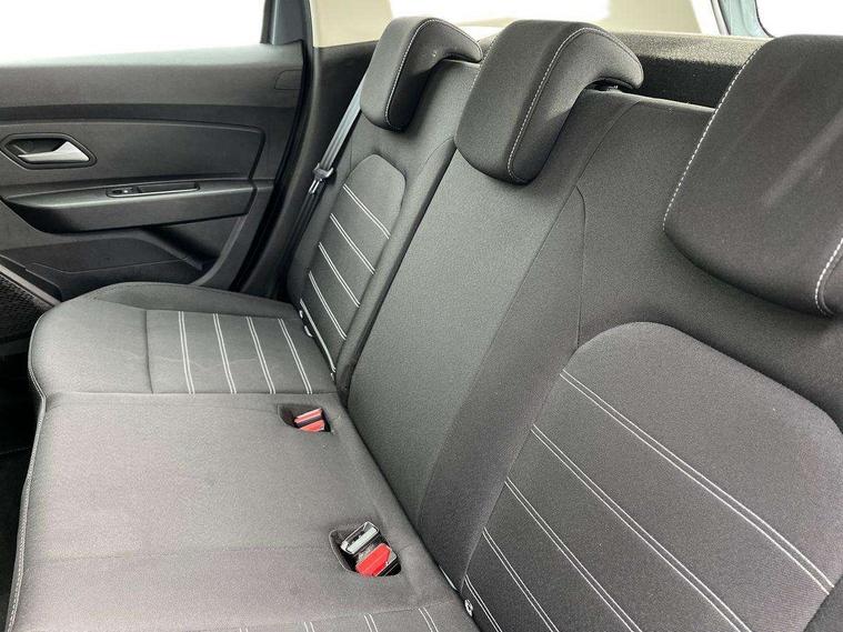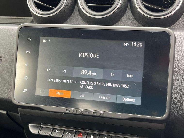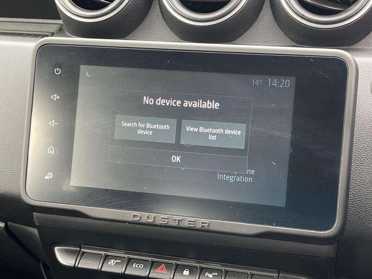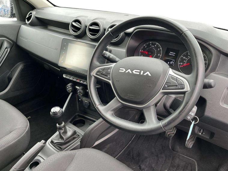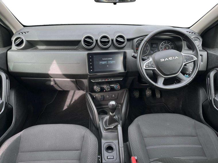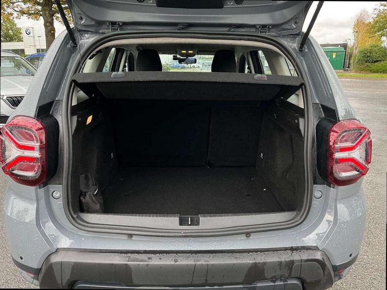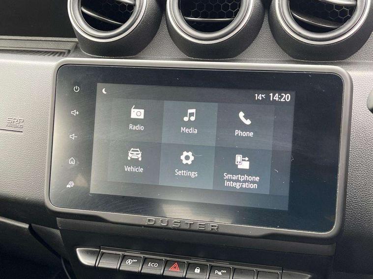 Cruise control and speed limiter, eCall emergency system, Eco mode, Electric power assisted steering, On board computer, odometer, trip computer, average fuel consumption, average speed, service indicator, outside temperature gauge, Rear parking sensors, Rev counter, Reversing camera, Stop/start system, 8" Media display with smartphone replication, 2 usb sockets and 6 speakers, Dacia plug and radio/MP3/USB/bluetooth/DAB/steering wheel control, 3 speed windscreen wipers, Black longitudinal roof bars with Duster inscription, Black side sills, Black/satin chrome tailgate trim with Duster inscription in black background and lettering, Body coloured door handles, Chrome front grille with hot stamping, Chrome logo surround on steering wheel, Daytime running lights, Drivers window one touch up/down, Dusk sensor, Electric adjustable/heated door mirrors, Electric front windows, Electric rear windows, Front and rear body coloured bumpers, Front door sill protection strip, Front fog lights, Heated rear window, High level third rear brake light, Rain sensor, Rear side wing doors, Rear spoiler, Rear wash/wipe, Satin chrome door mirrors, Tinted windows, Underbody protection skid plates, Y shaped LED headlights with rear LED lights, 3 rear height adjustable headrests, 3 seat bench in 2nd row, 60/40 split folding rear seat, Backlighted steering wheel buttons, Boot light, Driver seat lumbar adjustment, Fabric decorative insert on door panels, Fabric upholstery, Front head restraints, Front passenger reading light, Gear shift indicator, Height adjustable driver seat, Height adjustable front and rear headrests, Height and depth adjustable steering wheel, High centre console with driver armrest, Isofix points for child seats in both outer rear seats, Manual air conditioning, Map pocket on front seat backs, Passenger sunvisor with vanity mirror, Rear passenger reading light, Satin chrome interior door handles, Satin chrome lower steering wheel insert, Single front passenger seat, Soft feel leather steering wheel, 3x3 point rear seatbelts, ABS and Emergency brake assist, ASR traction control with Electronic stability control, Child locks on rear doors, Door open visual and audible warning, Driver airbag, Driver and passenger seatbelt not fastened - visual and audible warning, EBD - Electronic brakeforce distribution, Front passenger airbag, Front passenger airbag deactivation, Front seatbelt pretensioners, Front side airbags, Height adjustable front seatbelts, Hill start assist, Tyre pressure monitor, Remote central locking, Thatcham approved engine immobiliser, Charcoal grey central console surround, Matt black central console fascia, Piano black decorative insert on front door panels, Satin chrome air vent surround, Satin chrome instrument dial surrounds, 16" alloy wheels,
