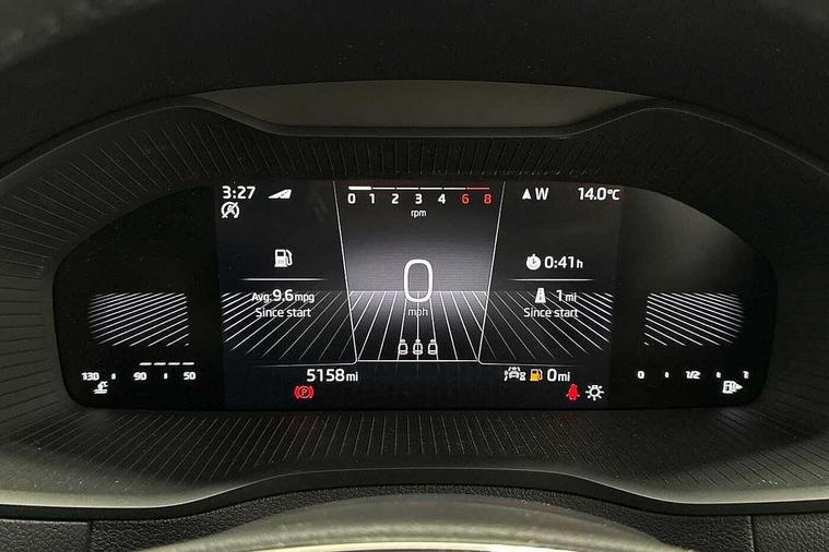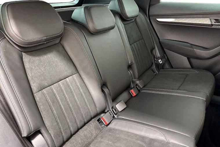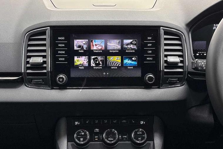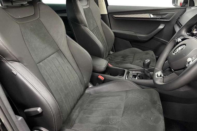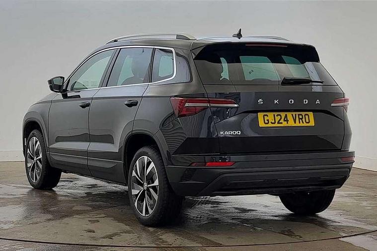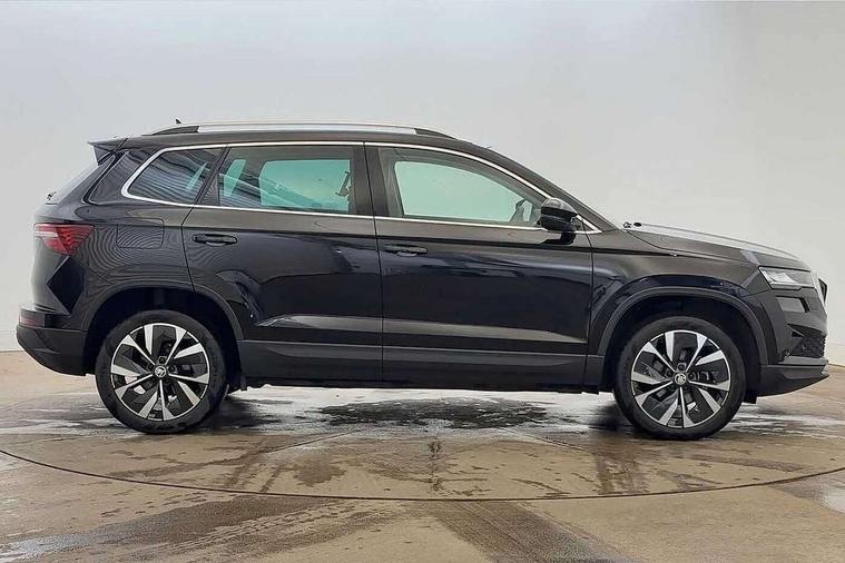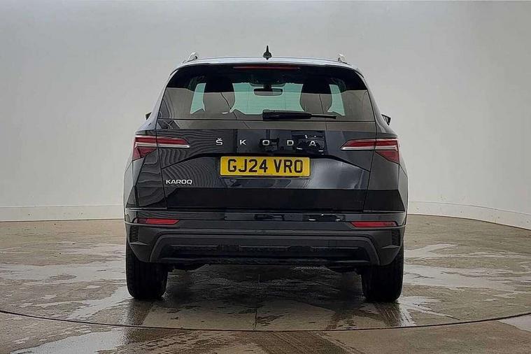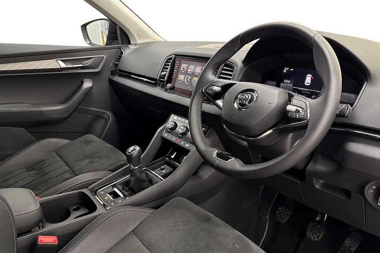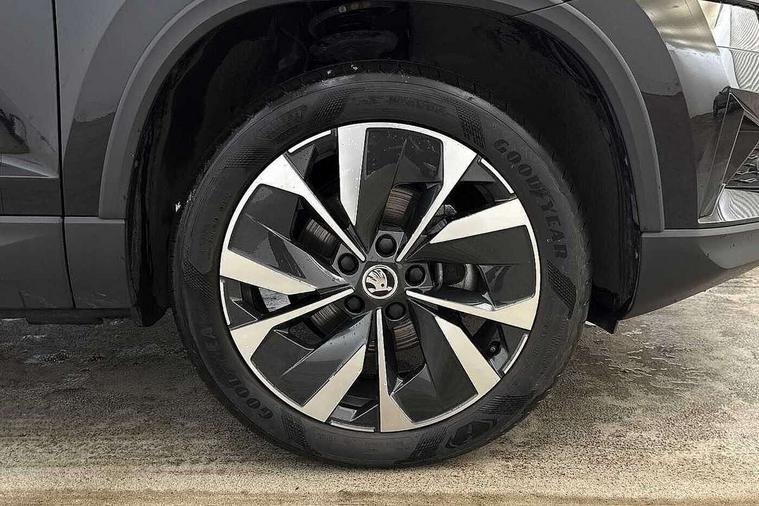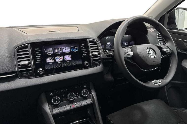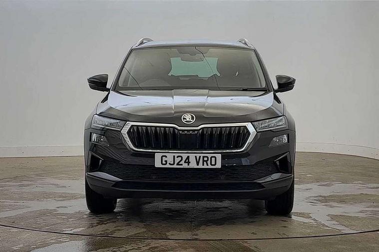 8" Digital display, Care connect, Drive mode selector, Driver fatigue sensor, Electro-mechanical PAS, Emergency services call system, Outside temperature gauge, Service interval indicator, SmartLink wireless for Apple and wired for Android, Start/stop system with regenerative braking, USB C Port x 2 in front centre console, 8 Speakers, DAB radio with Bluetooth, USB connection, Acoustic glass, Aero front windscreen wipers with intermittent function, Auto dimming rear view mirror with light and rain sensors, Black electric window control buttons, Body colour door mirrors and handles, Dynamic headlight range control with cornering light function, Electric front and rear windows with child proof lock, Heated rear windscreen, LED daytime running lights, LED rear lights with high functionality welcome effect and dynamic indicators, Light assistant (coming/leaving home/tunnel light), Plastic scuff plates, Privacy glass, Rear side wing doors, Rear spoiler, Rear window wiper with washer system and intermittent control, Safety reflectors on front doors, Third brake light, 1.5 litre bottle holders in driver and front passenger door panels, 12V socket in boot, 12v socket in front centre armrest with storage compartment and rear air vents, 2 spoke leather heated multifunction steering wheel, 2 x Tablet holder, 3 rear height adjustable headrests, 3 seat bench in 2nd row, 4 foldable roof handles with rear coat hooks, Black floor carpet, Chrome inner door handles, Double sided boot floor, Foldable hooks in the boot, Front head restraints, Height adjustable front three point seats belts with tensioners, Height/reach adjust steering wheel, Ice scraper, Illuminated glovebox, Illuminated luggage compartment, Isofix child seat preparation for front passenger seat, Isofix child seat preparation outer rear, Manual lumbar support for front seats, Pen holder, Pollen filter, Rear boot cover, Rear reading lights, Rubbish bin door, Safety vest holder, Single front passenger seat, Storage box in upper central dashboard closed, Sunvisors with illuminated vanity mirrors, Textile floor mats, Ticket holder, VarioFlex seats with standard rear seat release, Boot pack - Karoq, Design Pack - Karoq, Parking pack - Karoq, Automatic door unlocking in case of crash, Automatic fuel cut off in case of crash, Child locks on rear doors, Driver airbag, Electronic parking brake with auto hold function, Emergency rear braking signal, ESC including ABS, MSR, ASR, EDS, HBA, DSR, RBS, MKB and traction control, Front side airbags, Hill hold control, Knee airbags, Passenger airbag with switch-off function, Pedestrian monitor, Seatbelt reminder signalisation and pretensioner for all seats, Three point seatbelts rear, Two tone horn, Tyre pressure display, Tyre pressure monitor, Alarm with interior monitoring, back up horn and tilt sensor with safe function, Electronic engine immobiliser, Keyless entry and start/stop, Remote central locking with 2 remote folding keys, Chrome framed air vents, 18" Miran alloy wheels in black, Anti-theft wheel bolts protection, Tool kit,