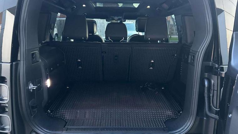 11.4" touchscreen, 360 degree parking aid, 3D Surround Camera with 360 View, 180 Rear View, Front Traffic Detection, Forward Vehicle Guidance, Tow Hitch Assist and clear sight Ground View, Adaptive cruise control, Android Auto, Apple CarPlay, Assisted tailgate with soft close, Blind spot assist, Bluetooth system, Brake pad wear indicator, Clear exit monitor, Connected navigation pro, Driver condition monitor, Electric power assisted steering (EPAS), Head up Display, Lane keep assist, Push button start, Rear collision monitor, Rear traffic monitor, Traffic sign recognition with adaptive speed limiter, Trip computer, Wade Sensing, 7 kW onboard charger, 8 speed automatic transmission, AC/DC charging, Adaptive dynamics, All terrain progress control, All wheel drive system, Configurable Terrain Response, Electronic active differential with brake torque vectoring, Electronic air suspension, Home charging cable mode 2 basic, Public charging cable, Terrain Response 2, Twin speed transfer box, DAB Radio (Digital Audio Broadcasting), Meridian 700w surround sound audio system with 15 speakers, Pivi pro connected, Automatic headlight levelling, Automatic headlights, Centre high mounted stop light, ClearSight interior rear view mirror, Darkened LED tail lights, Electric heated/power fold door mirrors with approach lights and auto dimming driver side, Electric windows with one touch open/close and anti-trap, Follow me home lighting, Front fog lights, Heated rear window with timer, Heated windscreen, Illuminated metal treadplates with brand name script, Matrix LED headlights with signature DRL, Privacy glass, Puddle lights, Rain sensing windscreen wipers, Rear fog lights, Rear side wing doors, Rear wiper, Side hinged tailgate, Solar attenuating windscreen, Trailer stability assist, X badge, 12V power socket in loadspace, 14 way heated and cooled electric adjustable memory front seats with 4 way manual headrests, 3 seat bench in 2nd row, 40:20:40 folding, heated rear seats with centre armrest, Air quality sensor, Alpine lights, Bright metal pedals, Cabin Air Purification plus, Domestic plug socket, Durable rubber cabin flooring, Durable rubber loadspace flooring, Ebony morzine headlining, Electric reach + rake adjustable steering column, Extended leather upgrade, Footwell lights, Front passenger isofix child seat attachment, Heated steering wheel, Loadspace cover, Loadspace Hook, Multifunction steering wheel, Overhead stowage for sunglasses, Premium cabin lighting, Rear headrests, Rear ISOFIX, Rear reading lights, Single front passenger seat, Standard seat configuration, Storage glovebox, Sunvisors with illuminated vanity mirrors, Three zone climate control, Twin front cupholders with cover, Online pack with data plan - Defender, 5 x 3 point seatbelts, ABS, Brake hold function, Cornering brake control (CBC), Cross car beam in dark grey powder coat brushed finish, Customer configurable autolock, DSC - Dynamic Stability Control, EBD - Electronic brakeforce distribution, Electric parking brake (EPB), Emergency brake assist, Emergency braking, ESP + traction control, Front airbags with passenger seat occupant detector, HDC - Hill descent control, Hill launch assist, Low traction launch, Power operated child locks, Remote for (e-Call, Optimised assistance call, InControl app, Climate, beep and flash and door), RSC - Roll stability control, Seat belt reminder, TPMS (Tyre pressure monitoring system), Alarm, Immobiliser, Intrusion sensor, Keyless entry, Locking wheel nuts,
