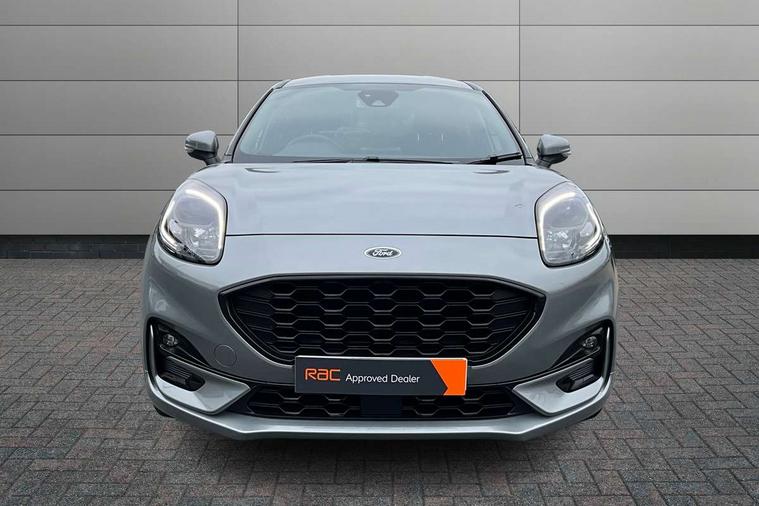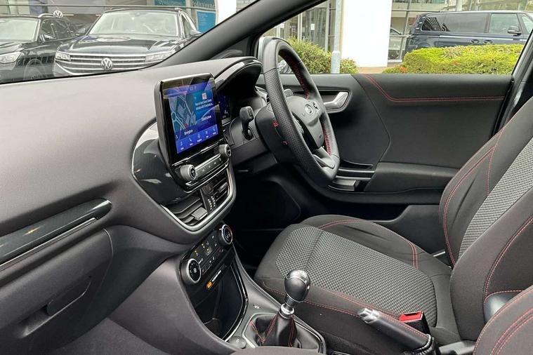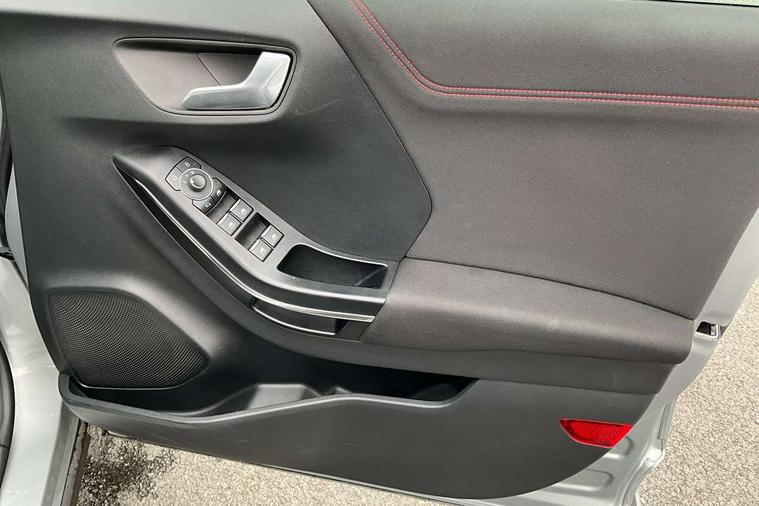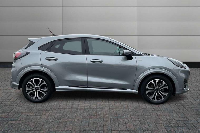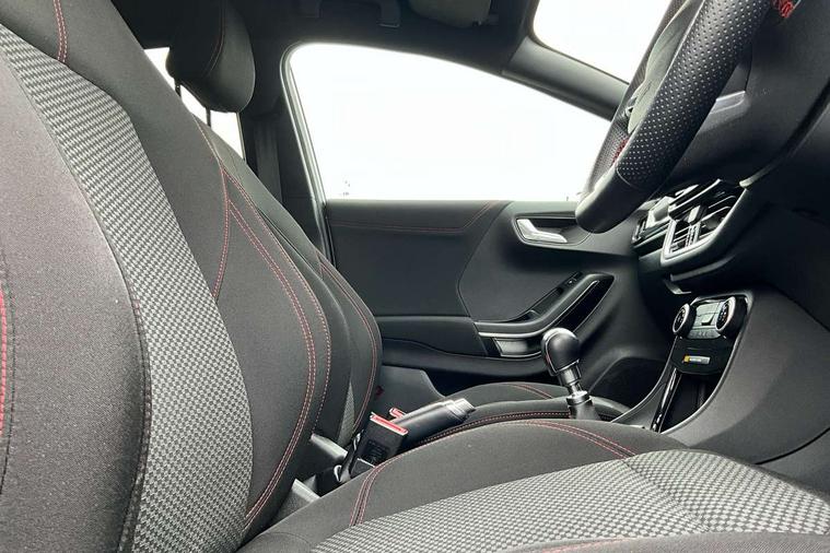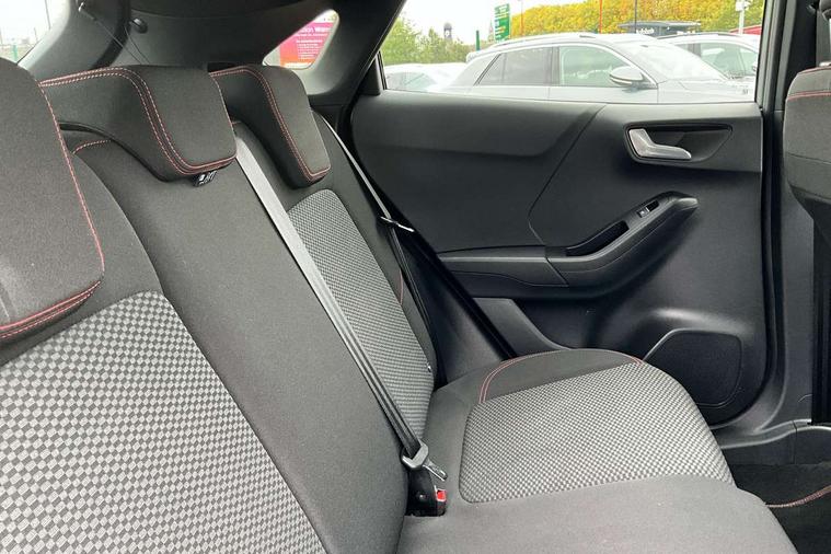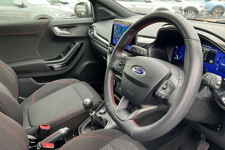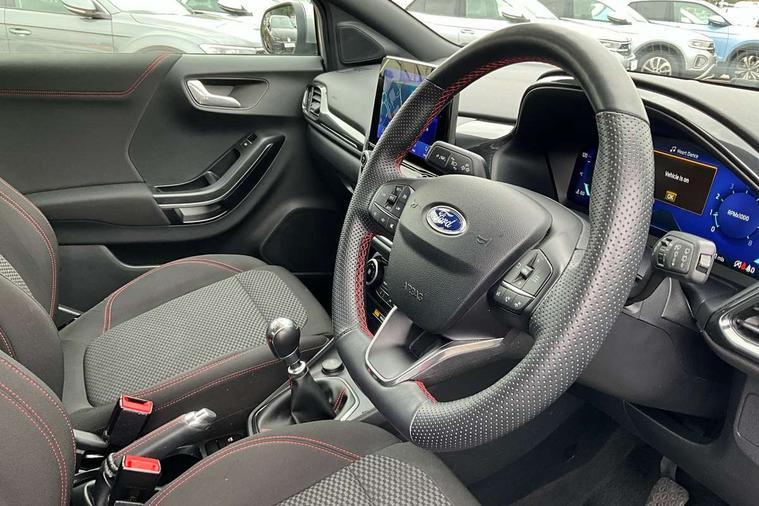 Driver impairment monitor, Emergency call service, Ford easy fuel, Full digital 12.3" instrument cluster, Lane keeping aid with lane departure warning, Power assist steering, Power start button, Rear parking sensor, Selectable drive modes(Normal, sport, Eco, trail, slippery), Speed sign recognition, Sport suspension, Automatic headlights with auto high beam, Automatic rain sensing wipers, LED rear lamps, Power foldable heated door mirrors with puddle lamps, Projector headlamps with LED day time running lights and front fog lamps, Quickclear heated windscreen, Rear side wing doors, Rear wiper, ST-Line body styling kit with unique grille, Third brake light, 3 seat bench in 2nd row, Centre console with armrest and stowage, Ford megabox extended bootspace, Front and rear head restraints, Front floor mats, Manual 2 way passenger seat adjustment, Manual 4 way driver seat adjust with lumbar adjustment, Single front passenger seat, ST- Line cloth trim with red stitching, ST-Line flat bottomed sensico leather steering wheel with leather handbrake and aluminium gear knob, Ford SYNC 3 navigation pack - Puma, 3 rear seatbelts, Child safety lock, Electronic stability control (ESC) and hill start assist, Pedestrian/cyclist detection & post-collision braking, Pre collision assist system, Tyre pressure monitoring system (TPMS), Thatcham alarm,