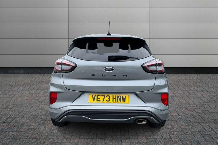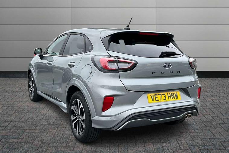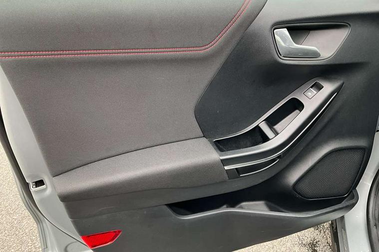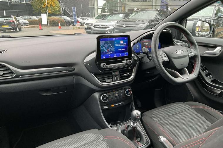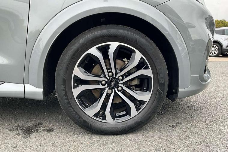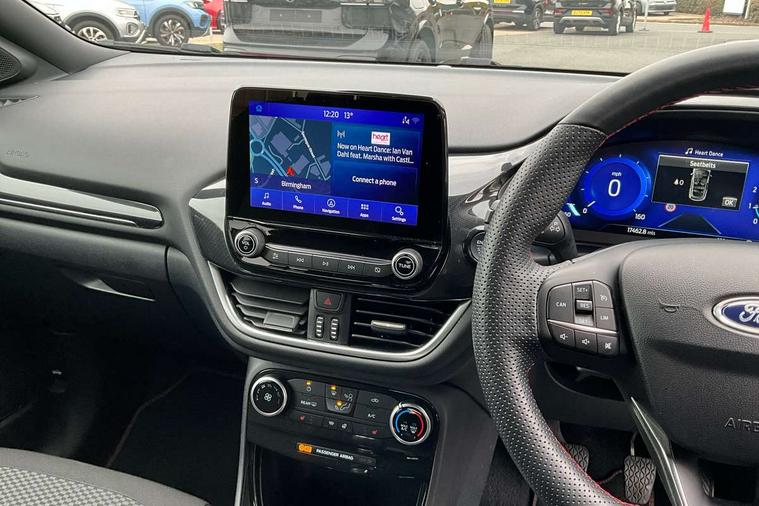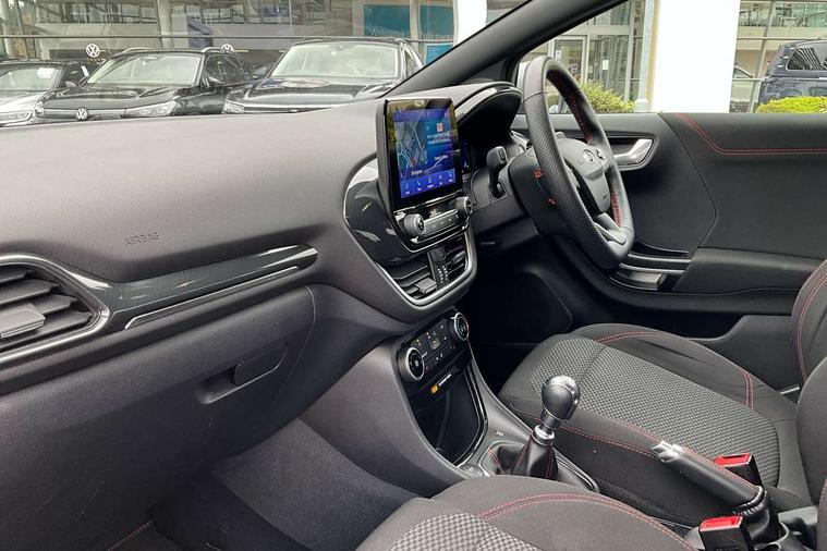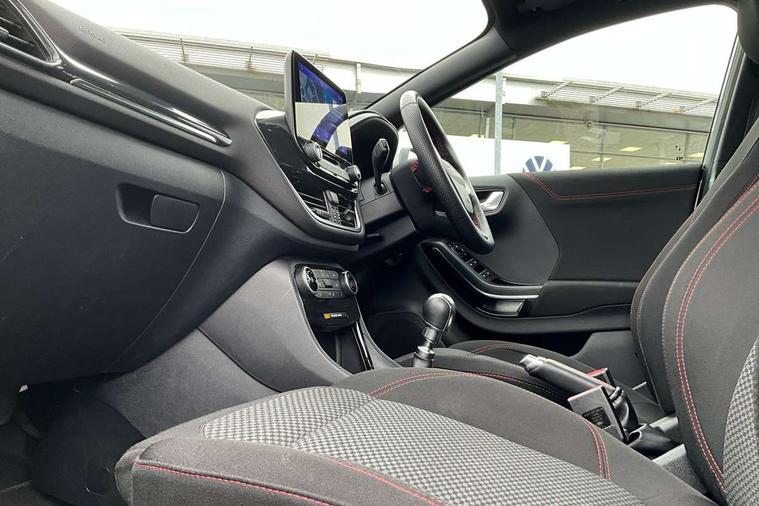 Driver impairment monitor, Emergency call service, Ford easy fuel, Full digital 12.3" instrument cluster, Lane keeping aid with lane departure warning, Power assist steering, Power start button, Rear parking sensor, Selectable drive modes(Normal, sport, Eco, trail, slippery), Speed sign recognition, Sport suspension, Automatic headlights with auto high beam, Automatic rain sensing wipers, LED rear lamps, Power foldable heated door mirrors with puddle lamps, Projector headlamps with LED day time running lights and front fog lamps, Quickclear heated windscreen, Rear side wing doors, Rear wiper, ST-Line body styling kit with unique grille, Third brake light, 3 seat bench in 2nd row, Centre console with armrest and stowage, Ford megabox extended bootspace, Front and rear head restraints, Front floor mats, Manual 2 way passenger seat adjustment, Manual 4 way driver seat adjust with lumbar adjustment, Single front passenger seat, ST- Line cloth trim with red stitching, ST-Line flat bottomed sensico leather steering wheel with leather handbrake and aluminium gear knob, Ford SYNC 3 navigation pack - Puma, 3 rear seatbelts, Child safety lock, Electronic stability control (ESC) and hill start assist, Pedestrian/cyclist detection & post-collision braking, Pre collision assist system, Tyre pressure monitoring system (TPMS), Thatcham alarm,