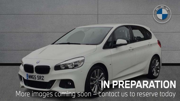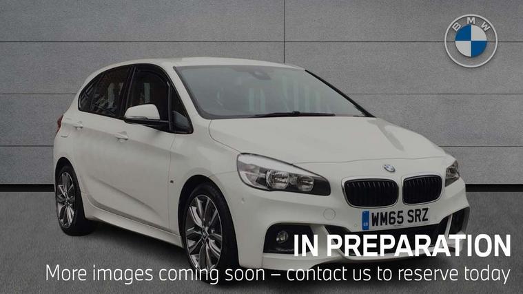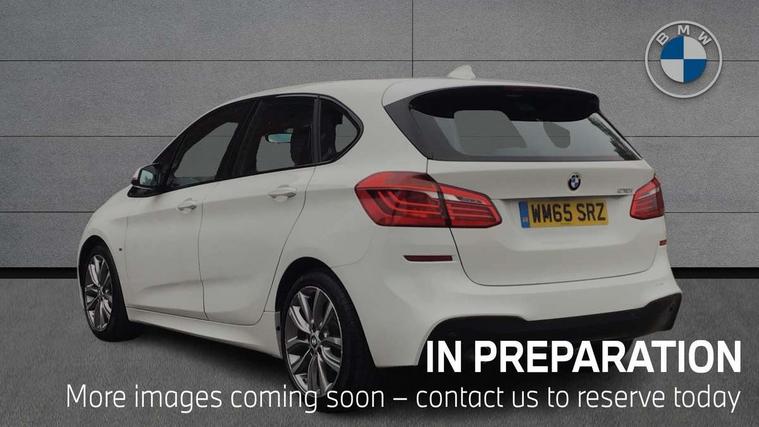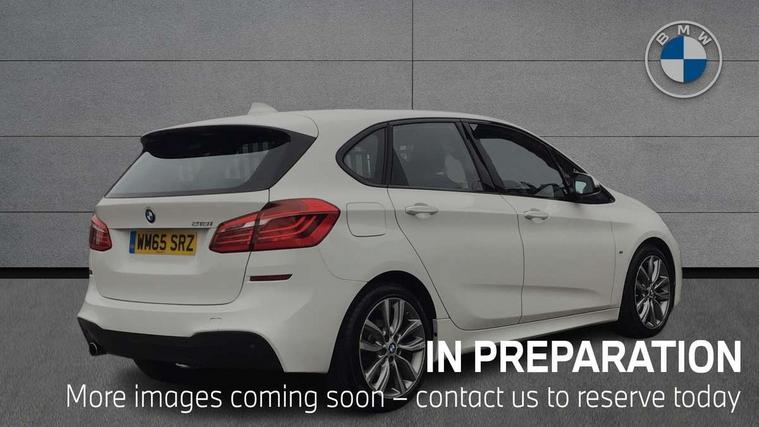 Automatic tailgate operation, BMW Teleservices, Check control system, Forward collision warning, Lights on warning, Oil temperature gauge, On board computer, Outside temperature display, Personal Profile, Rear parking distance control, Service interval indicator, Speed limiter, Stop/start button, Drive Performance Control, Electronic differential lock, Auxiliary point for auxiliary devices, Bluetooth audio streaming, BMW professional radio/CD/MP3, DAB Digital radio, Body colour bumpers, Body colour door handles, Body colour door mirrors, Body colour roof mouldings, Chrome exhaust tailpipe, Chrome kidney grille with black vertical slats, Door mirror integrated indicators, Door sill finishers, Electric adjustable heated door mirrors, Electric front windows/one touch facility, Follow me home headlights, Front fog lights, Heat insulating tinted glass, Heated windscreen washer jets, High beam assistant, LED daytime running lights, M aerodynamic body styling, Rain sensor including auto headlights activation, Rear wiper, Welcome lighting, 12V sockets in front centre console and passenger footwell, 3 rear headrests, 3 spoke leather M sport multifunction sports steering wheel, 4 grab handles, 40:20:40 split folding rear bench seat, Anthracite headlining, Anthracite Velour floor mats, Dakota leather upholstery, Dual zone automatic air conditioning, Front armrest, Front cupholders x 2, Front head restraints, Front sports seats with electric side bolster adjustment, Front/rear armrests within door panels, Glovebox with lid, Isofix front passenger and rear seat preparation, Luggage compartment lighting, Reach + rake adjustable steering column, Rear centre armrest, Sliding rear seats, Sunvisors, Sunvisors with vanity mirrors, Extended storage pack - 2 Series Active Tourer, 3 point seatbelts on all seats, ABS, BMW emergency call, Brake assist function, Childproof rear door locks, Collision mitigation braking system, Crash Sensor - activates hazard/interior lighting + unlocks doors, Driver/Front Passenger airbags, DSC+, Dynamic Traction Control - DTC, Front and rear curtain airbags, Front passenger airbag deactivation, Front seatbelt force limiters, Front seatbelt pretensioner, Front side airbags, Hill start assist, Seatbelt warning, Side impact protection, Tyre pressure monitoring system, Warning triangle and first aid kit, Electronic immobiliser, Key integrated remote control central locking, Locking wheel bolts, Remote control Thatcham category 1 alarm, 18" M sport light alloy wheels - style 486, Low rolling resistance tyres,