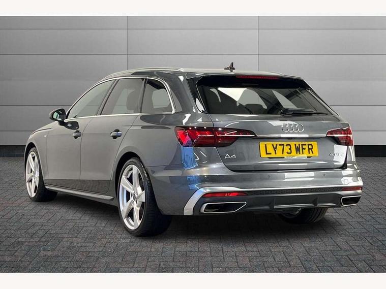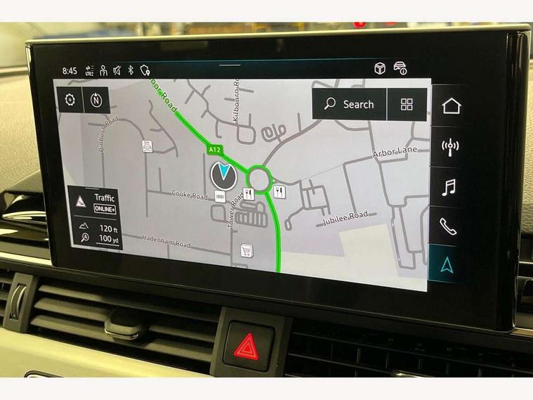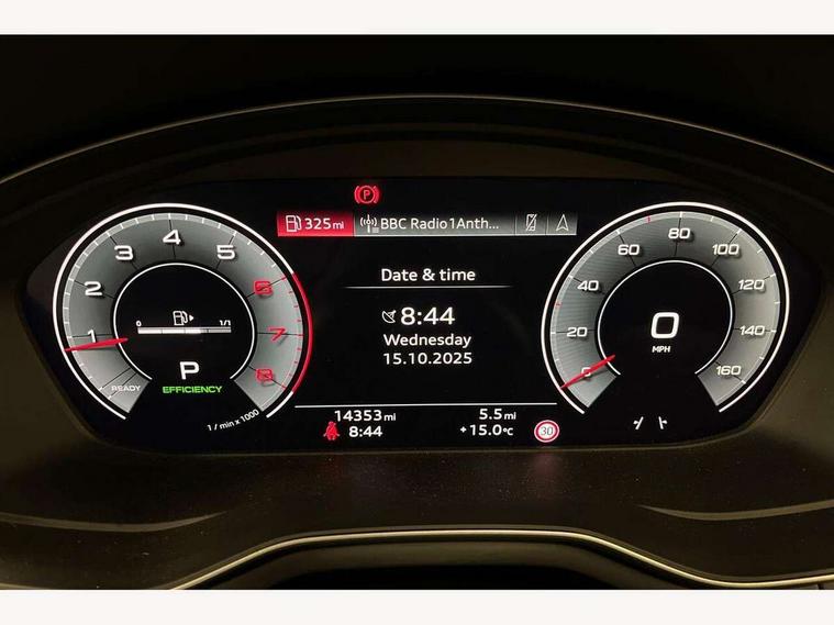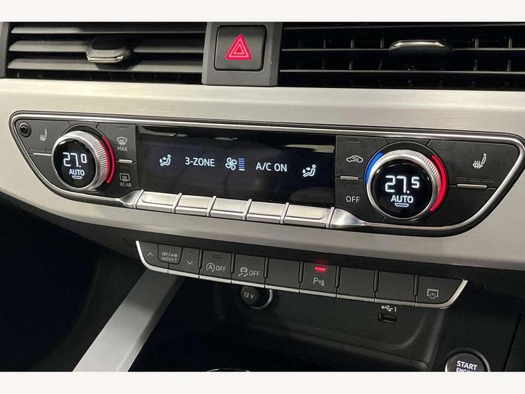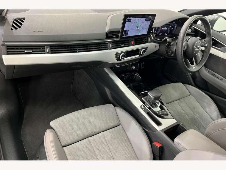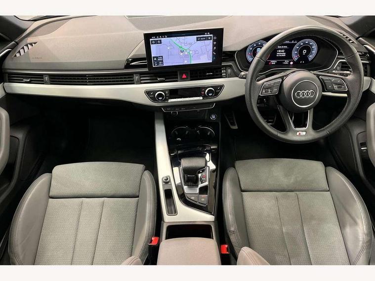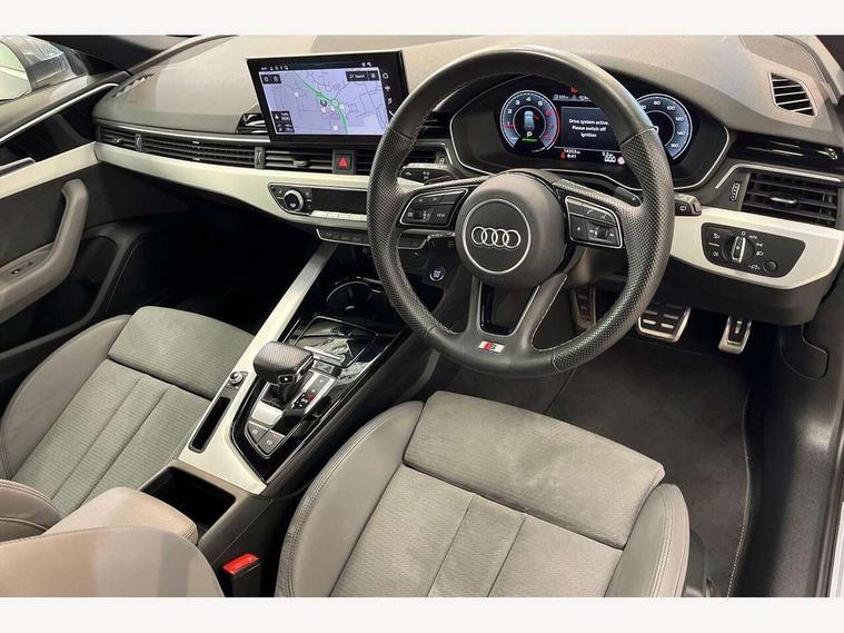 Audi connect safety and service (e-call), Audi drive select, Audi smartphone interface, Audi virtual cockpit, Automatic start-stop system with coasting functionality and efficiency programme, Bluetooth interface, Camera based traffic sign recognition, Electromechanical power steering, Email, calendar and text messages displayed via MMI, Front and rear parking sensors, Lane departure warning, MMI Navigation plus with MMI touch includes 10.1" high resolution colour MMI display, 3D map, Power operated tailgate, Rear view camera, Voice control system, 54 litre fuel tank, Sports suspension lowered by 23mm, 2 USB charging ports, 8 passive loudspeakers, DAB digital radio reception, Aluminium roof rails, Auto dimming rear view mirror, Body colour door handles, Body colour front spoiler lip, Body colour side sill trim, Body coloured door mirrors, Electric adjustable/heated/folding door mirrors with auto dimming, Grained matt black side air inlets with matt aluminium silver inlay, High beam assistant, Honeycomb structure radiator grille in grained matt black, LED headlights with LED rear lights + dynamic rear indicators + headlight adjustment and high beam, turning light + LED daytime running lights, LED third brake light, Matt aluminium silver tailpipe trim, Privacy glass, Rain and light sensors, Rear side wing doors, Rear wiper, S Line badges on the front wings, S line front and rear bumpers with side skirts, S Line rear diffuser in matt anthracite black with trim strip in matt aluminium silver, S Line roof edge spoiler, Variable intermittent front wash/wipe, Windscreen with acoustic glazing, 3 spoke high multi-function sports leather steering wheel grips in perforated leather with S badging including paddle shift, 4 way electric lumbar support for driver and front passenger, 40/20/40 split folding 3 rear seat bench in 3 parts with rear centre armrest, Black carpets, Black cloth headlining, Black perforated leather gearknob, Contrast stitching on seats, steering wheel and gear lever gaiter, Deluxe 3 zone electronic climate control, Electric load area cover, Front and rear head restraints, Front centre armrest, Heated front seats, Illuminated door sill trims with S logo, ISOFIX child seat mounting and top tether, Manual seat adjustment, Single front passenger seat, Stainless steel pedals and foot rest, High gloss package - A4, LED Interior light pack - A4/S4, 3 rear seatbelts, 6 airbags - Driver, front passenger, curtain and side windows, Attention and drowsiness assist, Electronic Stabilisation Control (ESC) including ABS, ASR and EDL, Hill hold assist, Multi collision brake assist, Pop-up bonnet for pedestrian protection, Pre sense city, Rear door child safety locks, Seatbelt monitoring, Warning triangle and first aid kit, Anti theft alarm, Anti theft wheel bolts, Central locking, Keyless Go, Matt brushed aluminium inlays, Tool kit, Tyre repair kit,