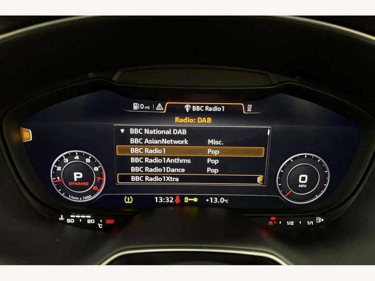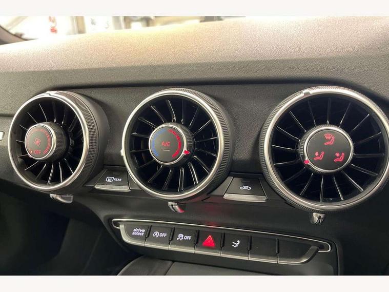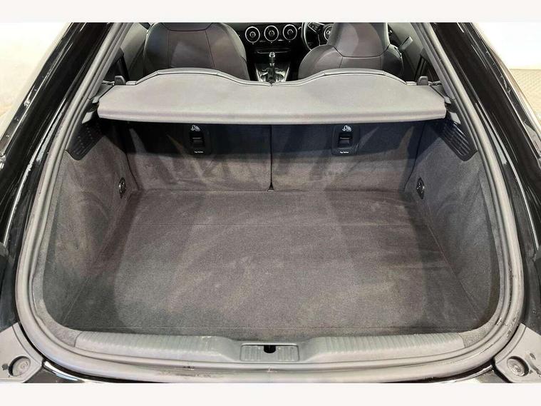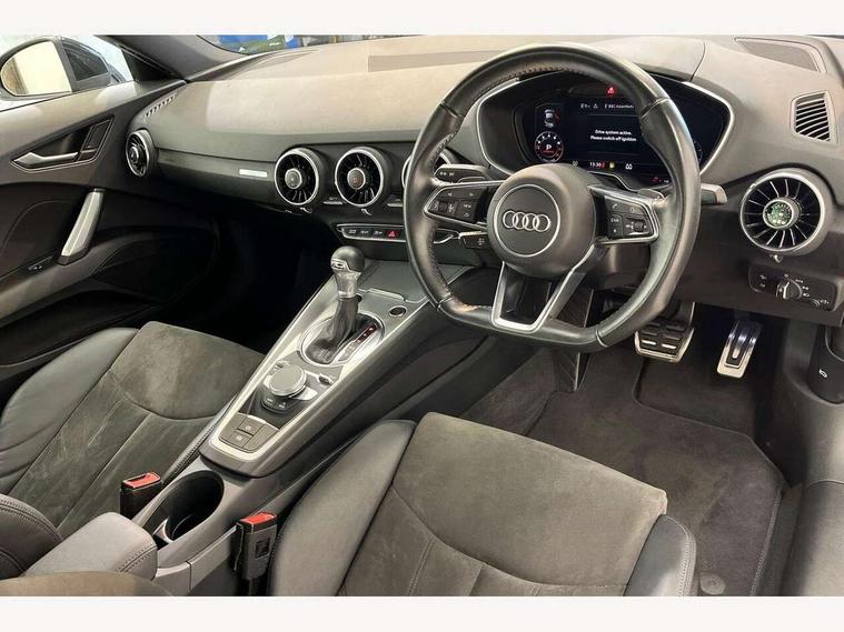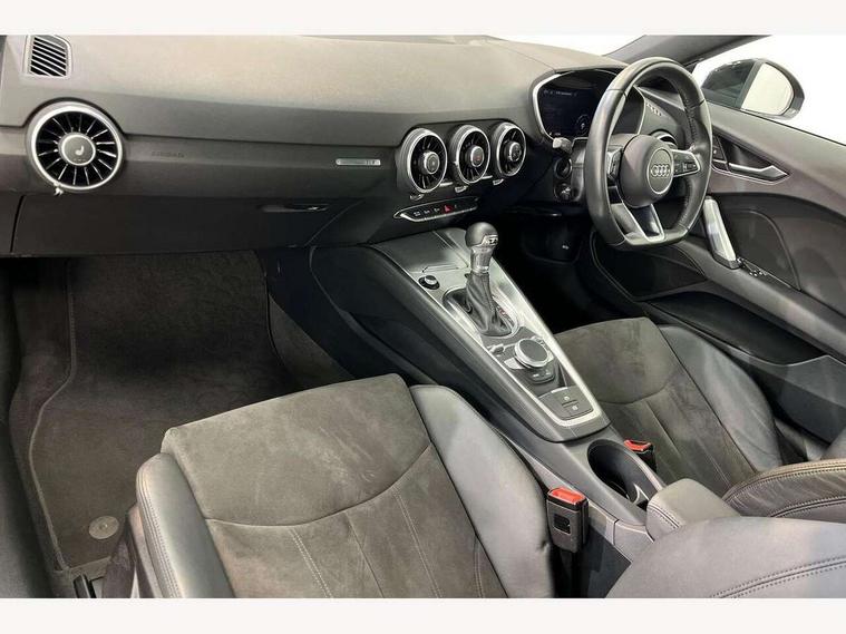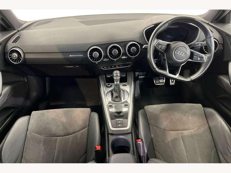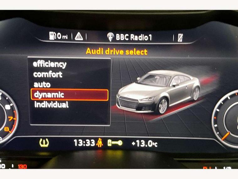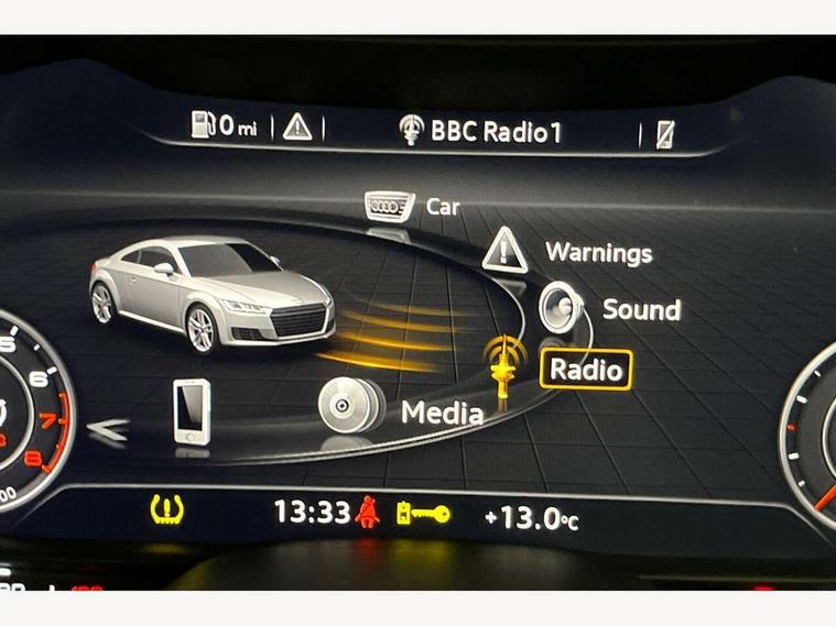 Audi drive select with 4 Pre configured modes, Audi smartphone interface, Audi virtual cockpit - 12.3" high-resolution LCD display with fully customisable instrument cluster, Cruise control + speed limiter, MMI touch panel, Mobile phone preparation with bluetooth interface, Progressive power assisted steering, Service interval indicator, Start/Stop system with energy recuperation, TP memo, Sports suspension, AM/FM radio, Bluetooth audio streaming, DAB Digital radio, MMI Radio with CD player and SD/XC card slot, Auto dimming rear view mirror, Body colour bumpers, Body colour electrically adjustable and heated door mirrors with built in LED side indicators, Electric folding door mirrors, Electric front windows, Front fog lights, Green tinted heat insulating glass, Light and rain sensors, Retractable rear boot spoiler, Sunband for windscreen, Xenon headlights with LED daytime running lights with automatic headline range control + LED rear lights, brake lights and rear indicators, 12V socket, 3 spoke flat bottomed high multi-function leather sport steering wheel with gearshift paddles, Alcantara/Leather upholstery includes seat centre panels, door trim inserts in black Alcantara with side bolsters, head restraints in black leather, Aluminium door sill trims, Front centre armrest, Front sports seats, Heated front seats, Height adjustable driver's seat, Height adjustable front head restraints, Height/reach adjust steering wheel, ISOFIX child seat mounting for front passenger seat with airbag deactivation, Rear head restraints, Rear top tether child seat ISOFIX attachment, Split folding rear seat, Non smoking pack - TT/TT RS, 3 point front seat belts, ABS, ASR traction control, Curtain airbags, Driver and front passenger airbag with front passenger airbag deactivation, EDL traction control, Electromechanical parking brake, ESP, First aid kit, Front side airbags, Head airbags, Hill hold assist, Seatbelt warning, Tyre pressure loss indicator, Warning triangle, Anti theft alarm, Anti theft wheel bolts, Immobiliser, Keyless Go, Remote central locking, Aluminium design inlays, Tool kit, Tyre repair kit,
