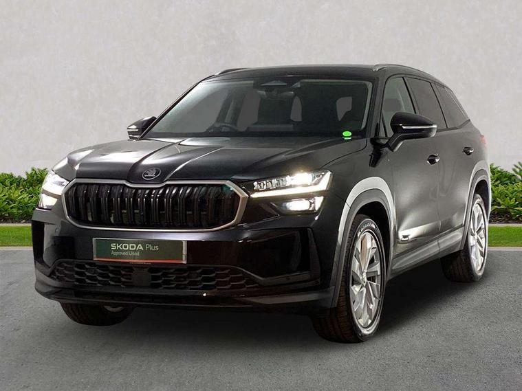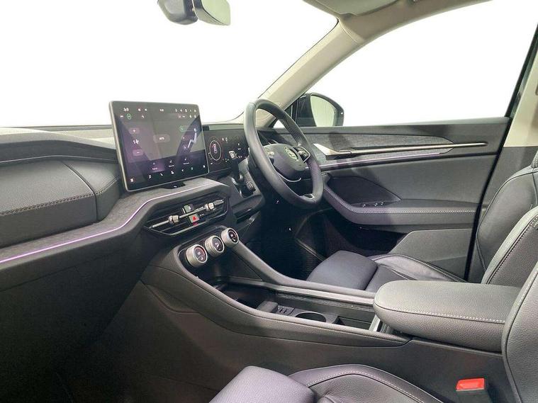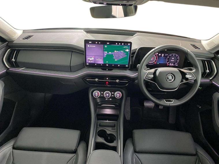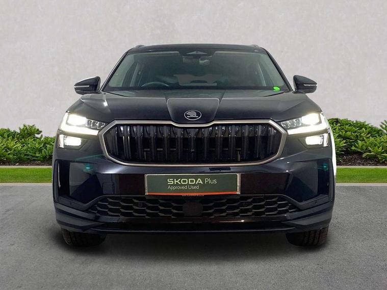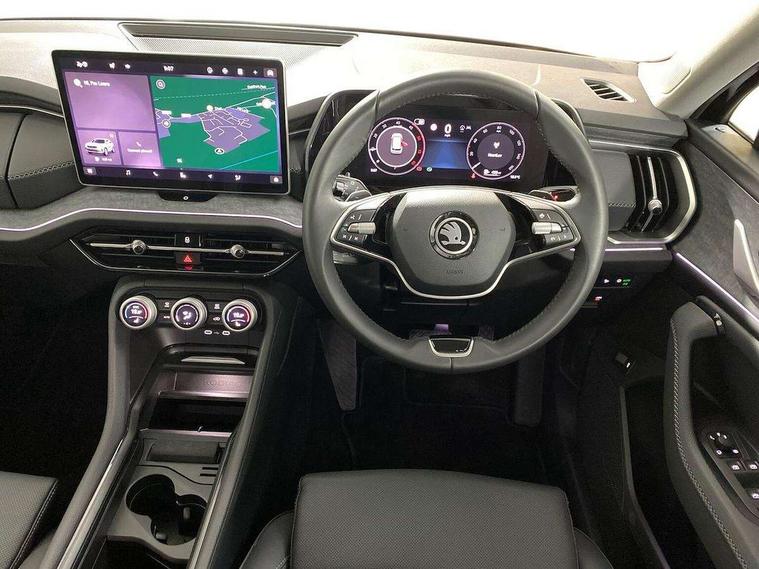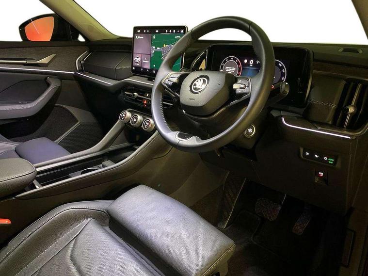 13" satellite navigation touchscreen display, Blind spot detection with door exit warning, Bluetooth system, Drive mode selector, Driver alert with fatigue sensor, Driver drowsiness alert system, Dry display cleaner, e call+, Front cross traffic assist, Lane assist, PAS, Rear traffic assist, Tailgate unlocking from outside, Traffic sign recognition, USB C Port x 2 in front centre console, Virtual Cockpit - 10.25" digital display, Voice control system, Wireless charging for two smartphones (15W) with cooling function, Wireless SmartLink for Apple CarPlay and Android Auto, Stop/start function, 2x USB-C in the rear, DAB Digital radio, Aero front windscreen wipers with intermittent function, Auto dimming rear view mirror, Black wheel arch surrounds, Body colour bumpers, Body colour door mirrors and handles, Cornering light and poor weather light, Electric folding /adjustable/separted heated/folding door mirrors, auto dimming with boarding sports and memory function, Electric front and rear windows, Heat insulating glass in windshield, Heated rear window, Ice scraper in fuel tank cap, Invisible tailpipe, LED daytime running lights, LED rear fog light, LED third brake light in rear spoiler, Light assistant with automatic headlight control and coming home feature, Logo projection in door mirrors, Privacy glass, Rear side wing doors, Rear spoiler, Rear window wiper, Safety reflectors on front and rear doors, Window control switches with black trim, Windscreen wipers with rain sensor, Without engine designation, 1.5l bottle holder points in all door, 12V socket in boot, 1x centre rear reading light, 2 seat bench in 3rd row, 3 configurable smart dials with 32mm coloured display, 3 seat bench in 2nd row, 4 foldable roof handles with rear coat hooks, Automatic gear selector on steering wheel, Chrome interior door handles, Driver/front passenger reading lights, Fabric headlining, Fixed bench 40:60:40 split folding backrests, Front and rear floor mats, Front centre armrest with jumbo box storage compartment, cup holder and 12V socket, Front courtesy lights, Height adjustable front headrests, Interior ambient lighting, Isofix child seat fittings in outer rear seats and front passenger with top tether, Manually adjustable steering column, Pollen filter, Rear centre armrest with cupholders, Rear seat boot backrest release, Retractable luggage compartment cover, Single front passenger seat, Sliding trunk cover, Small Bags on the inner sides of the front backrests, Storage pocket including mobile phone pockets on the backs of the front seats, Sunvisors with illuminated vanity mirrors, Three rear height adjustable headrests, Ticket holder on A Pillar, Tri zone climate control, Umbrella in door panel x1 made from sustainable materials, Upper and lower glovebox with card holder and coin compartment, USB C port by rear view mirror for charging only (15W), Exterior styling package - Kodiaq, Auto door release and activation of warning lights in the event of an accident, Driver and front passenger airbag with knee airbag and front passenger airbag deactivation, Electric child locks, Electronic parking brake, ESC (incl. ABS+EMD+MSR+ASR+EDL+HBA+DSR+RBS+ESBS+MCB+TSA+XDS), Front assist with braking reaction to vehicles, pedestrians and cyclists, Front disc brakes, Fuel cut off safety device, Height adjustable front 3 point seatbelts + pretensioners, Hill hold control, Junction assist with automatic emergency braking, Rear disc brakes, Safety vest holder in door, Seat belt reminder for all seats, Three point rear seat belts, Two tone horn, Tyre pressure monitor, Anti-theft wheel bolts, Immobiliser, Remote central locking with 2 keys, Black/grey fabric with green cross stitching on dashboard, Swan feathers grey dashboard and door decorative inserts, Breakdown kit,
