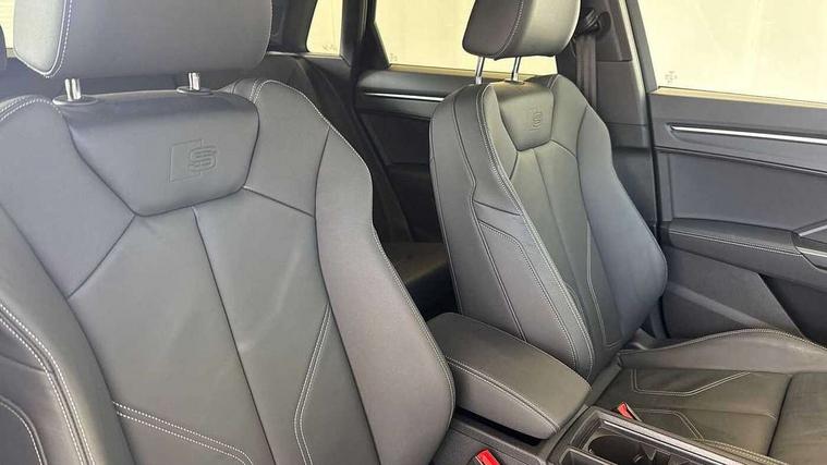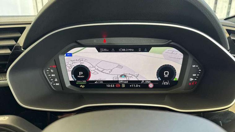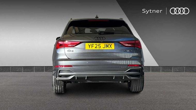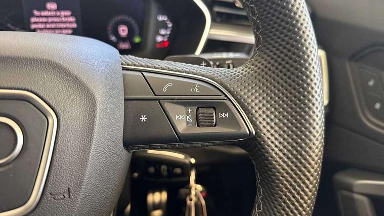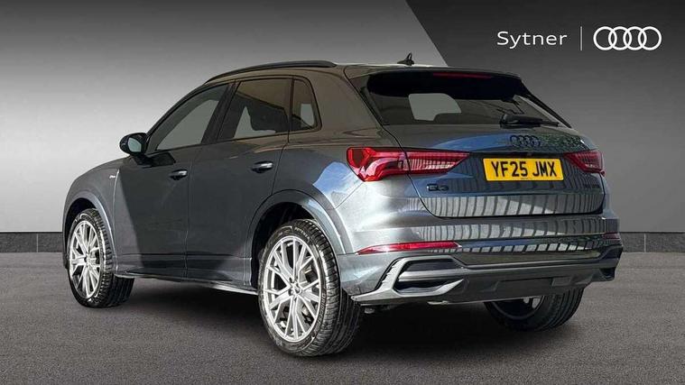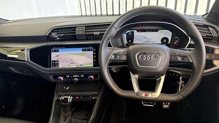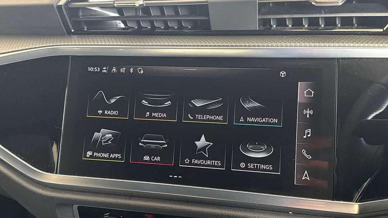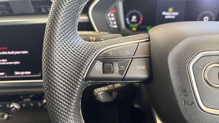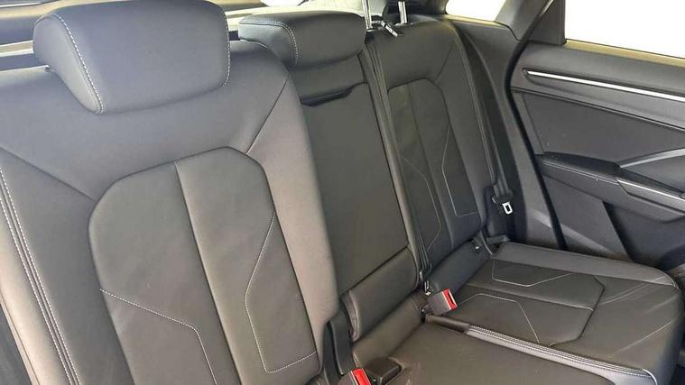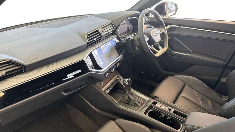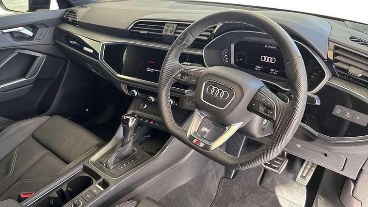 Amazon alexa Integration, Audi connect safety and service, Audi drive select, Audi lane departure warning, Audi Virtual Cockpit - 10.25" display, Bluetooth interface, Camera based traffic sign recognition, Distraction and Fatigue warning, Legal emergency call, MMI Navigation Plus with high resolution 10.1 inch touchscreen colour display, Power operated tailgate, Progressive steering, Service interval indicator, Smartphone interface includes wireless Apple carplay/Android Auto, Start stop system with recuperation, Voice control system with natural language interaction, Sports suspension, 2 USB-C ports with charge and data functions, 6 passive loudspeakers, DAB digital radio module, Acoustic windscreen, Audi Beam uses LEDs to project the Audi logo onto the ground as you exit your Q3, Auto dimming door mirrors, Auto dimming frameless rear view mirror, Black roof rails, Electrically folding, adjustable and heated door mirrors with integrated LED side indicators and kerb view function for passenger side, Front and rear electric windows, Front fog lights, Grille vertical bars in aluminium silver/Matt, High gloss black finish B and C pillars, LED Dynamic rear indicators, LED headlights with LED daytime running lights, LED rear lights, LED third brake light, Privacy glass dark tinted rear and rear-side windows (from B-pillar backwards), Rain and light sensors, Rear diffuser grille in grained matt black, Rear diffuser strip in matt anthracite black, Rear side wing doors, Rear wiper, S line bumpers in contrasting Manhattan grey, Variable front intermittent wipers, 12V socket in rear centre console, 3 seat bench in 2nd row, 40:20:40 folding with manual adjustment for 60:40 forwards/backwards position and backrest angle, Adjustable rear seat bench/backrest with centre armrest and cupholder, Black cloth headlining, Dual zone electronic climate control, Electric lumbar support, Front and rear black floor mats with contrast stitching in rock grey, Front and rear headrests, Front centre armrest, Height and reach adjustable steering wheel, Illuminated door sill trims with S logo, ISOFIX child seat mounting for front passenger with airbag deactivation and outer rear seat including top tether attachment point for outer rear seats, Manual front seats with height adjustment, Perforated leather gearknob, Single front passenger seat, Stainless steel luggage compartment sill finisher, Stainless steel pedals, Twin leather upholstery with front sport seats + S embossing, Black styling pack - Q3, Non smoking pack - Q3, 3x3 point rear seatbelts, 6 airbags - Driver, front passenger, curtain and side windows, Audi pre-sense front with pedestrain and cyclist recognition, Electrically operated child locks on rear doors, Electromechanical parking brake, Electronic stabilisation control including ABS, ASR and EDL, Front seatbelt reminder, Hill descent control, Hill hold assist, Pre sense basic, Seatbelt monitoring, Tyre pressure warning, Warning triangle and first aid kit, Anti theft wheel bolts, Immobiliser, Remote central locking, Thatcham approved category 1 anti theft alarm, Aluminium look interior elements, Detail dashboard around MMI touch colour display in glass look, black with surround in aluminium look, Leatherette door armrest, Piano black inlay,