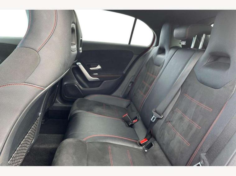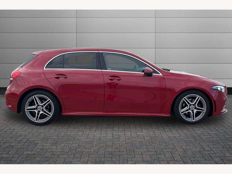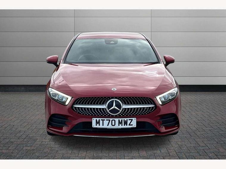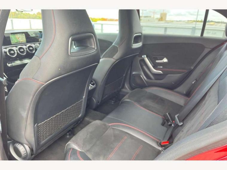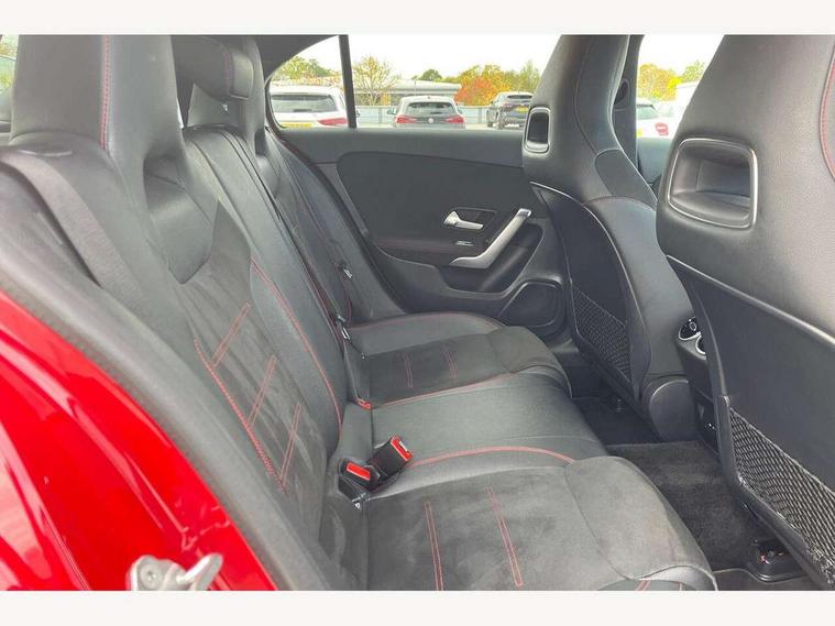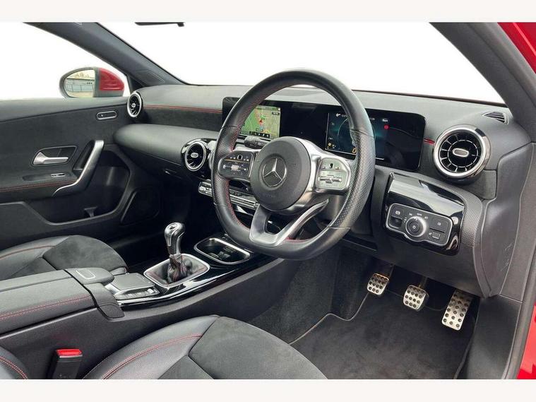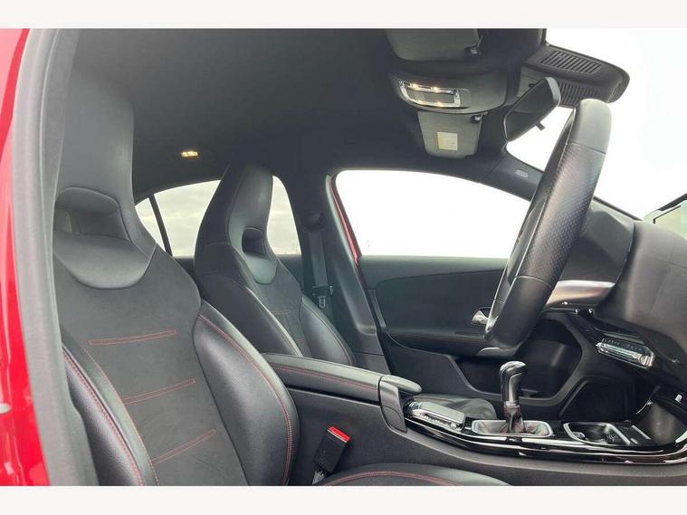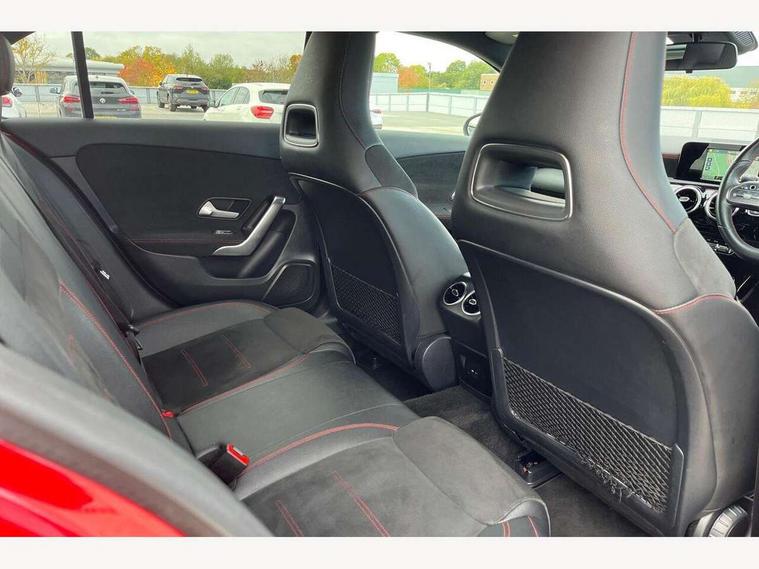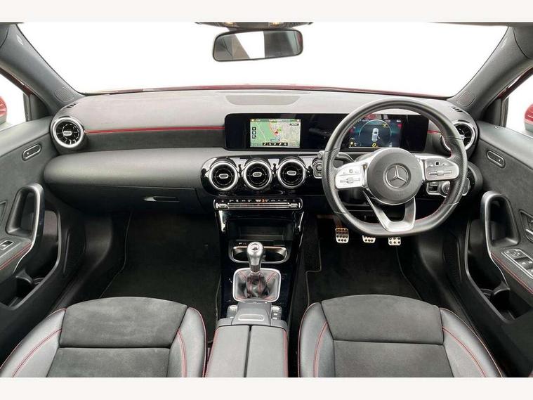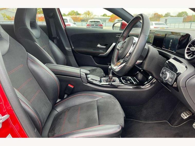180 degree rear view camera with parking guidelines, 7" colour screen in instrument panel, 7" touchscreen media display, Active lane keep assist, Attention assist, Brake pad wear indicator warning light, Car wash mode, Cruise control + speed limiter, Direct steering, Dual bluetooth interfaces, DYNAMIC SELECT with a choice of driving modes (ECO, Comfort, Sport and Individual), ECO start/stop function, Fluid level warning indicator for fuel, oil, coolant and washer fluid, Hard-disk navigation, Hey Mercedes Voice activation, Lamp failure indicator, Mercedes me connect including emergency call system, accident recovery, breakdown and maintenance management, Outside temperature gauge, Owners manual in English, Pre-installation for private car sharing, Pre-installation for Vehicle Monitoring, Pre-installation for Vehicle Setup, Preinstallation for Mercedes Benz link, Service indicator (ASSYST), Speed sensitive power steering, Trip computer, Lowered comfort suspension, Rear axle torsion beam, 2 USB ports (type C) in rear stowage compartment and one in front of center console, 6 speakers, DAB Digital radio, MBUX multimedia system with DAB digital radio and touchpad including satellite navigation, Mercedes-Benz sound system - 100W, 4 Electric Front and Rear windows, Adaptive brake lights, AMG bodystyling - Front apron with splitter in chrome, rear apron with chrome trim and chrome visible trim elements in tailpipe, Black weather strip, Body colour bumpers, Body colour door handles, Body colour side skirt, Body coloured door mirrors, Chrome beltline trim, Diamond radiator grille with chrome pins and silver louvre + chrome insert, Electric adjustable and heated door mirrors with integrated LED side indicators, Exhaust system - Twin visible tailpipes in polished stainless steel, Headlamp assist automatic headlamp activation, Heated glass rear windscreen + timer control, LED high performance headlamps with integrated LED daytime running lights, LED tail lamp, LED third brake light, Privacy glass, Radio aerial, Rain sensing windscreen wipers with two sensitivity settings, Rear fog lights, Rear wiper, Window line trim strip in chrome, 3 Spoke flat bottom leather multi function steering wheel with perforated leather in grip area, 40:20:40 split folding rear seats, Artico man-made leather/Microfibre Dinamica upholstery with red contrast stitching, Auto Mercedes-Benz child seat recognition sensor, Black air vents with surround in silver chrome, Black roof lining, Brushed stainless steel sports pedals with rubber studs, Controller on centre console with chrome surround, Floor mats with stitched edging and AMG lettering, Front centre armrest with storage compartment, Front door sills with Mercedes Benz lettering, Front seat backs luggage nets, Front seat cushion length adjustment, Heated front seats, Height/reach adjustable steering column, Interior mirror with reading lamps in black and frameless, Manual height adjustable front seats, Rear head restraints, Seat occupancy sensor for front passenger seat, Sports seats with integrated headrests, Sunvisors with illuminated vanity mirrors, Touchpad on center console, Twin front cupholders, Two zone thermotronic luxury automatic climate control, Light and sight pack - A Class, Seat comfort pack - A Class, 3 rear 3 point seatbelts, ABS with Brake Assist, Active bonnet, Active brake assist includes forward collision warning system with autonomous braking, Adaptive brake assist with hold function and hill start assist, Black seatbelts, Childproof locks manually operated for rear doors and electrically operated for rear power windows, Crash responsive emergency lighting, Driver and passenger head and side airbags, Drivers knee airbag, Dual stage driver/passenger airbags, Electronic parking brake, ESP curve dynamic assist, ESP with ASR, Front and rear seatbelt reminder, Front brake callipers with Mercedes Benz lettering, ISOFIX and top tether child seat fixing points in two outer rear seats, Tyre pressure monitoring system, Warning triangle and first aid kit, Window airbags, Alarm system/interior protection/immobiliser, Keyless Go, Remote central locking and crash sensor with emergency opening function, Urban guard vehicle protection system with immobiliser and interior protection, Dinamica microfibre trim in black, 18" AMG 5 twin spoke light alloy wheels in titanium grey with highsheen finish, Summer tyres, Tirefit sealant kit,