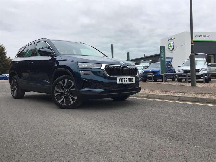 8" Digital display, Care connect, Colour multifunction trip computer, Driver fatigue sensor, Emergency services call system, Outside temperature gauge, Service interval indicator, SmartLink wireless for Apple and wired for Android, Start/stop system with regenerative braking, USB C Port x 2 in front centre console, Diesel particulate filter, 8 Speakers, DAB radio with Bluetooth, USB connection, Acoustic glass, Aero front windscreen wipers with intermittent function, Auto dimming rear view mirror with light and rain sensors, Automatic headlight control system, Black electric window control buttons, Body colour door mirrors and handles, Electric front and rear windows with child proof lock, Heated rear windscreen, LED daytime running lights, LED rear lights with high functionality welcome effect and dynamic indicators, Light assistant (coming/leaving home/tunnel light), Plastic scuff plates, Privacy glass, Rear side wing doors, Rear spoiler, Rear window wiper with washer system and intermittent control, Safety reflectors on front doors, Third brake light, 1.5 litre bottle holders in driver and front passenger door panels, 12V socket in boot, 12v socket in front centre armrest with storage compartment and rear air vents, 2 Folding hooks and nets in boot, 2 spoke leather heated multifunction steering wheel, 2 x Tablet holder, 3 rear height adjustable headrests, 3 seat bench in 2nd row, 4 foldable roof handles with rear coat hooks, Black floor carpet, Chrome inner door handles, Decorative door sills with KAROQ badging, Double sided boot floor, Foldable hooks in the boot, Front head restraints, Height adjustable front three point seats belts with tensioners, Height/reach adjust steering wheel, Ice scraper, Illuminated glovebox, Illuminated luggage compartment, Interior noise suppression, Isofix child seat preparation for front passenger seat, Isofix child seat preparation outer rear, Manual lumbar support for front seats, Pen holder, Pollen filter, Rear boot cover, Rear reading lights, Rubbish bin door, Safety vest holder, Single front passenger seat, Storage box in upper central dashboard closed, Sunvisors with illuminated vanity mirrors, Textile floor mats, Ticket holder, VarioFlex seats with standard rear seat release, Chrome roof rails + chrome pack - Karoq, Parking pack - Karoq, Automatic door unlocking in case of crash, Automatic fuel cut off in case of crash, Child locks on rear doors, Driver airbag, Electronic parking brake with auto hold function, Emergency rear braking signal, ESC including ABS, MSR, ASR, EDS, HBA, DSR, RBS, MKB and traction control, Front side airbags, Hill hold control, Knee airbags, Passenger airbag with switch-off function, Pedestrian monitor, Seatbelt reminder signalisation and pretensioner for all seats, Three point seatbelts rear, Two tone horn, Tyre pressure display, Tyre pressure monitor, Alarm with interior monitoring, back up horn and tilt sensor with safe function, Electronic engine immobiliser, Keyless entry and start/stop, Remote central locking with 2 remote folding keys, Chrome framed air vents, Anti-theft wheel bolts protection, Storage on wheel cover, Tool kit,