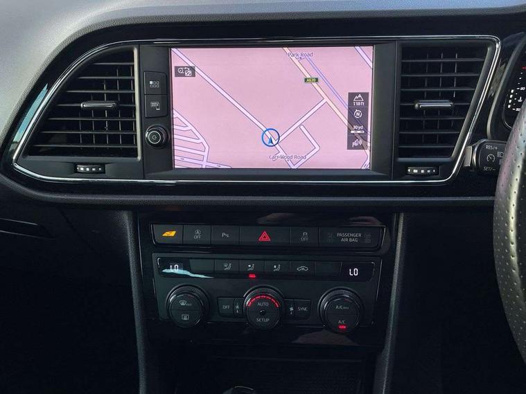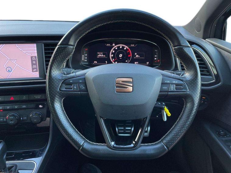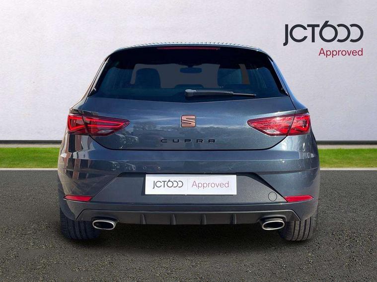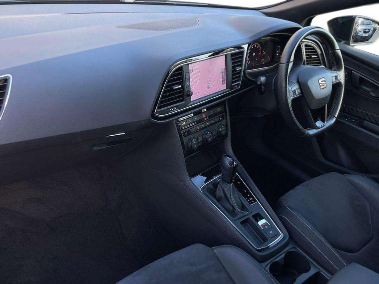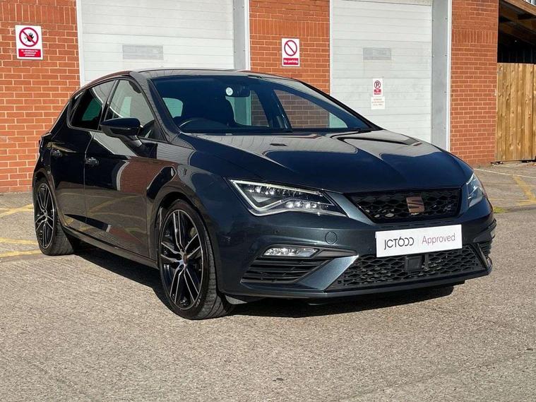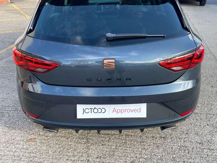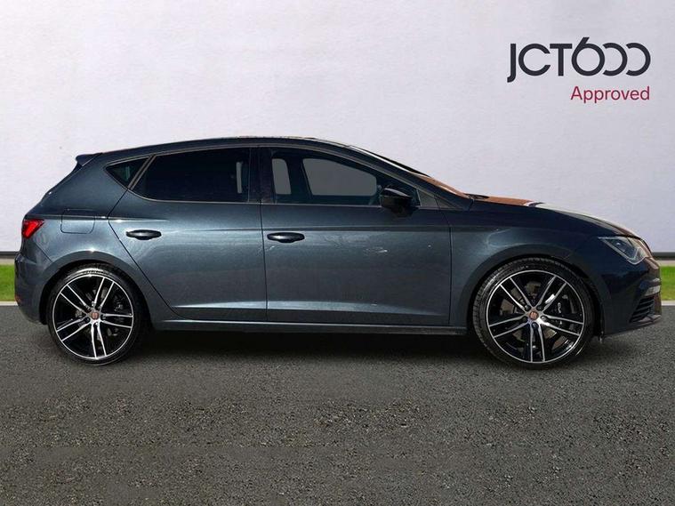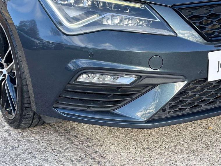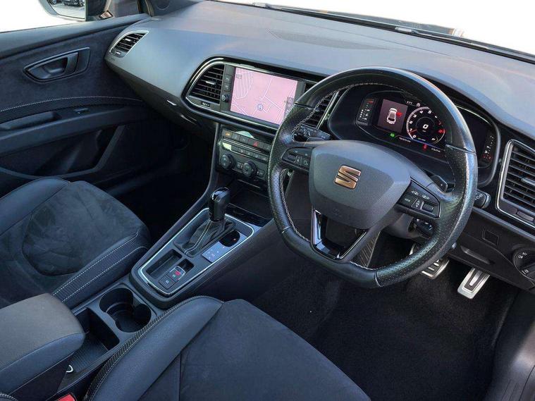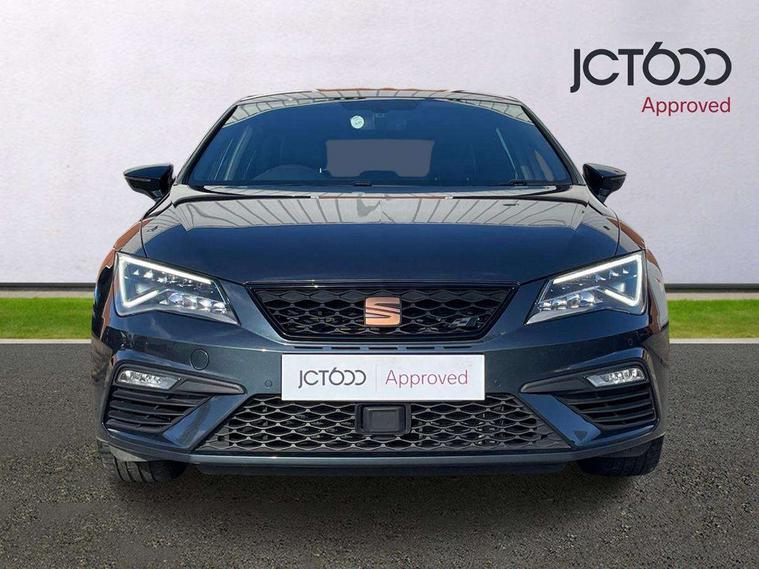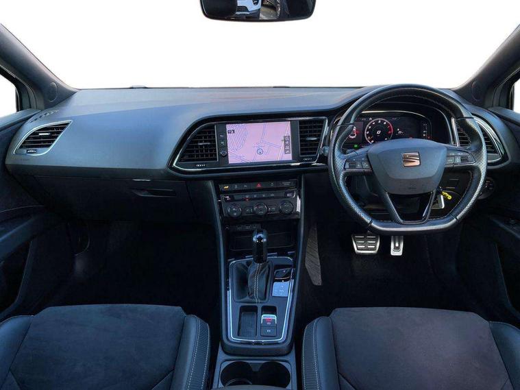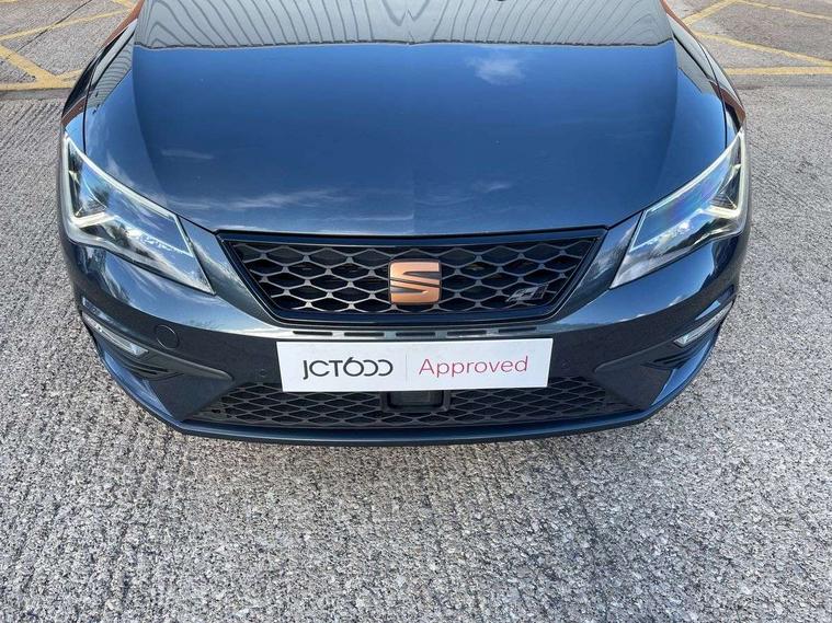 CUPRA performance interface, Digital cockpit, Electro-mechanical progressive power assisted steering, Front and rear parking sensors, Front assist with pedestrian protection, Full Link Smartphone Integration with Mirror Link, Apple Car Play, Google Android Auto with USB Type C cable for Apple and Android compatibility, Media system plus with 8" display, 4 USB, 8 speakers, CD, voice control, DAB, bluetooth and handsfree, steering wheel mounted audio and phone control, Navigation system 3D map display, high resolution colour driver display, two SD card slots, RPM, trip computer, outside temp gauge, instrument light brightness, low fuel warning light, lights on reminder, gearshift indicator, SEAT drive profile CUPRA with 4 mode (Cupra/Normal/Sport/Individual), throttle response, sound actuator and gearshift, SEAT logo boot release, Service interval indicator, Dynamic chassis control, Lowered sports suspension, Auxiliary input socket, SEAT USB media cable, Black front grille, Body colour door handles, Body coloured bumpers, Dark tinted rear windows, Electric folding door mirrors, Electric front/rear windows, Electrically adjustable and heated door mirrors, Exclusive Cupra front and rear bumpers, Full LED headlights with LED day time running lights + LED rear tail lights + LED licence plate lights and LED front and rear fog lights, Gloss black exterior mirrors with integrated LED indicators, Gloss black front grille frame, High gloss black finish B and C pillars, Illuminated aluminium front door sill with CUPRA logo, Rear wash/wipe, Visible dual exhaust pipes, 12v power point in centre console, 60/40 split folding rear seat with armrest, Additional heating and ventilation outlet in rear of centre console, Aluminium pedals, Black interior roof, Boot storage net, Cargo rings in boot, Driver and passenger seat height adjust, Driver and passenger sun visor, covered and illuminated mirror, driver sun visor with card holder, Driver seat lumbar adjustment, Dual zone climate control, Dust/pollen filter, Flat bottomed perforated leather steering wheel with white stitching and CUPRA logo and leather gear knob, Front and rear head restraints, Front centre armrest with storage compartment, Front cupholders x 2, Front passenger seat lumbar adjustment, Front seatback storage pockets, Front sport seats in microsuede, Front/rear floor mats, Height adjustable front and rear headrests and third rear headrest, Height/reach adjust steering wheel, High centre console with integrated box & cup holder, rear air outlet, with armrest in front seats, Interior copper and black detailing, ISOFIX points in outer rear seats with top tether anchorage points, Luggage tie-down hooks, Multi-colour ambient interior lighting, Steering wheel gearshift paddles, Storage box under drivers and passenger seat, Convenience pack+ - Leon, 3 point seatbelts on all rear seats, ABS, traction control system and front differential lock system, Child proof door locks, Driver and front passenger airbags with front passenger airbag de-activation, front side, curtain, driver knee airbags, EBA, Electric handbrake, Electronic parking brake with auto hold, ESC with switch off key, Front and rear black brake calipers with cupra logo, Front seatbelt pretensioners, Front seatbelt reminder, Hill hold control, Multi-Collision braking, Tyre pressure monitoring system, 2 folding remote keys with window open/close function and boot opening/door mirror folding function, Central locking fuel filler cap, Engine immobiliser, Locking wheel bolts, Remote central locking + deadlocks, Volumetric alarm with back up horn, Gloss black interior detailing, 19" Cupra Machined alloy wheels 30/2, Space saver spare wheel,