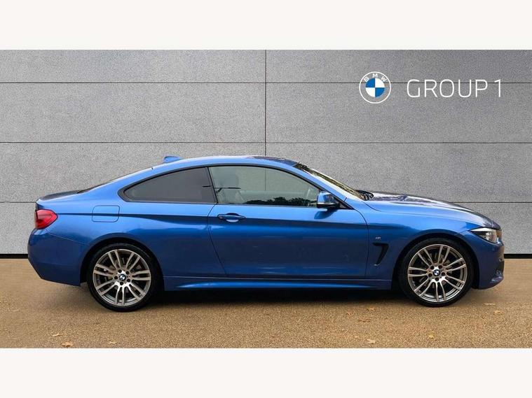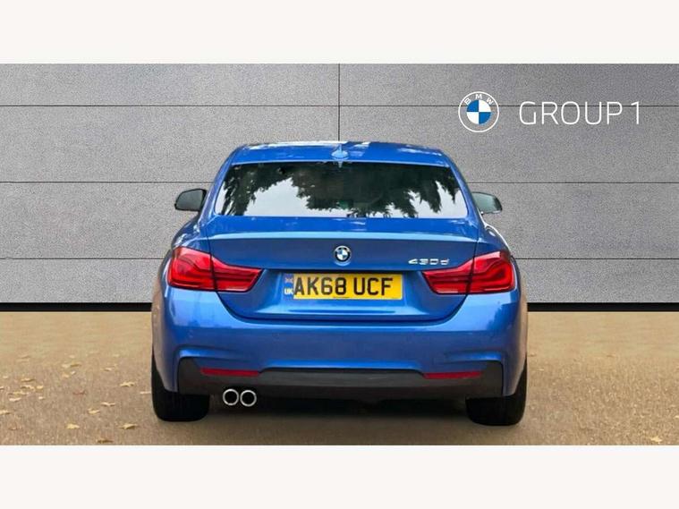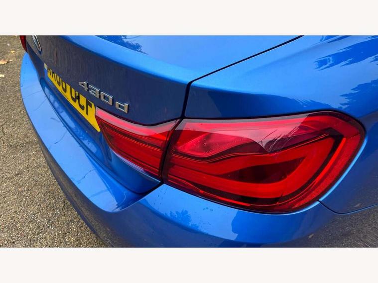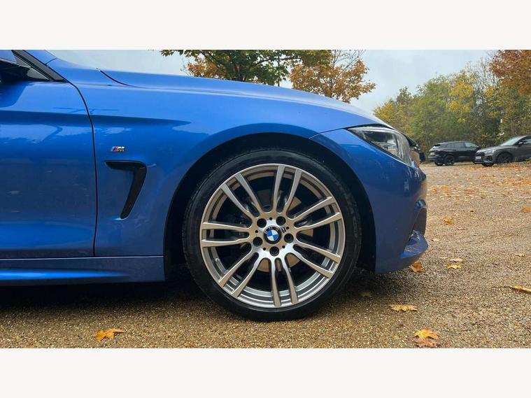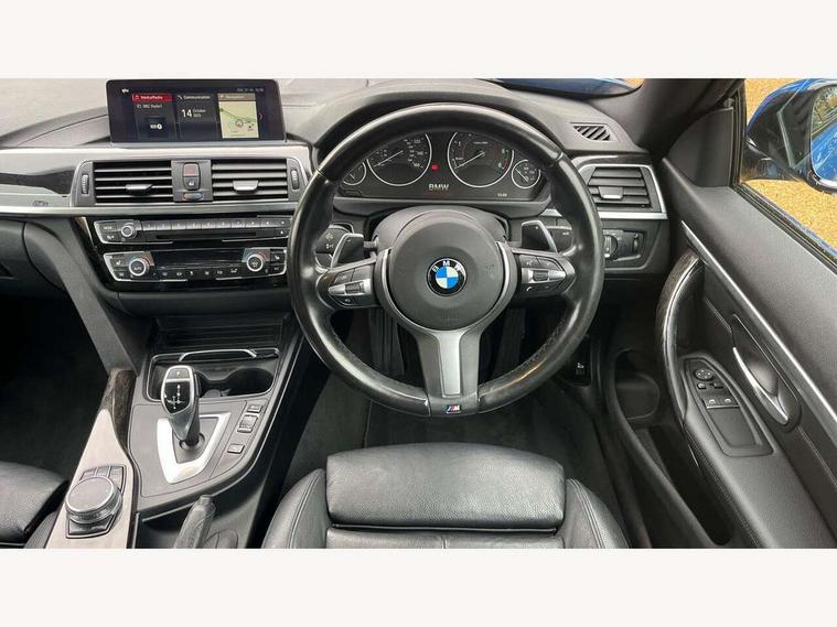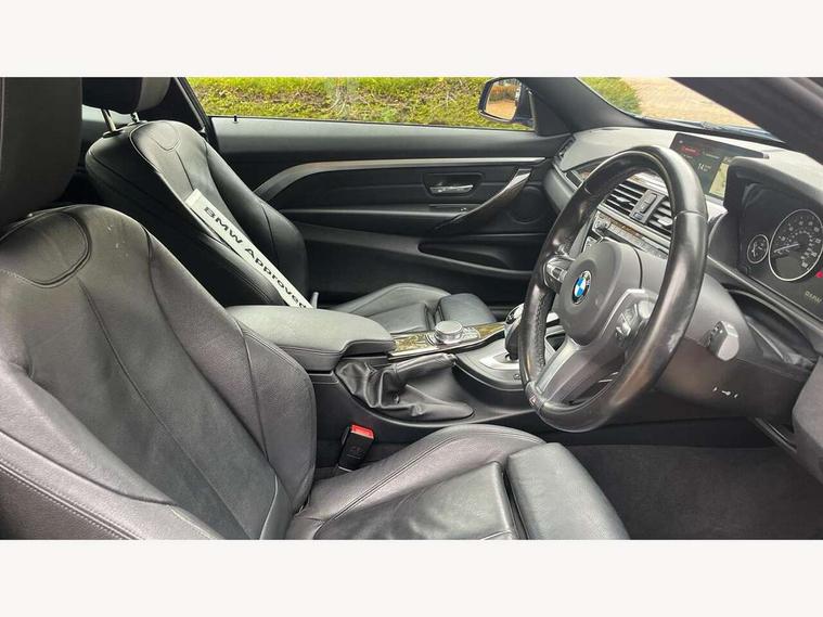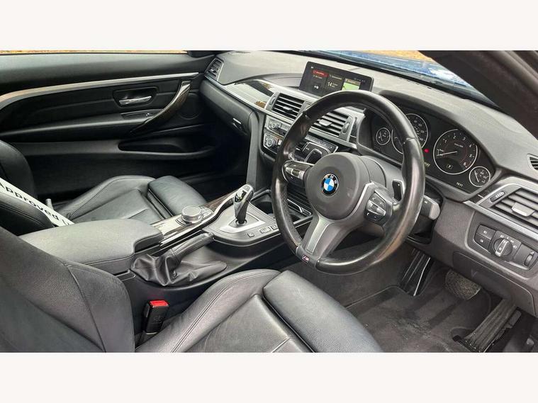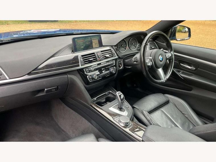 Auto start-stop, BMW Online services, BMW remote services, BMW Teleservices, Brake pad wear indicator warning light, Check Control warning system for monitoring of lights and door/luggage compartment open warning, Control display - 6.5" colour display screen, Front/rear park distance control (PDC), iDrive Controller with 8 favourite buttons, Instrument cluster with speedometer with mph readout, tachometer, fuel gauge and oil temperature gauge, Lights on warning by audio warning signal when ignition is switched off, M Sport instrument cluster, On board computer - average speed, fuel consumption, outside temp display with acoustic warning, clock/date, service interval, odometer/trip meter, Optimum shift indicator, Personal Profile - automatic lock when driving away selectable, Run flat indicator, Aluminium front suspension, Diesel particulate filter, Drive performance control with ECO PRO comfort + sport mode, Electronic differential lock, Five link rear suspension, Incorrect fuelling protection, Sport automatic transmission with steering-wheel mounted gearshift paddles and launch control, DAB tuner, Auto dimming rear view mirror, Body colour door handles, Body colour front bumper, Body colour mirror caps, Body colour roof mouldings, Chrome kidney grille with extra wide black, high gloss black vertical slats, Direction indicator, side repeaters, integrated in exterior mirrors, Door sill finishers with M designation, Dual exhaust tailpipes in left with chrome finisher, Dynamic brake lights, Electric front windows with fingertip open/close + anti-trap facility, Follow me home headlights, Front air inlet with high gloss black finish, Front and rear bumper system, Green tinted heat protection glazing, Heated windscreen washer jets, Heated, electrically adjustable exterior mirror aspheric on driver side, convex on passenger side, High gloss black rear bumper insert, High gloss shadow line, High level third brake light, LED daytime running lights, LED direction indicator lenses, LED eyebrow light, LED front fog lights, LED tail lights with 3D L-shaped LED light design, Lightweight engineering, M aerodynamic bodystyling, M designation side badges, Rain sensor including auto headlights activation, Shark fin antenna, Two speed adjustable intervals windscreen wipers, Visible VIN plate, Welcome lighting, Windscreen with grey shadeband, 12V sockets in front centre console and passenger footwell, 3 spoke leather M sport multifunction sports steering wheel, 4 grab handles, Air conditioning and radio control panel in high gloss black, Anthracite headlining, Automatic air conditioning with two zone control, Chrome centre console panel highlight, Driver and front passenger seat heating, Folding front centre armrest with storage compartment, Folding storage compartment with glasses holder + coin tray, Front and rear side armrests integrated into door trim, Front door storage with bottle holder, Front head restraints, Front sports seats with electric side bolster adjustment, Glove compartment, Integrated rear head restraints, Interior lighting, front centre over interior mirror and rear centre automatic interior light activation when door is opened, ISOFIX child seat preparation+airbag deactivation, Load lashing eyes in luggage compartment, Reach + rake adjustable steering column, Rear centre armrest with 2 cupholders, Rear coded belt buckles, Storage compartment in rear centre console, Sunvisors with vanity mirrors and ticket pocket, Toolkit located in luggage compartment, Two front cup holders with a sliding lid, Velour floor mats, Extended lighting package - 4 Series, Media pack - Professional - 4 Series M Sport, Airbag - Front driver and passenger, front and rear head, front side, curtain head protection, manual deactivation of front passenger airbag possible, Anti lock braking system (ABS) with brake assist, Automatic seat belt handover for driver and front passenger, Automatic Stability Control (ASC), Battery safety cut-off, BMW emergency call, Brake drying, Brake energy regeneration, Brake pretensioning, Cornering brake control (CBC), Crash sensor activating central locking release, hazard warning lights, Dynamic brake control, Dynamic stability control + (DSC+), Dynamic Traction Control - DTC, Front and rear ventilated brake disc, Front seatbelt force limiters, Hill start assistant, Pyrotechnically pre-tensioned front seatbelts, Seat belt security check for driver, Side impact protection, Twin horns, Tyre pressure monitoring with three level warning strategy, Variable torque distribution, Warning triangle and first aid kit, Central locking switch for all doors, fuel filler cap and luggage compartment, Electronic engine immobiliser, Remote control integrated key with blue inset, Start/stop button with Comfort Go keyless engine start and auto Start/stop deactivation button, Thatcham category 1 alarm, Reduced rolling resistance tyres, Run flat tyres,