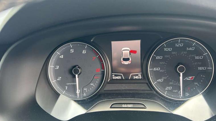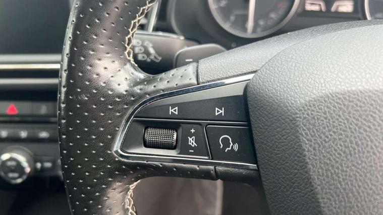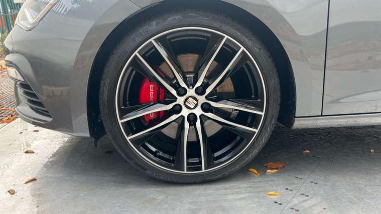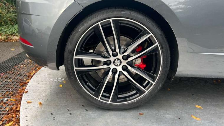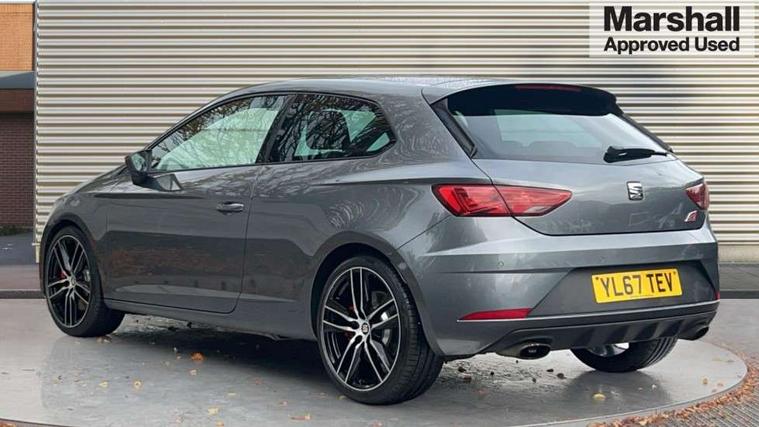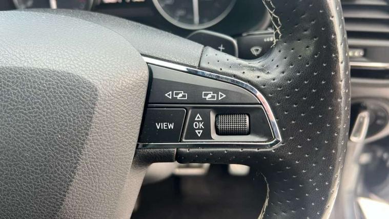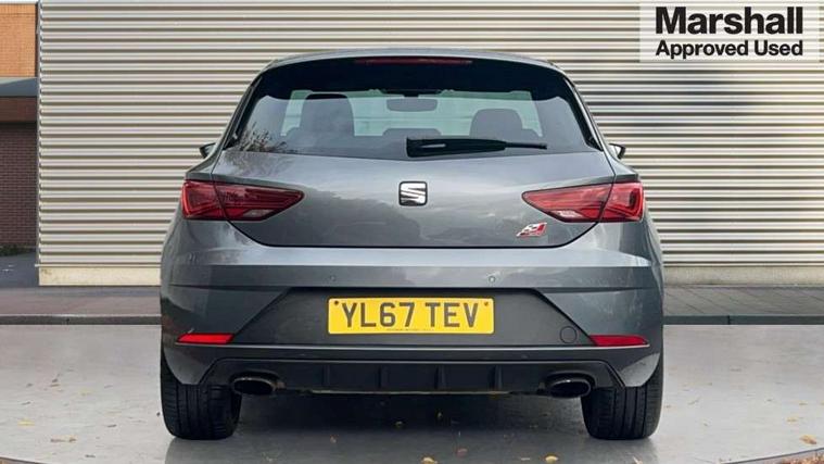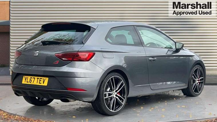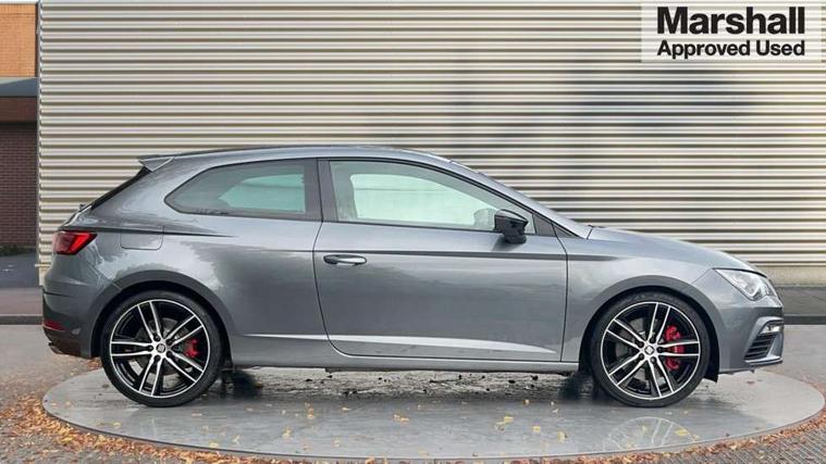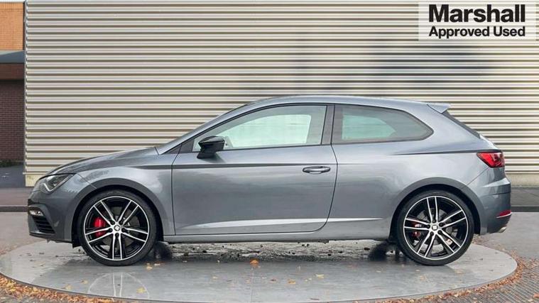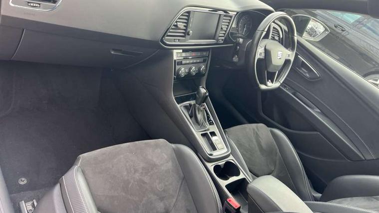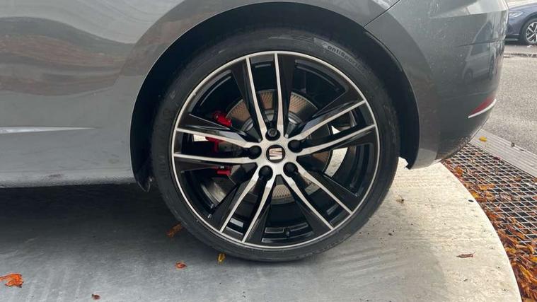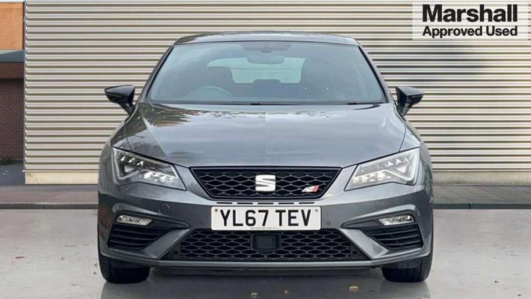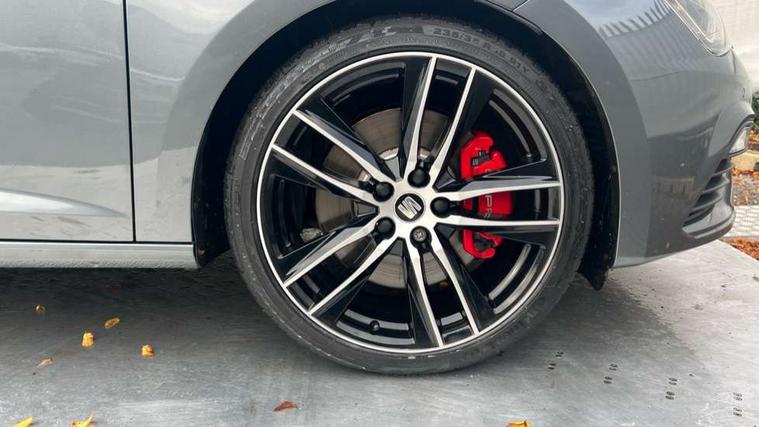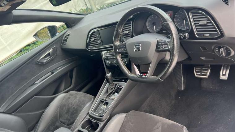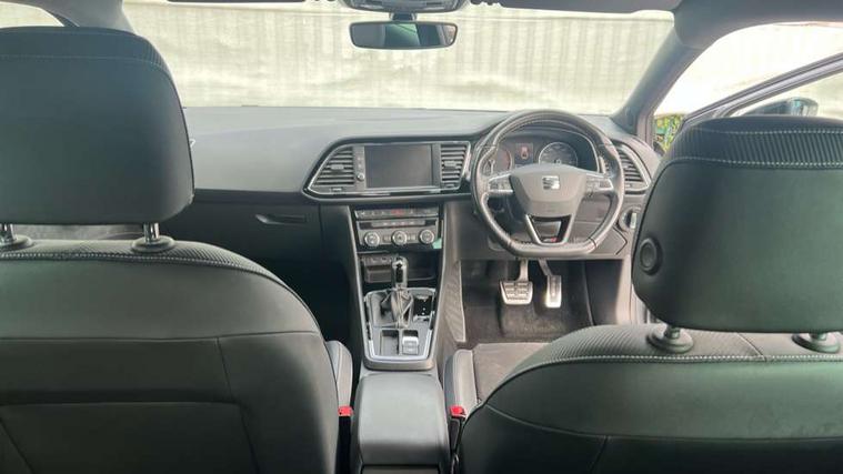 'Lights On' Reminder warning buzzer, 8" touch screen, Bluetooth Handsfree Phone Connection, Digital cockpit, Front assist with pedestrian protection, Front parking sensors, Full Link App interface, Low fuel warning light, Outside temperature gauge, Progressive power assisted steering, Rear parking sensors, Remote fuel flap release, SEAT Drive profile, SEAT logo boot release, Service interval indicator, Touch screen display, Trip computer, Voice control system, Dynamic chassis control, Electronic limited slip differential, Lowered sports suspension, 2 USB ports, 2 USB sockets in rear, 2x SD card slot, Auxiliary input socket, Bluetooth audio streaming, DAB Digital radio, Radio/CD + MP3, Steering wheel mounted audio/phone controls, Aluminium front door sills, Black bodyside mouldings, Body colour door handles, Body coloured bumpers, Dark tinted rear windows, Electric adjustable/heated/folding door mirrors, Electric front windows + one touch + anti-pinch, Electric headlamp adjustment, Extended roof spoiler, Gloss black door mirrors, High gloss black finish B and C pillars, High gloss black front grille surround, LED daytime running lights, LED front fog lights, LED Headlights, LED indicators in door mirrors, LED number plate light, LED tail lights, Rear wash/wipe, Reverse activated kerb-view adjustment on passenger's door mirror, Twin exhaust pipes, 12v power point in centre console, 3 height adjustable rear headrests, 60/40 split folding rear seat, Active head restraints, Additional heating and ventilation outlet in rear of centre console, Aluminium pedals, Black roof lining, Boot net, Driver seat height adjust, Driver seat lumbar adjustment, Driver/passenger sunvisors with illuminated vanity mirrors, Dual zone climate control, Dust/pollen filter, Front adjustable head restraints, Front armrest with storage box, Front cupholders x 2, Front seat and rear pockets, Front seats - 'Easy Entry', Front sports seats, Front/rear floor mats, Height/reach adjust steering wheel, Illuminated boot, Illuminated glovebox, Illuminated rear centre console, Instrument lighting with brightness control, Leather handbrake, Luggage tie-down hooks, Passenger seat height adjuster, Passenger seat lumbar adjust, Perforated leather steering wheel with white stitching + gear knob, Rear armrest, Rear top tether child seat ISOFIX attachment, Steering wheel gearshift paddles, Storage box under drivers seat, Convenience pack+ - Leon, 3 point seatbelts on all rear seats, ABS + traction control, Collision mitigation braking system, Curtain airbags, Driver/Front Passenger airbags, Drivers knee airbag, Electronic parking brake with auto hold, ESP+EBA, Front seatbelt pretensioners, Front Seatbelt warning, Front side airbags, Hill hold control, Passenger airbag deactivation system, Red brake calipers, Tyre pressure monitoring system, 2 folding remote keys with window open/close function, Engine immobiliser, Locking wheel bolts, Remote central locking + deadlocks, Volumetric alarm with back up horn, Gloss black interior trim, 19" Cupra Machined alloy wheels 30/2, Space saver spare wheel,