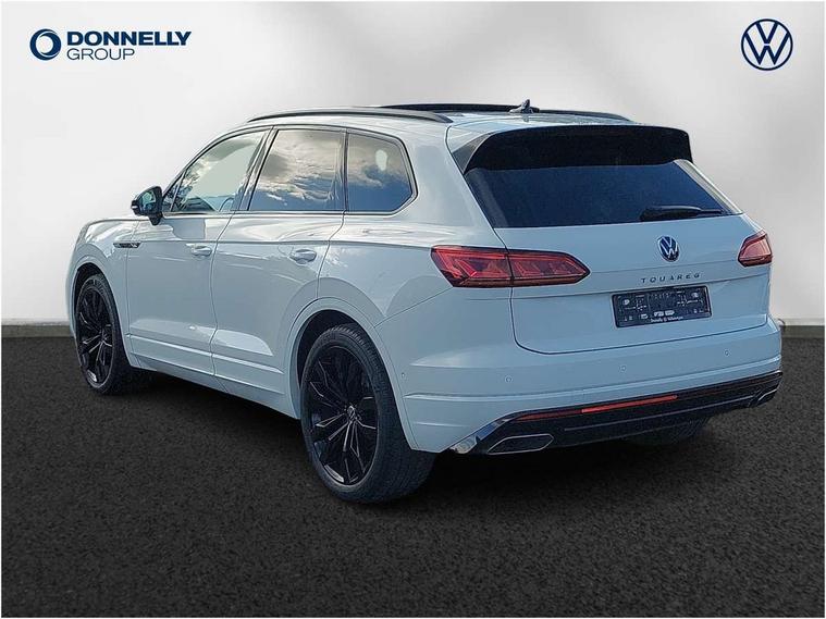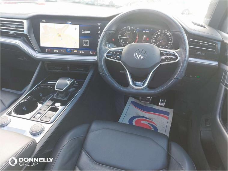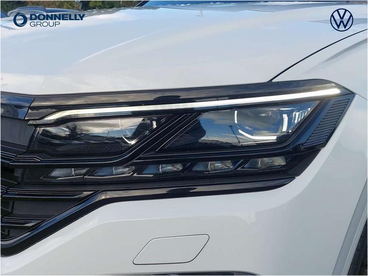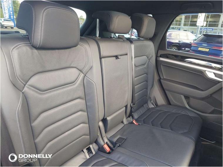 2D/3D map view, ACC - Adaptive cruise control with front assist, forward collision warning, distance monitoring, city emergency brake and speed limiter, Apple car play/Android Auto, Audible and visual fatigue detection system, Bluetooth hands free telephone connection, Car information display, Drive select with Damper control, Driver alert system, Driver profile selection, Dynamic road sign display camera controlled system with visual warning for traffic and road signs, eCall emergency system, Fully electric tailgate + keyless entry and start, Instrument cluster, MirrorLink, Multifunction camera, Multifunction computer premium with 7" colour display, One touch indicators with repeat function, Service interval indicator, Speed sensitive power steering, Start/stop system with regenerative braking, Tailgate power latch, Think blue trainer driver tips and journey analysis, Traffic sign recognition, Voice control system, Wireless Smartphone charger, 24 litre AdBlue tank, Torsen limited slip differential, DAB Digital radio, Dynamic navigation based on TMC+, Gesture control for infotainment system, Multi device interface (MDI) with illuminated USB-C connection, Music playback - MP3, WMA and AAC files, SD card slot, Simultaneous pairing of 2 compatible mobile devices, SMS functionality - read, compose and send SMS messages using touch-screen display, Title and cover art display, Volkswagen media control, Adaptive low beam for urban and motorway use, Auto dimming rear view mirror, Automatic coming/leaving home lighting function, Automatic headlights, Black anodised roof rails, Black door mirrors, Black rear diffuser, Black side window surrounds, Black upper and lower grille louvres extending into headlights and radiator grille, Body colour door handles, Body coloured wheel arches, C signature gloss black front air intake, Chromed tailpipe on the left and right integrated in the bumper with trapezoid design, Dusk sensor, Dynamic headlight range control, Electric front tilt/slide panoramic sunroof and fixed rear sunroof, Electrically power adjustable, heated, folding, auto dimming, front passenger exterior door mirror lowering function, Front and rear electric windows, Galvanised body, Gloss black finish B pillar, Gloss black rear diffuser, Headlight washers, Heat insulating darkened glass in side and rear windows, Heated windscreen washer jets, IQ.Light-LED matrix headlight, daytime running light with dynamic cornering light and indicator, LED 3rd brake light, LED rear fog light, LED rear number plate lights, Plastic scuff plates in door apertures, Poor weather light, Puddle lights, Rain sensor, Rear side wing doors, Rear wiper, 12V socket in front and rear centre console and boot, 2 Coat hooks on B pillar, 3 rear head restraints, 3 seat bench in 2nd row, 3 spoke sport heated leather multi-function sports steering wheel with gear shift paddles - generation 2, 4 way adjustable front head restraints, 4 way electric lumbar support for driver and front passenger, 4 zone climate control, 40:20:40 split folding slide/recline rear seat, B pillar vents, Black lower edge of door extending sills, Branded points of interest, Double sun visor for drivier and passenger with LED illuminated vanity mirrors, Electric luggage compartment cover, Folding rear centre armrest with 2 cupholders, Front + rear carpet mats, Front centre armrest with storage box, Gear shift indicator, Height/reach adjust steering wheel, Illuminated air conditioned glovebox, Isofix preparation for 2 rear child seats, Jack and tool kit, Leather trimmed gear knob with gloss black inlay/aluminum trim, Leatherette door trim, LED luggage compartment lighting, Load through provision, Luggage compartment with load lashing rings, Plastic loading edge protection, Rear seat remote release levers, Single front passenger seat, Soul black headlining, Stainless steel pedals, Innovision cockpit pack - Touareg, 3 point front seatbelts with pre-tensioners, ABS, Active bonnet, Automatic post collision braking system, Curtain airbags, Driver/Front Passenger airbags, EBD + Brake Assist, EDL, Electronic parking brake with auto hold, ESC with ASR, Front seat side impact airbags, Hill descent control, Hill start assist, Passenger airbag deactivate switch, Seatbelt warning lamp and buzzer, Three 3 point rear seatbelts, Two tone horn, Volkswagen roadside assistance, Warning triangle and first aid kit, Alarm with interior monitoring in cab, backup horn and towing protection, Child security locks for front and rear doors, Electronic engine immobiliser, Remote central locking, Black decorative trims on the side windows, High gloss black centre console,