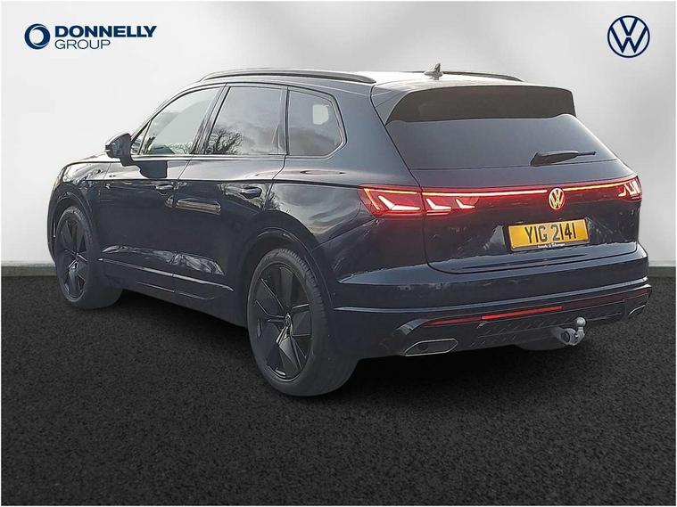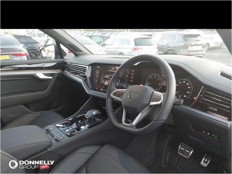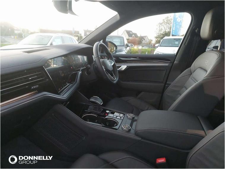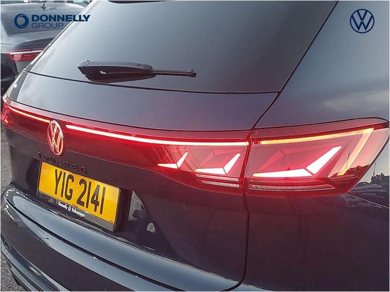 15" Screen Top infotainment system Premium (MIB3), Adaptive cruise control, Advanced driver attention and drowsiness monitor, Driver profile selection, Dynamic road sign display, E-Sim card for online connectivity, eCall emergency system, Innovision cockpit, Intelligent park assist, Mobile phone interface with inductive charging, Multi-colour Active Info display, Park Assist - Sensor controlled steering aid to assist parallel or bay parking, PAS, Warning signal and warning light for front and rear seatbelts not fastened, Wireless app connect, Adaptive chassis control, DAB Digital radio, Diversity antenna for AM/ FM reception, We Connect and We Connect Plus functionality, Automatic coming/leaving home lighting function, Automatic headlights, Black door mirrors, Black style comfort bumpers, Dynamic headlight range control with dynamic cornering light, Electric front tilt/slide panoramic sunroof and fixed rear sunroof, Electrically power adjustable, heated, folding, auto dimming, front passenger exterior door mirror lowering function, External USB type C socket and charging sockets, Gloss black roof rails, HD LED Matrix beam plus digital headlight projection with variable light distribution, Headlight washers, Highway light, LED 3rd brake light, LED daytime running lights, LED rear combination lamp with variable lighting functions and special styling, Poor weather light, Rain sensor, Rear exhaust tailpipe, Rear fog light with back up light on both sides, Rear light bar and illuminated logo, Rear side wing doors, Rear wiper, Stainless steel door sill protection, 12V socket in centre console, 3 rear headrests, 3 seat bench in 2nd row, 4 zone climate control, Airbag label on sun visor and B-pillar, Brushed stainless steel pedals, Double sun visors with illuminated vanity mirrors, Front + rear carpet mats, Front centre armrest, Leather wrapped multifunction sports steering wheel, heated, with touch control and shift paddles, Mechanical rear seat release, Power adjustable lumbar support in front, Power seats in front, right side with memory features and seat cushion depth adjustment, Rear seat backrest and split folding with center armrest, Single front passenger seat, Memory pack plus - Touareg, 3 point seatbelts, outer rear with ECE lable, ABS, Child locks on rear doors, Curtain airbags, Driver and front passenger safety-optimised head restraints, Driver/Front Passenger airbags, Extended pedestrian protection measures, Front assist, Front seat side impact airbags, Generative braking with start and stop system, Height adjustable 3 point front seatbelts with pre tensioners, Passenger airbag deactivate switch, Three 3 point rear seatbelts, Two tone horn, Tyre pressure loss indicator, Warning triangle and first aid kit, Alarm system with interior protection, Easy open and close sensor controlled luggage compartment opening and closing with remote unlocking, Keyless Access Keyless locking and starting system with SAFELOCK, Aluminium decorative inserts, Black decorative trims, Gloss black decorative inserts in centre console, Tool kit,