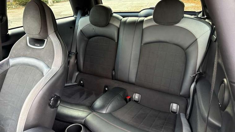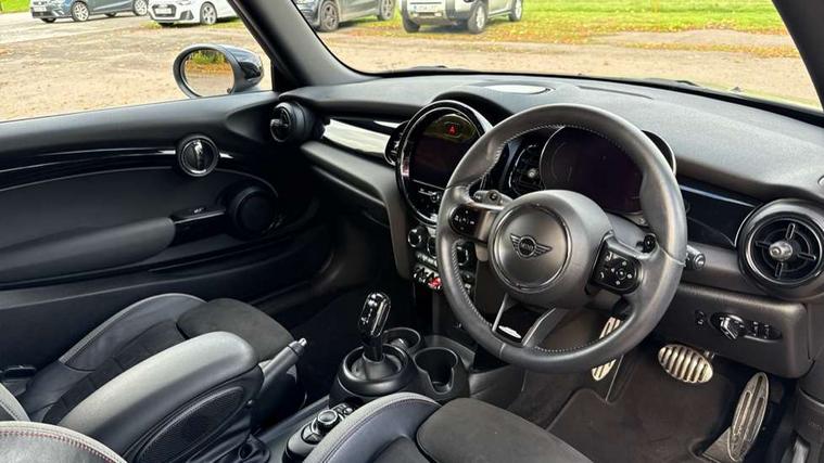 Apple CarPlay, Automatic start/stop function with brake energy recuperation, Compatible mobile phone bluetooth with audio streaming, Cruise control with brake assist, Electro-mechanical speed dependant steering assistance, Flexible car sharing preparation, Instrument cluster, MINI Driving Modes - centre toggle switch to control driving setting (sport, mid and green), Mini E-call, MINI TeleServices, On board computer, Rear park distance control, Service interval indicator, Double Vanos system, Fully variable valve control, High precision injection, Intelligent adaptive suspension, Performance Control, Steptronic sport transmission with double clutch and steering wheel paddles, 8.8" touchscreen with LED ring, FM tuner and DAB digital radio, 3rd brake light, Automatic headlight activation switch, Bonnet scoop, Dynamic brake lights, Electric front windows, Heated rear window, Heated windscreen washer jets, JCW Aerodynamic kit - Front and rear bumpers with sporty JCW styling and part-painted side sills with MINI John Cooper Works door sill finishers, John Cooper Works rear spoiler, LED headlight with closed ring and daytime driving lights, Metal door sill strips with Cooper S, Model logo Cooper S on right of tailgate, Radiator grille chrome border with honeycomb structure including S Badge, Rain sensor window wipers, Rear fog lights, Rear LED lights with union jack design, Rear window wiper, Side scuttle panel with integrated indicator, Sun/heat protection glass, Two central exhaust tailpipes with chrome finisher, White indicator lenses, 12V Accessory socket in centre console, 2 seat bench in 2nd row, 4 lashing eyes in luggage compartment, 60/40 split folding rear seat, Anthracite headliner including grab handles and clothes hooks, Carbon black colour line - Knee roll and door armrest, Chrome interior highlights, Cupholders, Front and rear isofix with front passenger airbag deactivation, Front floor mats in velour, Glove compartment, Height and length steering column adjustment, Interior lighting with 12 different colours across the dashboard, underneath door bezel with illuminated laser-engraved design on central display, JCW Sport seats with integrated headrests, adjustable thigh support and John Cooper Works logo, Leatherette gearshift lever and handbrake gaiters, LED reading lights, vanity mirror lights, front foot well light and spotlight on front seats, Manual air conditioning, Mechanical seat adjustment - forward/back & backrest for front seats and driver seat height adjust, Multifunction steering wheel, Passenger seat height adjuster, Single front passenger seat, Storage compartments in doors, Storage pocket on back of front seats, Sunvisors with vanity mirrors, Walknappa leather steering wheel with grey seam and John Cooper Works badge on Piano Black lower steering wheel spoke, Piano black exterior pack - Mini Hatchback Cooper S, 3 point seatbelts on all four seats, 6 Airbags - front, side, head and seat belt tensioners, Anti-lock braking system (ABS), DSC - Dynamic Stability Control, Front and rear disc brakes, Two tone horn, Tyre pressure monitoring system, Alarm system with tilt sensor, monitoring doors, bonnet interior and tailgate, Electronic vehicle immobiliser, Start/stop toggle with keyless go, Piano black interior trim, Tool kit,