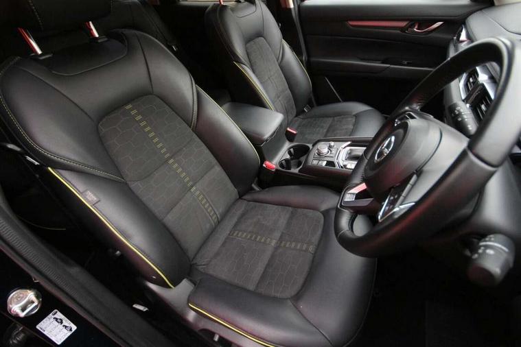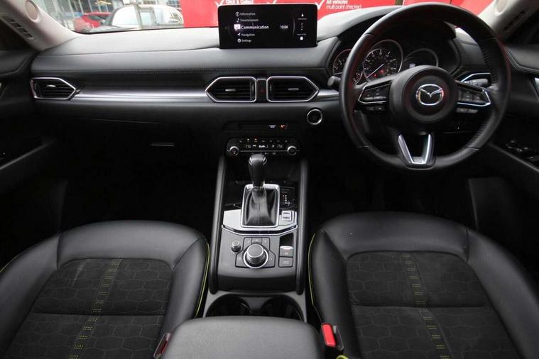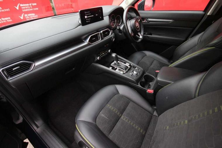 10.25" display with Mazda Connect infotainment, Advanced blind spot monitoring, Apple car play/Android Auto, Bluetooth connectivity with voice control, Collision prevention assist, Connected services, Cruising Traffic Support, Drive mode selector, Electric power steering, Emergency stop signalling system, Engine start/stop button, Forward collision warning, Front and rear parking sensors, High meter TFT display, Integrated navigation system, Intelligent speed assist, Lane departure warning system, Lane keep assist, Radar cruise control with Stop and Go, Service indicator, Trip computer, i-stop, 2 USB sockets in rear, 2x USB sockets in front, 6 speakers, AM/FM radio, Bluetooth audio streaming, DAB Digital radio, Multimedia Commander including separate volume dial, Steering wheel mounted audio controls, Adaptive front lighting system, Auto dimming rear view mirror, Automatic headlights, Black mirror caps, Body colour roof spoiler, Body coloured front and rear black lower bumper mouldings, Bright finish signature wing, Coming/leaving home lighting function, Door mirror integrated indicators, Dual chrome tailpipes, Dusk sensitive headlamps, Electric front/rear windows with one touch auto up/down, Front and rear silver under garnish and side skirt, Front and rear silver under guard and side garnish, Front grille in material black finish, High beam assist, Intermittent rear wash/wipe, LED auto levelling, LED daytime running lights, LED front fog lights, LED Headlights, LED third brake light, Lime green air vent louvre inlay dashboard panel, Lime green front grille accent color, Louver bezel inner lime green accent, Power folding and heated door mirrors, Privacy glass (rear side windows only), Rain sensing front wipers, Rear side wing doors, Satin black B and C pillars, Satin black side mouldings, Scuff plates, Shark fin antenna, Signature LED rear combination lights, Vinyl with lime green door trim panel, 12v electrical power outlet, 3 seat bench in 2nd row, 3 stage heated front seats, 40:20:40 Karakuri fold-flat seat system, 6 way power adjustable driver seat, Driver seat lumbar adjustment, Driver seat power slide, recline and height adjustment, Driver, Front passenger and two rear grab handles with coat hooks, Driver/passenger front seatback pockets, Driver/passenger sunvisors + illuminated vanity mirrors (drivers with ticket holder), Dual zone climate control, Folding centre armrest with 2 cup holders, Front and rear door pockets, Front centre storage with two cupholders, Front passenger seat manual slide, recline and height adjust, Height adjustable passenger seat, Humidity sensor, Illuminated glovebox, Interior dome light with integral spotlight, ISOFIX child seat anchorage points attached on outer rear seats, Karakuri tonneau cover, Leather wrapped steering wheel and gear knob, Leatherette door trim, Leatherette/suede upholstery, Light roof lining, Luggage compartment LED lighting, Luggage compartment power outlet, Rear air vents, Rear headrests, Rear seat recline, Reversible waterproof cargo board, Roof mounted sunglasses holder, Single front passenger seat, Three height adjustable head restraints, Tilt/height adjustable steering wheel, White interior LED illumination lighting, 3 point front seatbelts with pre-tensioners, 3 rear 3 point seatbelts, ABS, Advanced Smart City Brake Support - SCBS, Child locks on rear doors, Driver and front passenger side airbags, DSTC-Dynamic Stability and Traction Control, Dual front airbags, Electronic brake force distribution, Electronic parking brake with auto hold, ESP, Front and rear curtain airbags, Front passenger airbag deactivation, G-Vectoring control, Hill hold assist, Seatbelt reminder front and rear, Single stage passenger airbags, Smart brake support with forward obstruction warning, Tyre pressure monitoring system, Automatic door locking when moving off, Deadlock, Immobiliser, Power door locks, Remote central locking, Thatcham Cat.1 alarm, 19" diamond cut black alloy wheels, Tyre repair kit,