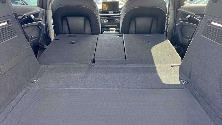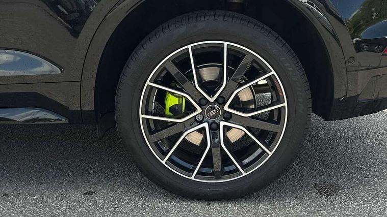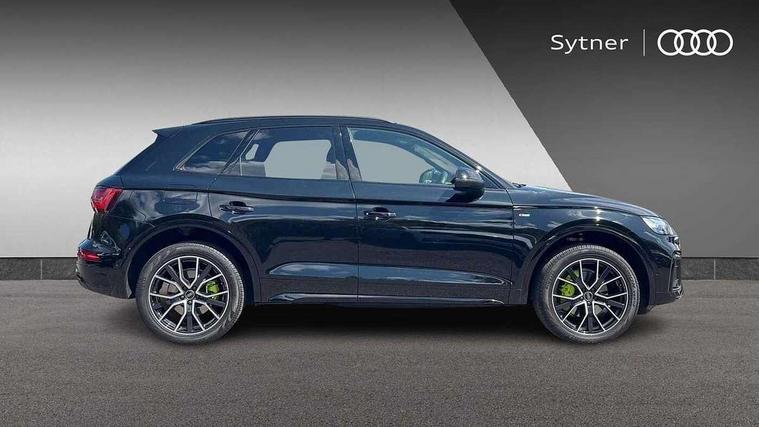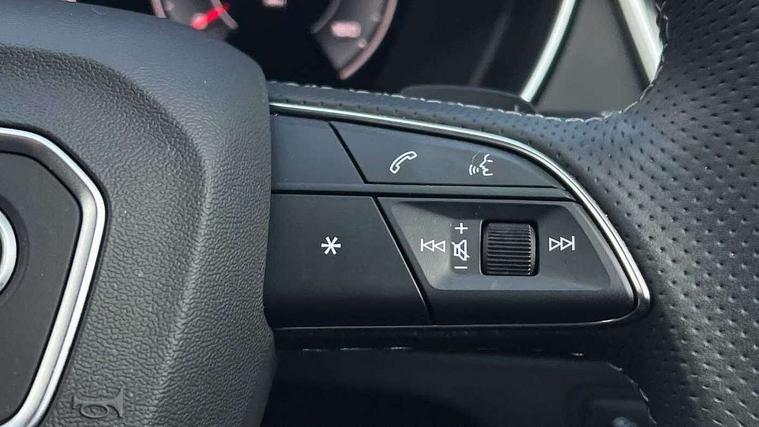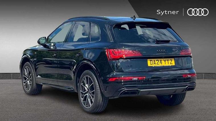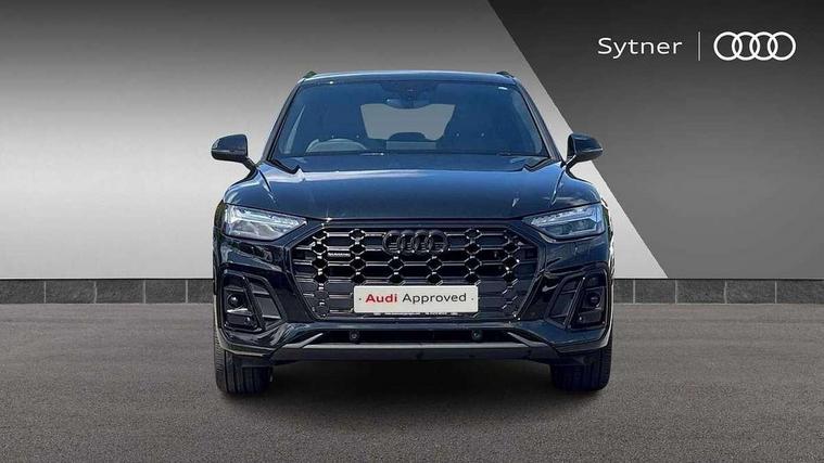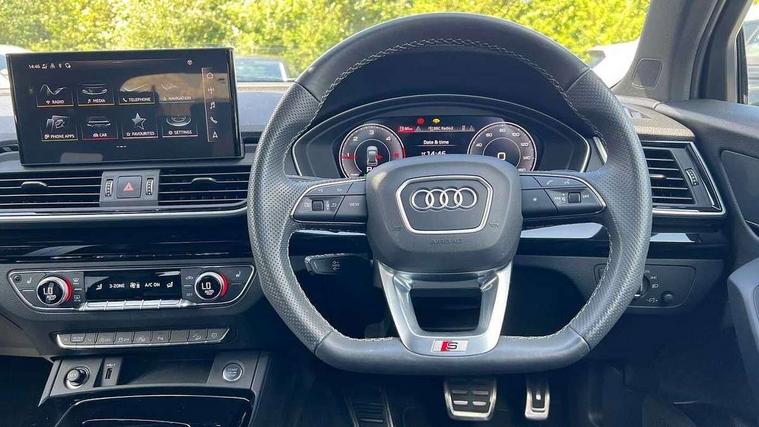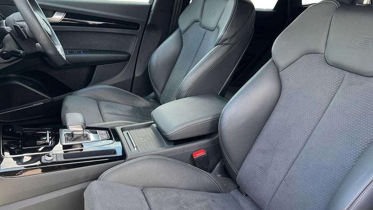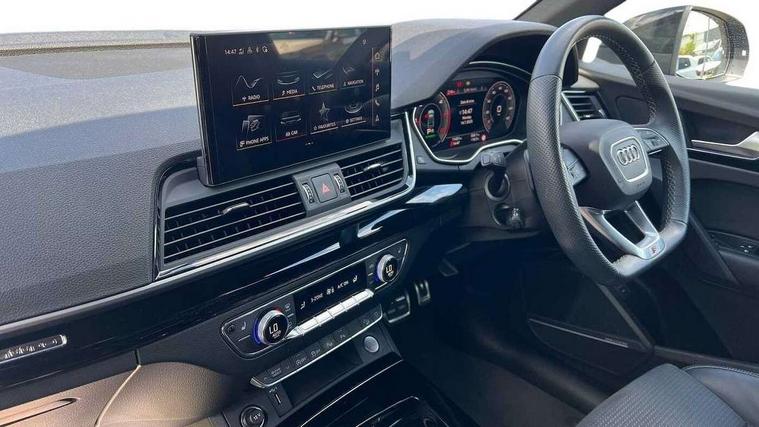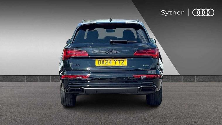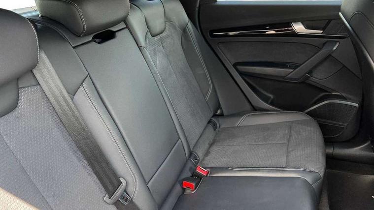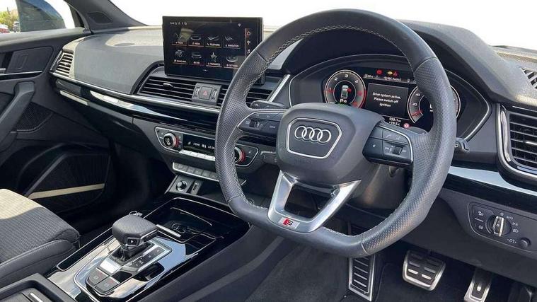 Acoustic front and rear parking sensor, Audi connect safety and service (e-call), Audi drive select, Audi virtual cockpit plus with 12.3" screen and three different layout designs, Audi wireless smartphone interface, Automatic start-stop system with coasting functionality and efficiency programme, Bluetooth interface, Camera based traffic sign recognition, Electro - mechanical power assisted steering, Lane departure warning, MMI navigation plus with 10.1" touch screen, Power tailgate, Reversing camera, Service interval indicator, Voice control system with Audi hotword activation "Hey Audi", Diesel particulate filter, Quattro on demand, S line sports suspension, 2 x USB charging port with aux input socket, 8 loudspeakers, DAB Digital radio, Acoustic windscreen, Auto dimming door mirrors, Auto dimming frameless rear view mirror, Automatic headlight adjustment, Automatic headlights and windscreen wipers, Black roof rails, Black styling with black rings, Body colour bumpers, Body colour rear diffuser with matt aluminium silver surrounds, Body colour underbody protection, Chrome plated exhaust trims, Daytime running lights, Door sills in Selenite silver, Electric adjustable/heated/folding door mirrors, Front air inlet surrounds in aluminium, Front and rear electric windows, Front radiator grille in honeycomb design, LED 3rd brake light, LED headlights and LED tail lights, Loading edge protection in stainless steel, Lower bumpers painted in contrast Manhattan grey, Rear chrome trim strip below lights, Rear privacy glass and rear side windows, Rear side wing doors, Rear wiper, Roof bars, S Line badges on the front wing panels, S Line front and rear bumpers, S Line rear spoiler, S Line side skirts, 3 rear headrests, Black cloth headlining, Comfort front centre armrest, Contrast stitching on seats, steering wheel and gear lever gaiter, Deluxe 3 zone electronic climate control, Front head restraints, Front sport seats with S embossed logo, Front/rear floor mats, Gear lever in black leather, Heated front seats, Height/reach adjustable steering column, Illuminated door sill trims with S logo, Luggage compartment cover, Manual seat adjustment with 4-way electric lumbar support, Single front passenger seat, Stainless steel pedals, Sunvisors with vanity mirrors, Top surface of the rear centre armrest in artificial leather, High gloss pack - Q5, LED interior light pack - Q5, 3 point seatbelts on all seats, 6 airbags - Driver, front passenger, curtain and side airbags, Attention and drowsiness assist, Electrically operated child locks on rear doors, Electromechanical parking brake, Electronic stabilisation control including ABS, ASR and EDL, First aid kit with warning triangle and vests, Front passenger airbag deactivation, Hill descent control, Hill hold assist, ISOFIX child seat mounting for front passenger seat and ISOFIX child seat mounting with Top Tether for outer rear seats, Multi collision brake assist, Pop-up bonnet for pedestrian protection, Pre sense city, Seatbelt monitoring, Tyre pressure warning, Anti theft alarm, Anti-theft wheel bolts, Remote central locking, Remote control key with SAFELOCK and keyless go, Air vents inserts and centre console in gloss black, Tool kit, Tyre repair kit,