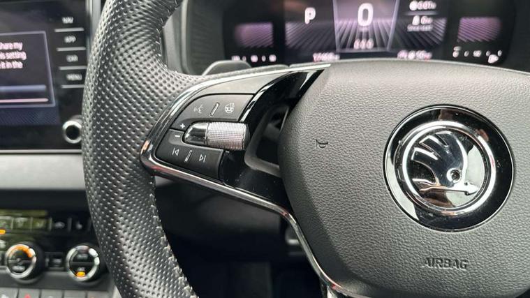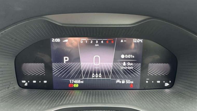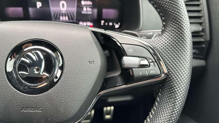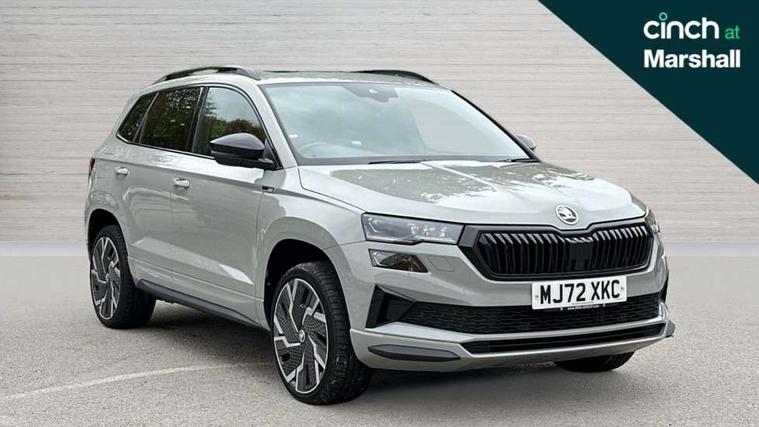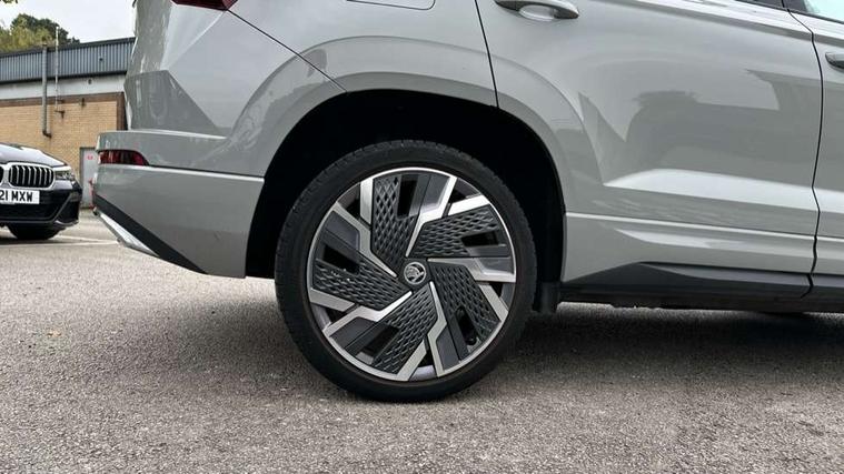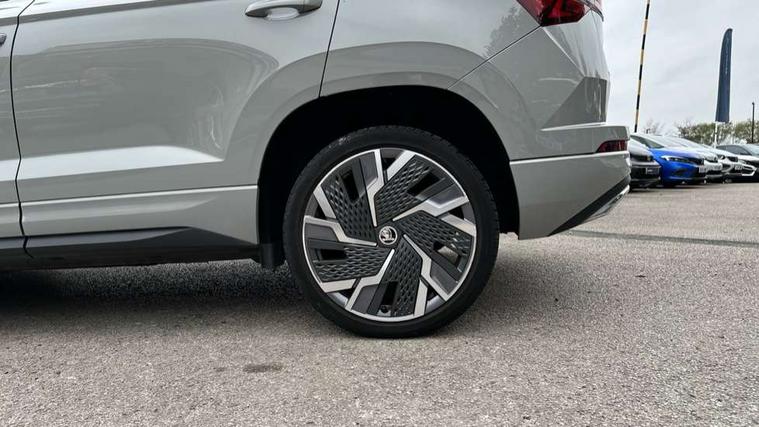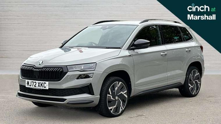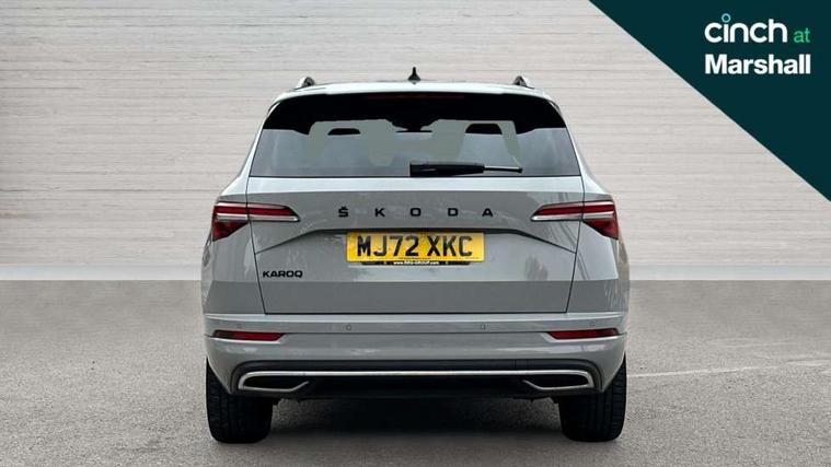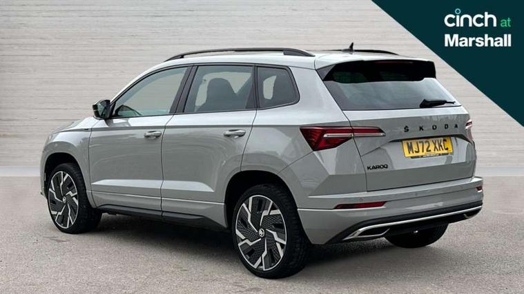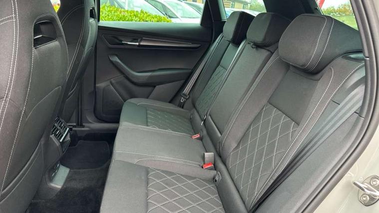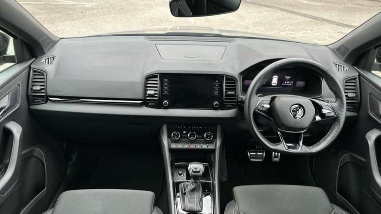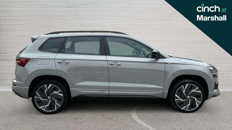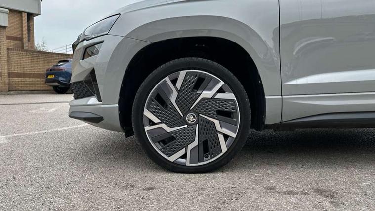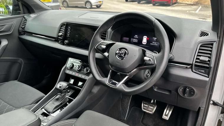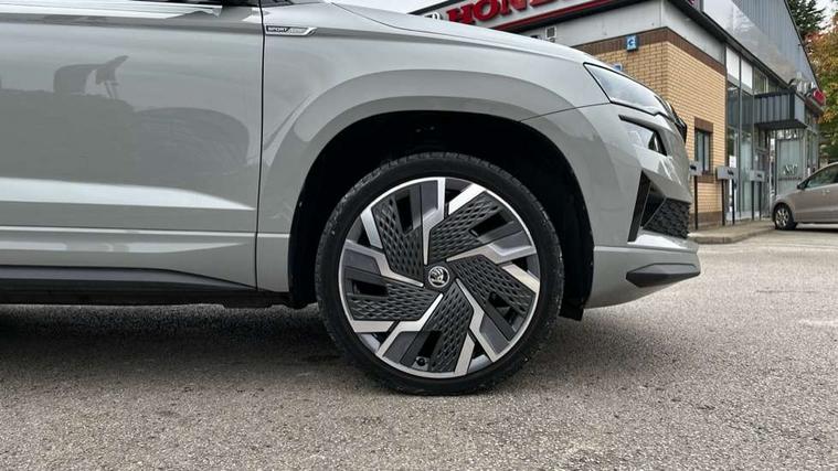 8" Digital display, Care connect, Driver fatigue sensor, Emergency services call system, Outside temperature gauge, Service interval indicator, SmartLink wireless for Apple and wired for Android, Start/stop system with regenerative braking, USB C Port x 2 in front centre console, Virtual pedal with electrically operated boot door, 8 Speakers, DAB radio with Bluetooth, USB connection, Acoustic glass, Aero front windscreen wipers with intermittent function, Auto dimming rear view mirror with light and rain sensors, Black door mirrors, Black electric window control buttons, Black radiator grille, Black roof rails, Body colour door handles, Dynamic headlight range control with cornering light function, Electric front and rear windows with child proof lock, Front door steps with SportLine logo, Heated rear windscreen, LED daytime running lights, LED rear lights with high functionality welcome effect and dynamic indicators, Light assistant (coming/leaving home/tunnel light), Panoramic sliding sunroof, Plastic scuff plates, Privacy glass, Protective door side sills in body colour, Rear diffuser, Rear side wing doors, Rear spoiler, Rear window wiper with washer system and intermittent control, Safety reflectors on front doors, Skoda lettering on tailgate in black, Sportline badge on front fender, Sportline decorative inserts with badging, Sports front and rear bumpers, 1.5 litre bottle holders in driver and front passenger door panels, 12V socket in boot, 12v socket in front centre armrest with storage compartment and rear air vents, 2 Folding hooks and nets in boot, 3 rear height adjustable headrests, 3 seat bench in 2nd row, 3 spoke leather sports multifunction steering wheel and silver stitching with gear shift paddles, 4 foldable roof handles with rear coat hooks, Black floor carpet, Black roof headlining, Chrome inner door handles, Double sided boot floor, Foldable hooks in the boot, Front head restraints, Height adjustable front three point seats belts with tensioners, Height/reach adjust steering wheel, Ice scraper, Illuminated glovebox, Illuminated luggage compartment, Isofix child seat preparation outer rear, Manual lumbar support for front seats, Pen holder, Pollen filter, Rear boot cover, Rear reading lights, Rear seats fixed folding and divided 60:40, Rubbish bin door, Safety vest holder, Single front passenger seat, Storage box in upper central dashboard closed, Sunvisors with illuminated vanity mirrors, Textile floor mats, Ticket holder, Titan black interior ceiling, Welcome animation with sportline logo, Light Pack - Karoq, Parking pack - Karoq, Automatic door unlocking in case of crash, Automatic fuel cut off in case of crash, Child locks on rear doors, Driver airbag, Electronic parking brake with auto hold function, Emergency rear braking signal, ESC including ABS, MSR, ASR, EDS, HBA, DSR, RBS, MKB and traction control, Front side airbags, Hill hold control, Knee airbags, Passenger airbag with switch-off function, Pedestrian monitor, Seatbelt reminder signalisation and pretensioner for all seats, Three point seatbelts rear, Two tone horn, Tyre pressure display, Tyre pressure monitor, Alarm with interior monitoring, back up horn and tilt sensor with safe function, Electronic engine immobiliser, Keyless entry and start/stop, Remote central locking with 2 remote folding keys, Black air vent surround, Black centre console, Satin black dashboard, Satin black door trim, 19" Sagitarius anthracite alloy wheels with matt black aero inserts, Anti-theft wheel bolts protection, Matt black aero hub caps, Storage on wheel cover, Tool kit,