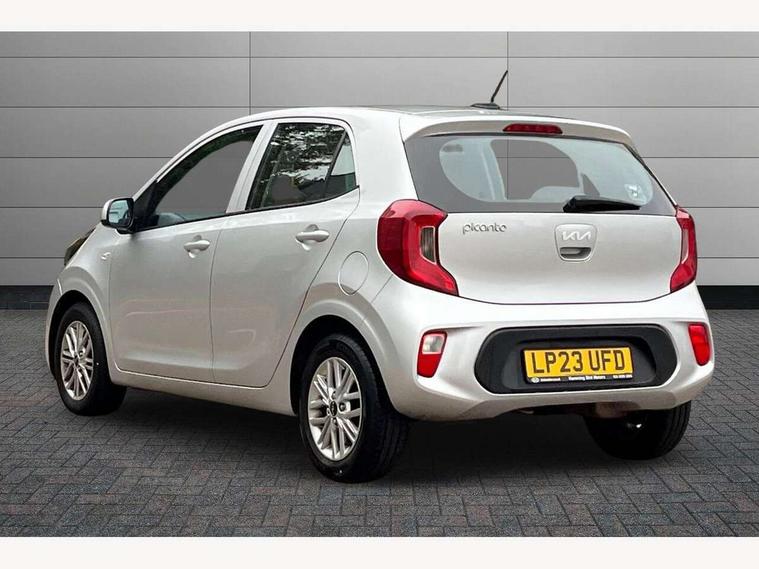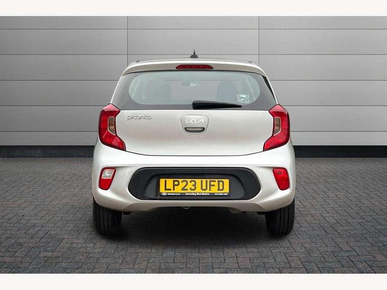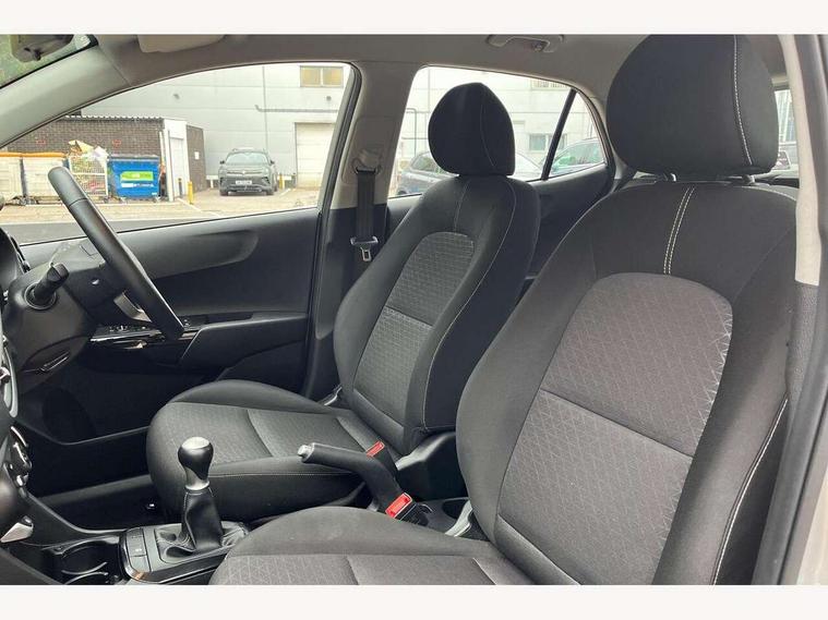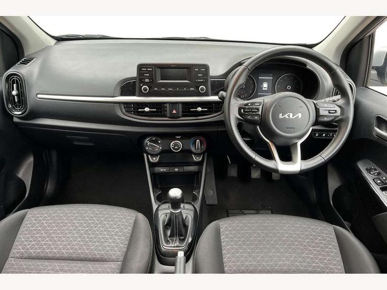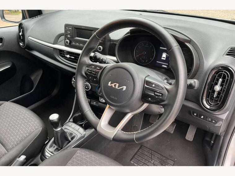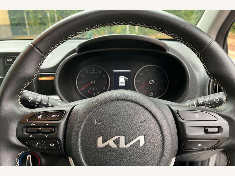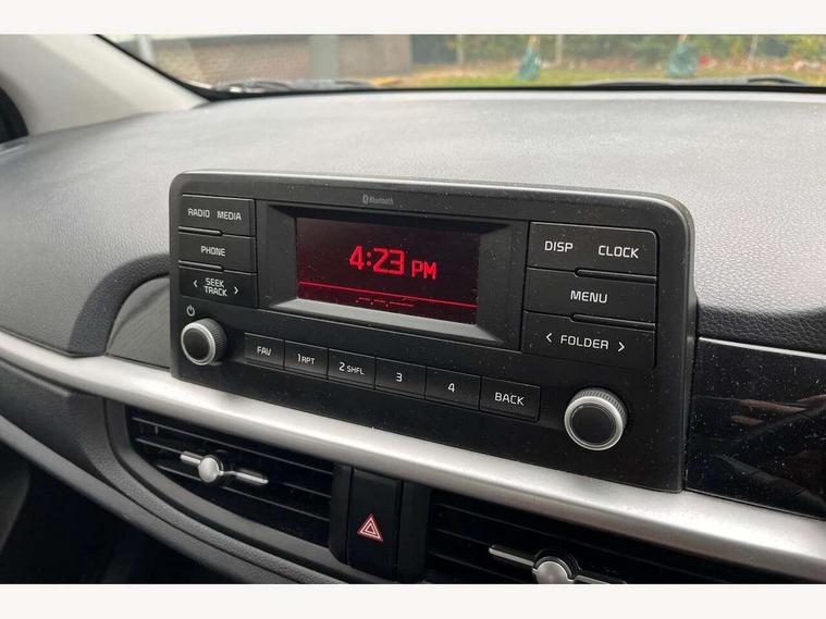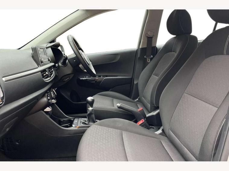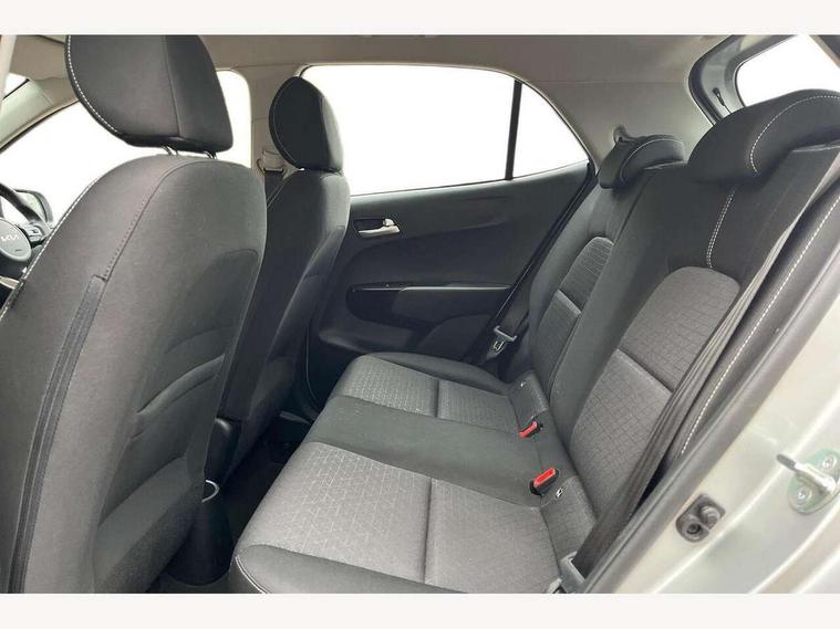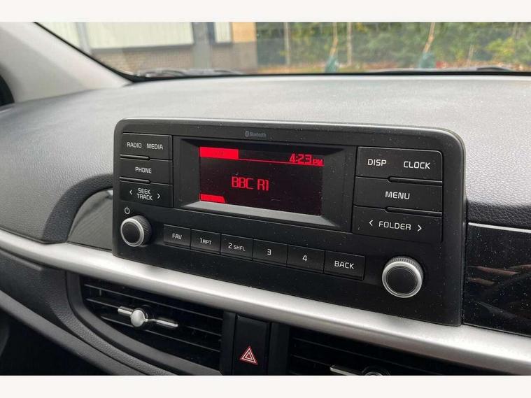 3.8" monochrome audio display with RDS and DAB, 4.2" supervision monochrome cluster display, Emergency call service, Emergency stop signalling system, External temperature gauge, Forward Collision-Avoidance Assist (FCA) - City, Motor driven power steering, Tachometer, Tailgate, Trip computer, 4 speaker audio system, Bluetooth with music streaming, Steering wheel mounted controls, USB ports for connection of a media device, Automatic headlight control system, Black radiator grille with chrome surround, Body colour bumpers, Body colour mirrors and door handles, Day/night rear view mirror, Daytime running lights, Electric adjustable heated door mirrors, Front and rear electric windows with drivers's auto up/down function, Headlamp levelling, Heated rear window, High mount brake light, MFR - Multi Focus Reflector halogen headlights with black bezel, Rain sensor, Rear fog lights, Rear side wing doors, Rear wash/wipe, Speed variable front wipers, Tinted glass, Visible VIN plate, Welcome and follow-me home light functionality, 1 x rear coat hook, 12V power point front, 2 seat bench in 2nd row, 3 x passenger assist grips, 60/40 split/folding 2nd row of seats, All round height adjustable headrests, Cupholders in centre console, Driver and front passenger sunvisor with vanity mirror, Driver seat height adjust, Front cabin lights, Glovebox, High gloss lower centre fascia trim, door armrest and air vents, ISOFIX Child seat top tethers and anchor fixings, Leather trimmed steering wheel and gearshift, Luggage area light, Luggage area parcel shelf, Manual air conditioning, Passenger front seatback pockets, Premium cloth upholstery, Silver paint finished interior door handles, Single front passenger seat, Slide/reclining front seats, Tilt adjustable steering wheel, Advanced Driver Assistance Pack - Picanto, 2 x 3-point rear seatbelts, ABS/EBD, Automatic unlocking of doors in case of impact, ESC + BAS + VSM + HAC, Front passenger airbag cut-off switch, Front seatbelt height adjusters, Front seatbelt pretensioners, Hill hold control, Hill start assist control (HAC), Knee airbags, Rear child proof door locks, Seatbelt warning, Side impact protection, Torque vectoring brake based and straight line stability (SLS), Traction control, Twin curtain airbags, Twin front airbags, Twin front side airbags, Tyre pressure monitoring system, Anti theft alarm, Engine immobiliser, Folding key, Locking wheel nuts, Remote central door locking, 14" alloy wheels, Tyre mobility kit,