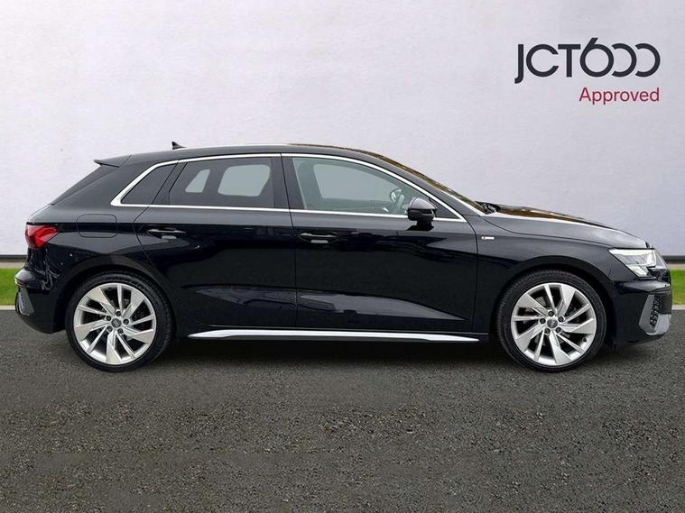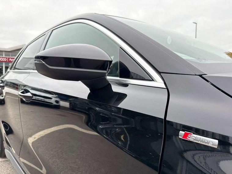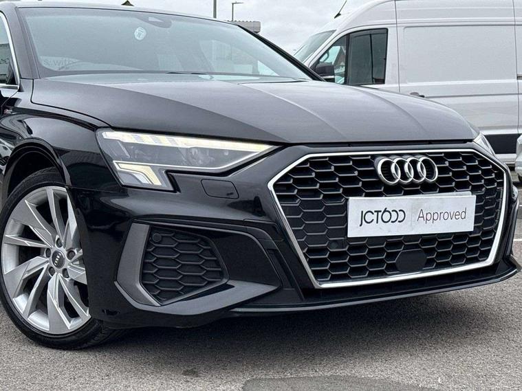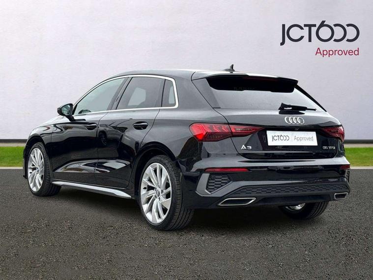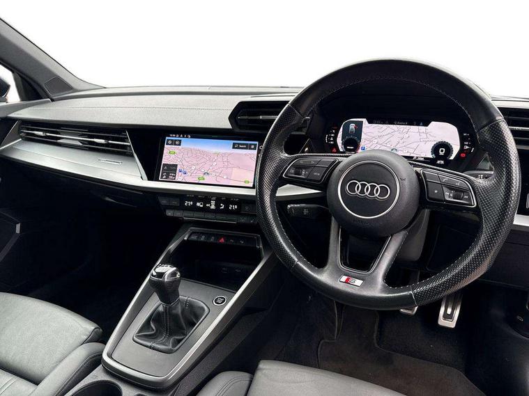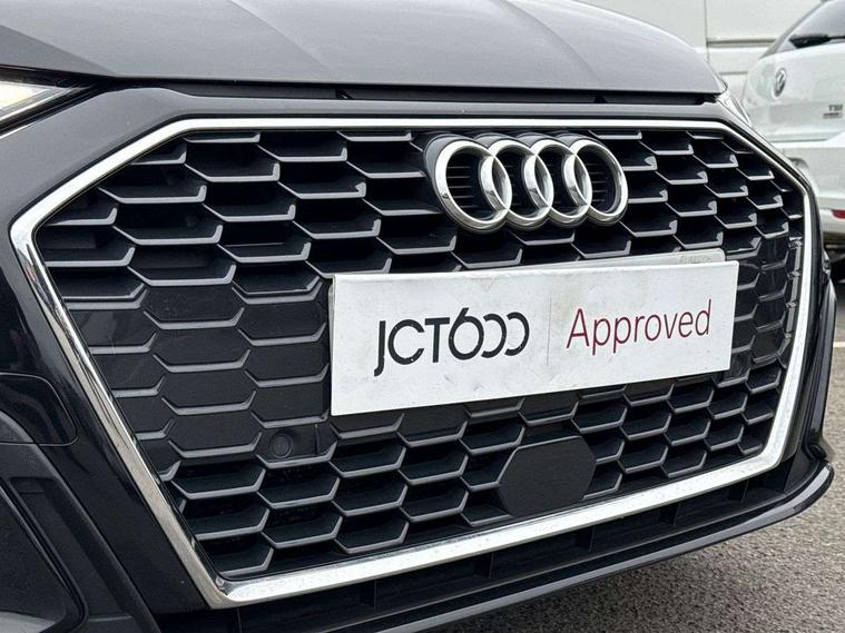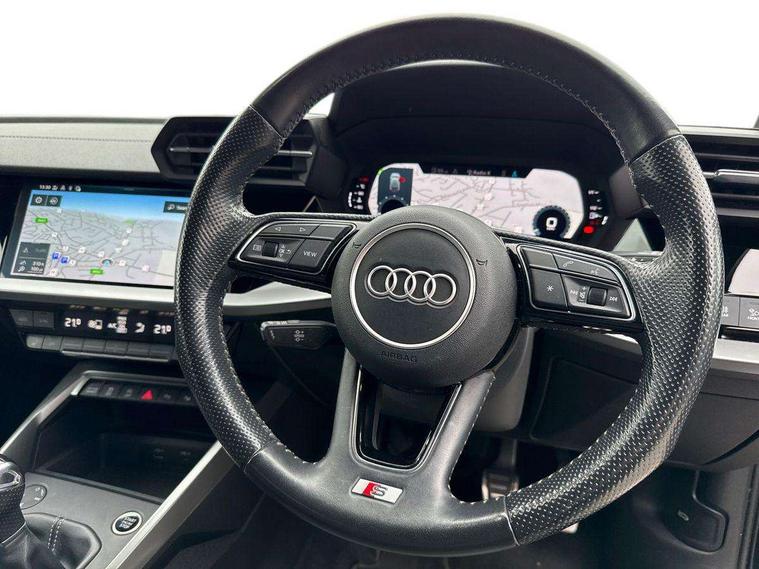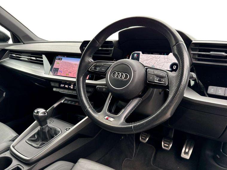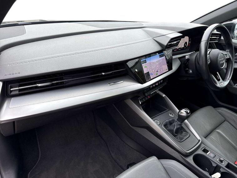 Audi connect emergency call and service, Audi drive select (Auto, Comfort, Dynamic, Efficiency and Individual), Audi smartphone interface, Audi Virtual Cockpit - 10.25" digital and colour instrument cluster, Automatic start/stop system with recuperation, Bluetooth interface, Collision avoidance assistant, Cruise control, Electromechanical power speed sensitive steering, Lane departure warning system, MMI Navigation Plus with high resolution 10.1" colour touch screen display, Rear parking sensors, Service indicator, Trip computer, Voice control system with natural language interaction, 1xUSB-A and 1xUSB-C connection, 6 passive loudspeakers, DAB Digital radio, Acoustic glass windscreen, Aluminium window trim, Auto dimming frameless rear view mirror, Body colour exterior mirrors, Electrically adjustable/heated/folding/dimming door mirrors with kerb view includes integrated LED indications + kerb view function for passenger side, Front electric windows, Illuminated aluminium inserts front door sills with S logo, LED daytime running lights, Light and rain sensors, Privacy glass - dark tinted rear window, rear door and side windows, Rear electric windows, Rear side air outlets in grained matt black, Rear wiper, S line bumpers, S roof spoiler, 12V socket and storage compartment in front centre console, 40/20/40 split folding rear seat bench with cupholder, Black cloth headlining, Dual zone electronic climate control, Front and rear centre armrest in leather, Front and rear headrests, Front/rear floor mats, Height and reach adjustable steering wheel, Interior lighting - glove compartment light and right hand side, Luggage compartment floor covering, Manual boot compartment lid, Manually adjustable front seats, Seat side bolsters, Stainless steel pedals and front footrest, Twin leather upholstery with front sports seats S embossed logo, Aluminium interior elements pack - A3 Sportback, S line styling pack - A3 Sportback, 3x3 point rear seat belts, Driver and front passenger airbag with passenger airbag deactivation, Electronic Stabilisation Control (ESC) including ABS, ASR and EDL, First aid kit with warning triangle and 2 safety vests, Hill hold assist, Pre-sense front with pedestrian and cyclist detection, Seatbelt monitoring, Tyre pressure loss indicator, Anti theft alarm, Anti-theft wheel bolts, Electronically operated child lock, Immobiliser, Remote control central locking, Accent surfaces in the dashboard and centre console in platinum grey silk effect paint finish, Dark spectrum aluminium inlays,