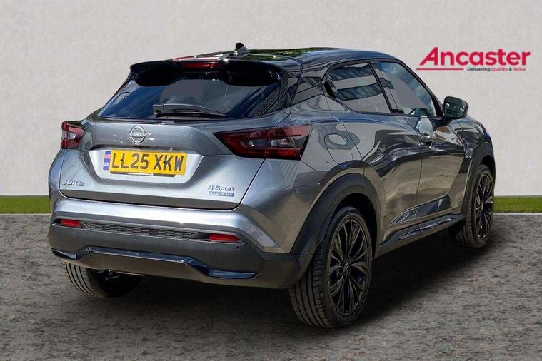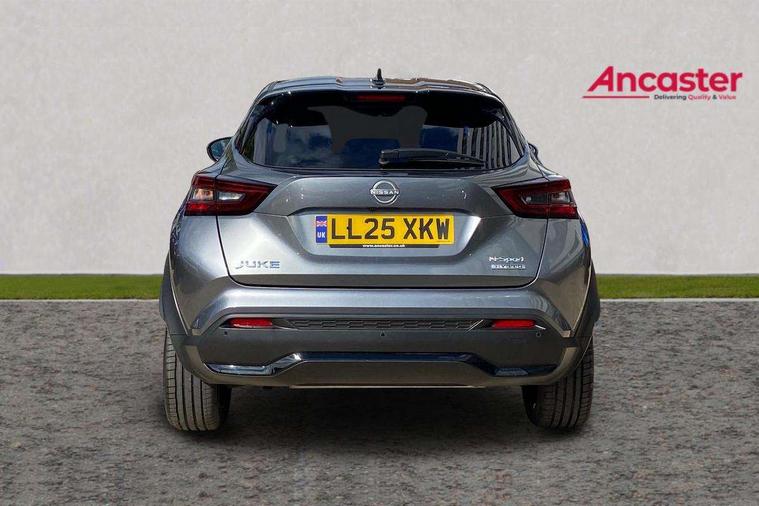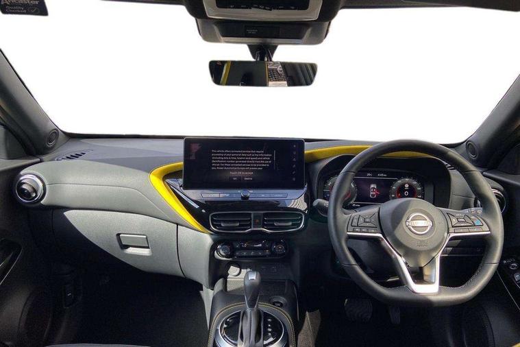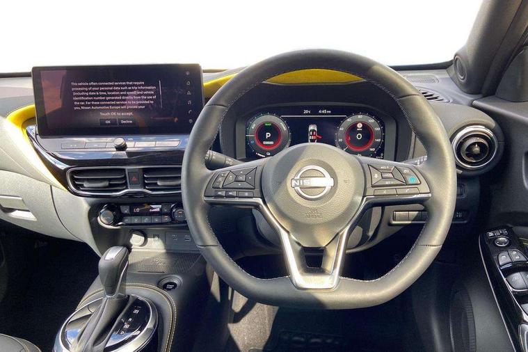 12.3" full colour TFT screen combimeter, Drive modes select (Eco, normal and sport), e-Pedal step, Emergency and breakdown call, EV mode switch, Front parking sensor, Intelligent driver alert system, Intelligent lane intervention, Lane departure warning system, Nissan connect 12.3" touch screen entertainment system, Nissan connect nav with TomTom traffic, Nissan connect services, Outside temperature sensor, Power Steering, Rear parking sensor, Stop/start button, Traffic sign recognition, Trip computer, Voice recognition, WiFi connectivity, Wireless Apple CarPlay and Google Android auto, Wireless Smartphone charger, 10 Bose speakers 8 speakers and 2 headrest speakers for driver/passenger seats, 2 X Rear console USB port, Bluetooth system, USB, Aux-in and 12V socket, Bose personal plus audio system, DAB Digital radio, Auto dimming frameless rear view mirror, Automatic hazard signal with emergency stop signal, Body colour door handles, Electrically adjustable door mirrors with integrated indicators, Follow me home headlights, Front and rear electric window with one touch driver window, High beam assist, LED 3rd brake light, LED daytime running lights, LED front fog lights, LED headlamps, LED rear fog lamp, LED rear lamps, One touch passenger window, Rear privacy glass, Rear side wing doors, Rear wiper, Roof spoiler, Shark fin roof antenna in solid Black, Solid black door mirrors, Three blink turn signal, 3 height adjustable rear headrests, 3 seat bench in 2nd row, 60/40 split folding rear seat, Card holder on driver sunvisor, Door ambient lighting, Driver seat back pocket, Driver side rear coat hanger, Driver/passenger sunvisors and vanity mirrors, Front and rear cabin lights, Front armrest, Front door pockets with bottle holders, Front head restraints, Front/rear passenger grab handles, Gear console ambient circle lighting, Height adjustable driver's seat, Internal chrome door handles, Luggage board, Luggage space lighting, Monoform sporty seats, Multifunction steering wheel, Passenger seat back pocket, Rear door bottle holders, Single front passenger seat, Smooth synthetic leather steering wheel, Synthetic leather kneepad, Synthetic leather shift knob, Telescopic steering wheel adjustment, Two cupholders in front centre console, Two rear isofix child seat anchorage points with top tether, Welcome light and console tray ambient lighting, Comfort pack - Juke, Gloss black exterior personalisation pack - Juke, Heat pack with height adjustable passenger seats - Juke, Interior personalisation pack - Juke, ProPilot pack - Juke Auto, ABS with EBD and brake assist, Active ride control, Active Trace Control, Driver and passenger airbags, Driver and passenger side airbags, Electric handbrake with auto hold function, Electronic Stability Programme (ESP), Front and rear curtain airbags, Height adjustable seatbelts, Hill start assist, Intelligent emergency braking with pedestrian and cyclist recognition, Rear door child safety locks, Seatbelt reminder for driver/front passenger and rear seats, Three 3 point rear seatbelts, Traction control, Tyre pressure monitoring system, VDC Dynamic Vehicle Control, Alarm, Immobiliser, Intelligent key and start push button with walk away lock and approach unlock functions, Remote central locking, Tyre puncture repair kit,