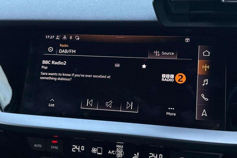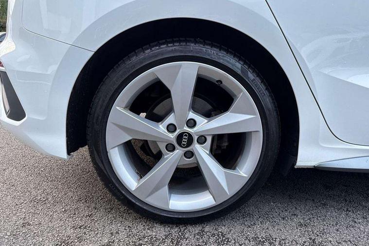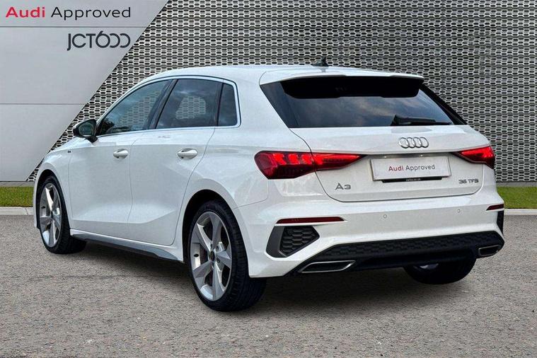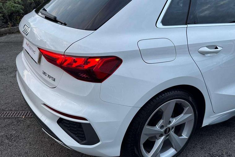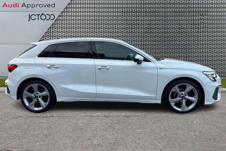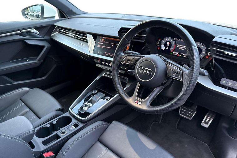 Audi connect emergency call and service, Audi drive select (Auto, Comfort, Dynamic, Efficiency and Individual), Audi smartphone interface, Audi Virtual Cockpit - 10.25" digital and colour instrument cluster, Automatic start/stop system with recuperation, Bluetooth interface, Collision avoidance assistant, Electromechanical power speed sensitive steering, Lane departure warning system, MMI Navigation Plus with high resolution 10.1" colour touch screen display, Service indicator, Trip computer, Voice control system with natural language interaction, 2xUSB-C connection with data and charging functions, 6 passive loudspeakers, DAB Digital radio, 3rd brake light, Acoustic glass windscreen, Aluminium window trim, Auto dimming frameless rear view mirror, Electrically adjustable/heated/folding/dimming door mirrors with kerb view includes integrated LED indications + kerb view function for passenger side, Front electric windows, Illuminated aluminium inserts front door sills with S logo, LED daytime running lights, LED headlights with LED rear lights and dynamic rear indicators, Light and rain sensors, Privacy glass - dark tinted rear window, rear door and side windows, Rear electric windows, Rear side air outlets in grained matt black, Rear wiper, S line bumpers, S roof spoiler, 12V socket and storage compartment in front centre console, 40/20/40 split folding rear seat bench with cupholder, Black cloth headlining, Dual zone electronic climate control, Front and rear centre armrest in leather, Front and rear headrests, Front/rear floor mats, Height and reach adjustable steering wheel, Interior lighting - glove compartment light and right hand side, Luggage compartment floor covering, Manual boot compartment lid, Manually adjustable front seats, Seat side bolsters, Stainless steel pedals and front footrest, Twin leather upholstery with front sports seats S embossed logo, Aluminium interior elements pack - A3 Sportback, S line styling pack - A3 Sportback, 3x3 point rear seat belts, Driver and front passenger airbag with passenger airbag deactivation, Electronic Stabilisation Control (ESC) including ABS, ASR and EDL, First aid kit with warning triangle and 2 safety vests, Front side airbags with head airbags and interaction airbag, Hill hold assist, Pre-sense front with pedestrian and cyclist detection, Seatbelt monitoring, Tyre pressure loss indicator, Anti theft alarm, Anti-theft wheel bolts, Electronically operated child lock, Immobiliser, Remote control central locking, Accent surfaces in the dashboard and centre console in platinum grey silk effect paint finish, Dark spectrum aluminium inlays,