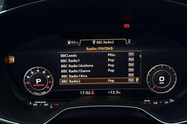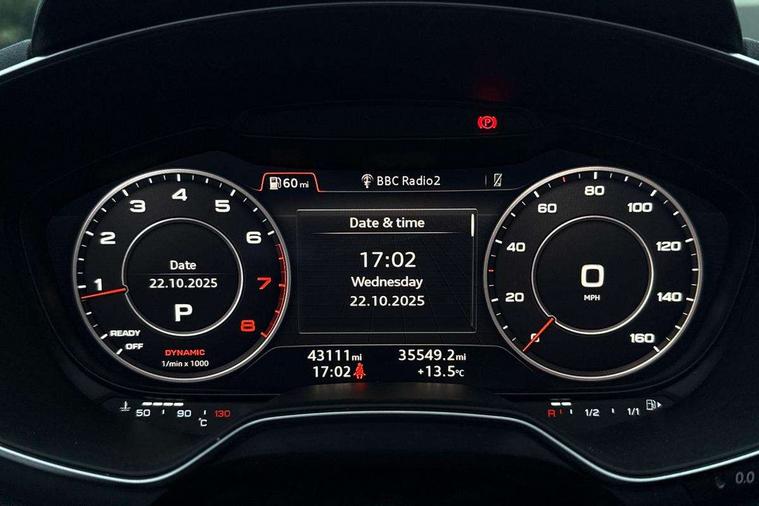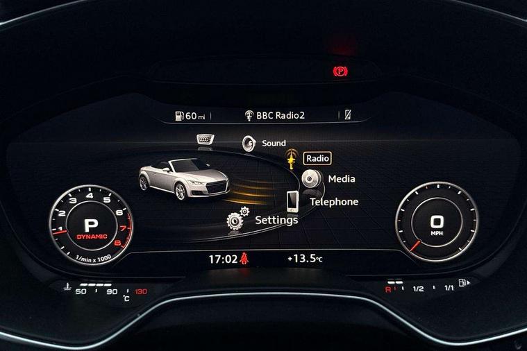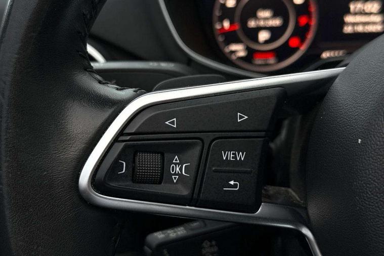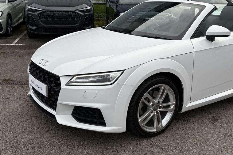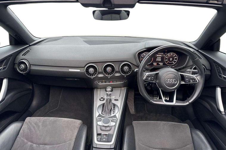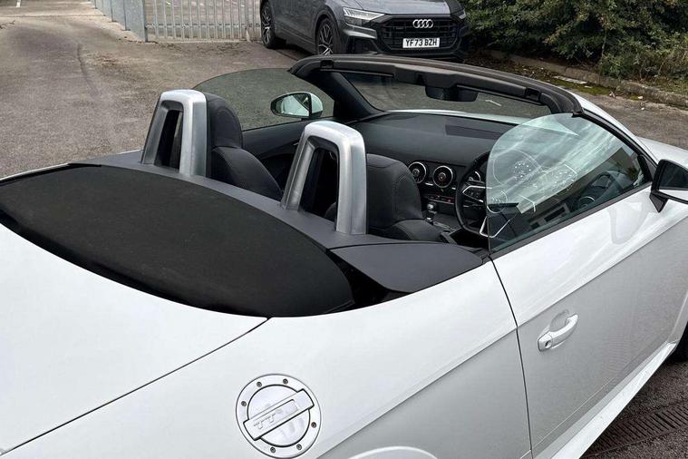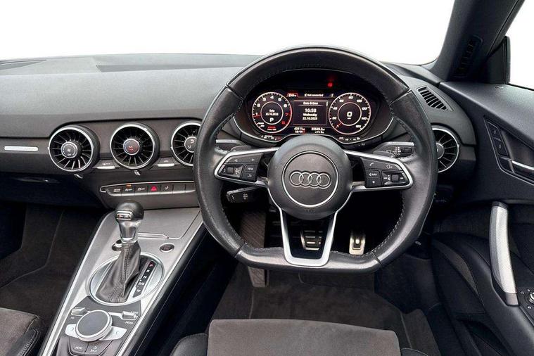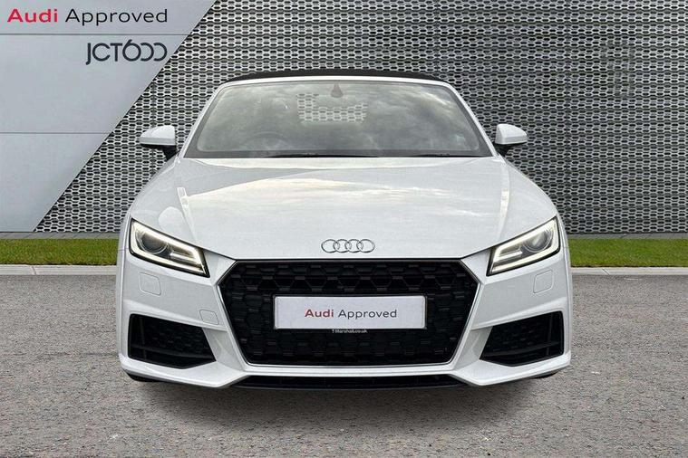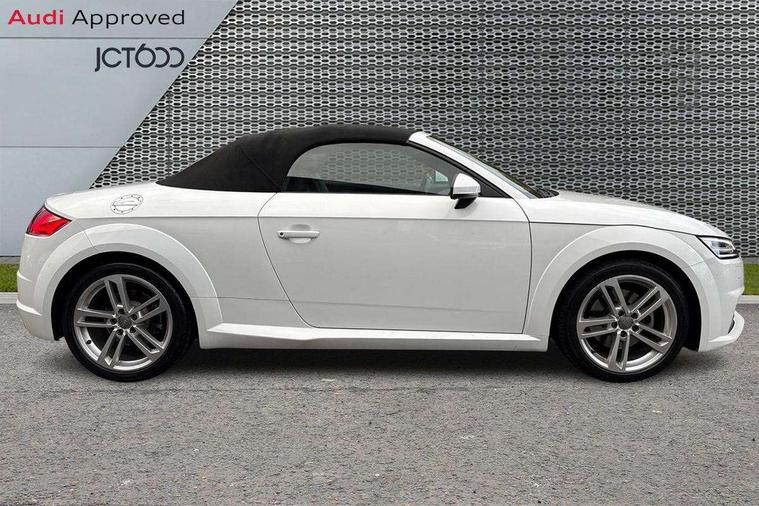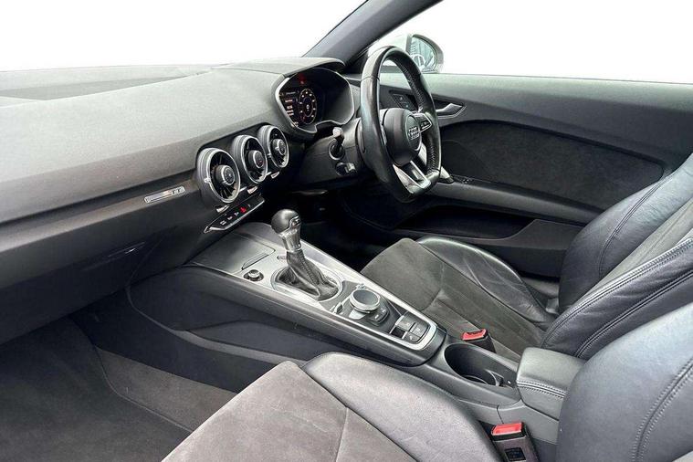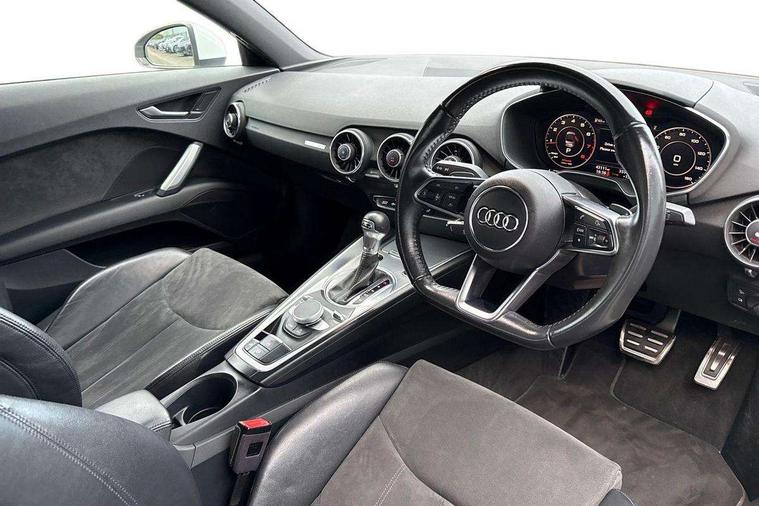 Aluminium design inlays, Non smoking pack - TT/TT RS, Tyre repair kit, Anti theft alarm, Anti theft wheel bolts, Immobiliser, Keyless Go, Remote central locking, AM/FM radio, Bluetooth audio streaming, DAB Digital radio, MMI Radio with CD player and SD/XC card slot, 3 point front seat belts, ABS, ASR traction control, Brake energy regeneration, Curtain airbags, Driver and front passenger airbag with front passenger airbag deactivation, EDL traction control, Electromechanical parking brake, ESP, First aid kit, Front side airbags, Hill hold assist, Roll over bars, Seatbelt warning, Tyre pressure warning, Warning triangle, Auto dimming rear view mirror, Body colour bumpers, Body colour electrically adjustable and heated door mirrors with built in LED side indicators, Electric folding door mirrors, Electric front windows, Front fog lights, Fully automatic acoustic hood, Green tinted heat insulating glass, Light and rain sensors, Retractable rear spoiler, Sunband for windscreen, Xenon headlights with LED daytime running lights with automatic headline range control + LED rear lights, brake lights and rear indicators, 12V socket, 3 spoke flat bottomed high multi-function leather sport steering wheel with gearshift paddles, Air conditioning, Alcantara/Leather upholstery includes seat centre panels, door trim inserts in black Alcantara with side bolsters, head restraints in black leather, Aluminium door sill trims, Front centre armrest, Front sports seats, Heated front seats, Height adjustable driver's seat, Height adjustable front head restraints, Height/reach adjust steering wheel, ISOFIX child seat mounting for front passenger seat with airbag deactivation, Reading lights, Tool kit, Audi drive select with 4 Pre configured modes, Audi smartphone interface, Audi virtual cockpit - 12.3" high-resolution LCD display with fully customisable instrument cluster, Cruise control + speed limiter, MMI touch panel, Mobile phone preparation with bluetooth interface, Progressive power assisted steering, Seat belt microphone, Service interval indicator, Start/Stop system with energy recuperation, TP memo, Sports suspension,