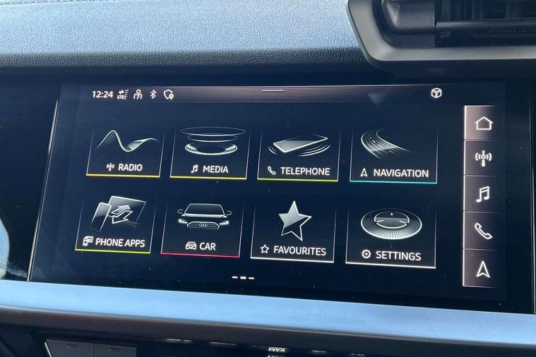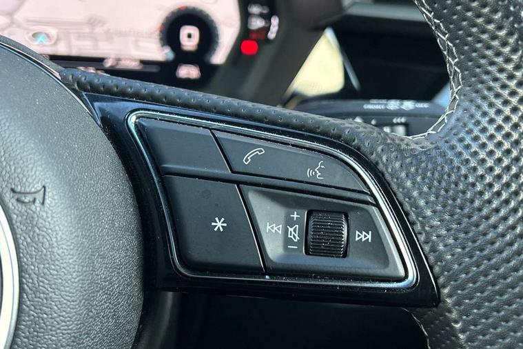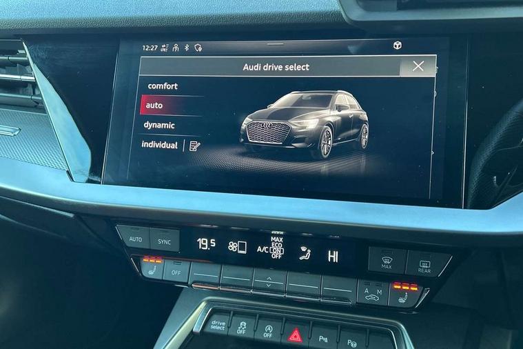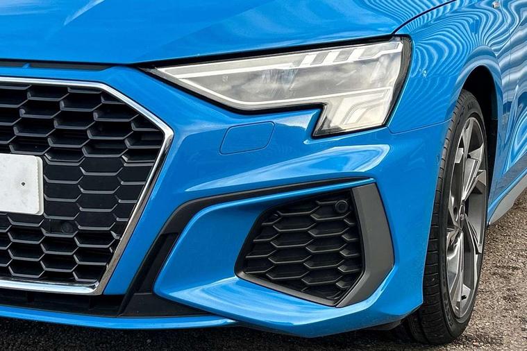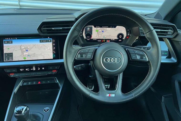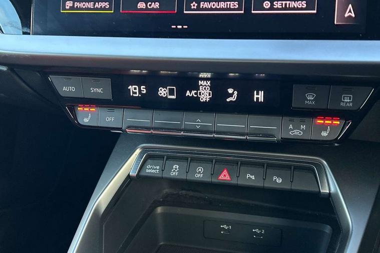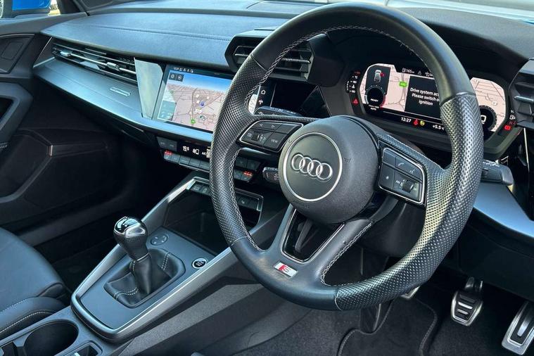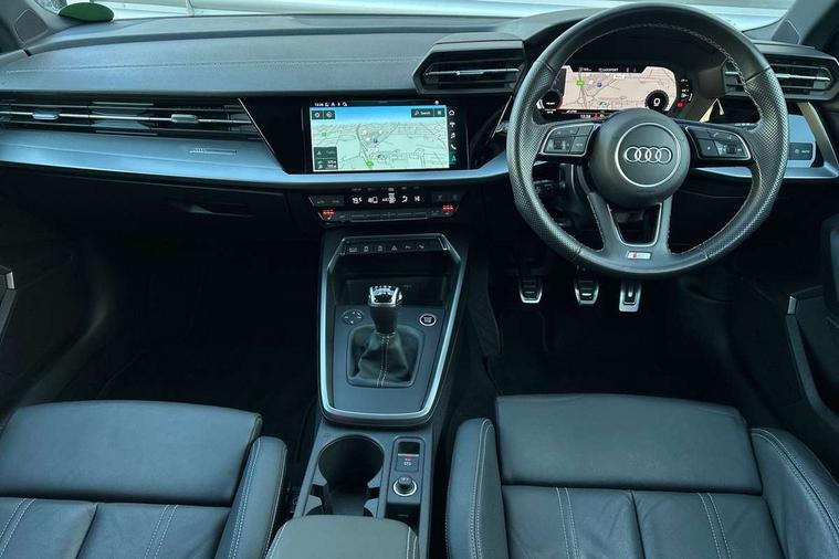 Audi drive select (Auto, Comfort, Dynamic and Individual), Audi smartphone interface, Audi Virtual Cockpit - 10.25" digital and colour instrument cluster, Automatic start/stop system with recuperation, Bluetooth interface, Collision avoidance assistant, Cruise control, e-Call (emergency call), Electromechanical power speed sensitive steering, Lane departure warning system, MMI Navigation Plus with high resolution 10.1" colour touch screen display, Rear parking sensors, Service indicator, Trip computer, Voice control system with natural language interaction, 2xUSB-C connection with data and charging functions, 6 passive loudspeakers, DAB Digital radio, 3rd brake light, Acoustic glass windscreen, Aluminium window trim, Auto dimming frameless rear view mirror, Electrically adjustable/heated/folding/auto dimming door mirrors with integrated LED indications + kerb view function for passenger side, Front electric windows, Illuminated aluminium inserts front door sills with S logo, LED daytime running lights, LED headlights with LED rear lights and dynamic rear indicators, Light and rain sensors, Privacy glass - dark tinted rear window, rear door and side windows, Rear electric windows, Rear side air outlets in grained matt black, Rear side wing doors, Rear wiper, S line bumpers, S roof spoiler, 12V socket and storage compartment in front centre console, 3 seat bench in 2nd row, 40/20/40 split folding rear seat bench with cupholder, Black cloth headlining, Dual zone electronic climate control, Front and rear centre armrest in leather, Front and rear headrests, Front/rear floor mats, Height and reach adjustable steering wheel, Illuminated vanity mirror, Interior lighting - glove compartment light and right hand side, Luggage compartment floor covering, Manual boot compartment lid, Manually adjustable front seats, Seat side bolsters, Single front passenger seat, Stainless steel pedals and front footrest in black, Twin leather upholstery with front sports seats S embossed logo, Aluminium interior elements pack - A3 Sportback, LED interior lighting pack - A3 Sportback, S line styling pack - A3 Sportback, 3x3 point rear seat belts, Audi pre sense front, Driver and front passenger airbag with passenger airbag deactivation, Electronic Stabilisation Control (ESC) including ABS, ASR and EDL, First aid kit with warning triangle and 2 safety vests, Front side airbags with head airbags and interaction airbag, Pre-sense front with pedestrian and cyclist detection, Seatbelt monitoring, Tyre pressure loss indicator, Anti theft alarm, Anti-theft wheel bolts, Electronically operated child lock, Immobiliser, Remote control central locking, Accent surfaces in the dashboard and centre console in platinum grey silk effect paint finish, Dark spectrum aluminium inlays,