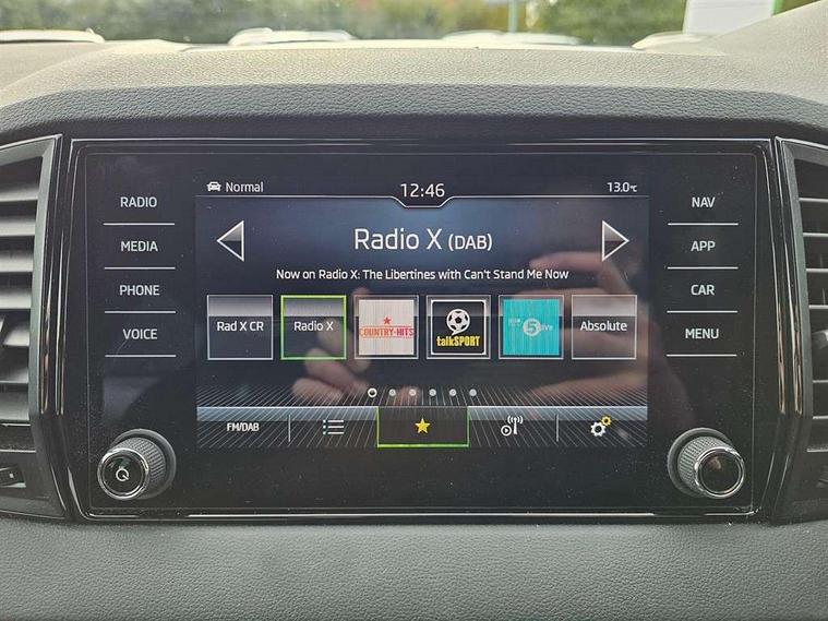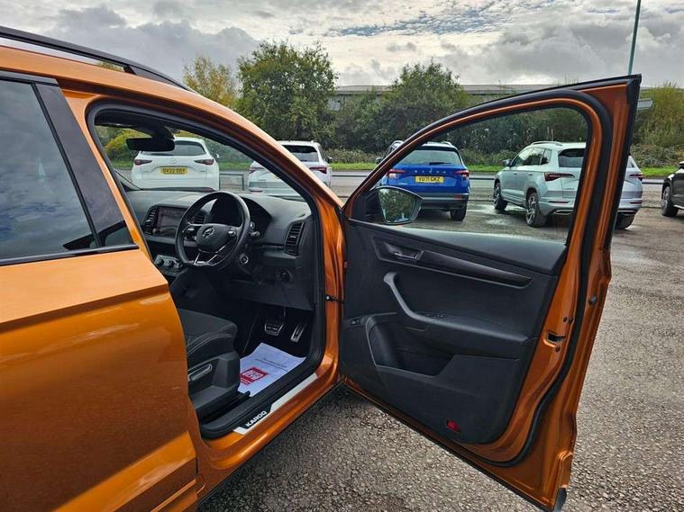 8" Digital display, Care connect, Driver fatigue sensor, Emergency services call system, Outside temperature gauge, Service interval indicator, SmartLink wireless for Apple and wired for Android, Start/stop system with regenerative braking, USB C Port x 2 in front centre console, Virtual pedal with electrically operated boot door, 8 Speakers, DAB radio with Bluetooth, USB connection, Acoustic glass, Aero front windscreen wipers with intermittent function, Auto dimming rear view mirror with light and rain sensors, Black door mirrors, Black electric window control buttons, Black radiator grille, Black roof rails, Body colour door handles, Dynamic headlight range control with cornering light function, Electric front and rear windows with child proof lock, Front door steps with SportLine logo, Heated rear windscreen, LED daytime running lights, LED rear lights with high functionality welcome effect and dynamic indicators, Light assistant (coming/leaving home/tunnel light), Panoramic sliding sunroof, Plastic scuff plates, Privacy glass, Protective door side sills in body colour, Rear diffuser, Rear side wing doors, Rear spoiler, Rear window wiper with washer system and intermittent control, Safety reflectors on front doors, Skoda lettering on tailgate in black, Sportline badge on front fender, Sportline decorative inserts with badging, Sports front and rear bumpers, 1.5 litre bottle holders in driver and front passenger door panels, 12V socket in boot, 12v socket in front centre armrest with storage compartment and rear air vents, 2 Folding hooks and nets in boot, 3 rear height adjustable headrests, 3 seat bench in 2nd row, 3 spoke leather sports multifunction steering wheel and silver stitching with gear shift paddles, 4 foldable roof handles with rear coat hooks, Black floor carpet, Black roof headlining, Chrome inner door handles, Double sided boot floor, Foldable hooks in the boot, Front head restraints, Height adjustable front three point seats belts with tensioners, Height/reach adjust steering wheel, Ice scraper, Illuminated glovebox, Illuminated luggage compartment, Isofix child seat preparation outer rear, Manual lumbar support for front seats, Pen holder, Pollen filter, Rear boot cover, Rear reading lights, Rear seats fixed folding and divided 60:40, Rubbish bin door, Safety vest holder, Single front passenger seat, Storage box in upper central dashboard closed, Sunvisors with illuminated vanity mirrors, Textile floor mats, Ticket holder, Titan black interior ceiling, Welcome animation with sportline logo, Light Pack - Karoq, Parking pack - Karoq, Automatic door unlocking in case of crash, Automatic fuel cut off in case of crash, Child locks on rear doors, Driver airbag, Electronic parking brake with auto hold function, Emergency rear braking signal, ESC including ABS, MSR, ASR, EDS, HBA, DSR, RBS, MKB and traction control, Front side airbags, Hill hold control, Knee airbags, Passenger airbag with switch-off function, Pedestrian monitor, Seatbelt reminder signalisation and pretensioner for all seats, Three point seatbelts rear, Two tone horn, Tyre pressure display, Tyre pressure monitor, Alarm with interior monitoring, back up horn and tilt sensor with safe function, Electronic engine immobiliser, Keyless entry and start/stop, Remote central locking with 2 remote folding keys, Black air vent surround, Black centre console, Satin black dashboard, Satin black door trim, 19" Sagitarius anthracite alloy wheels with matt black aero inserts, Anti-theft wheel bolts protection, Matt black aero hub caps, Storage on wheel cover, Tool kit,