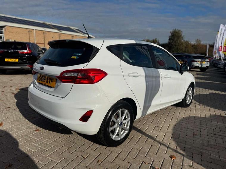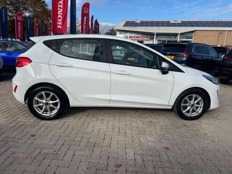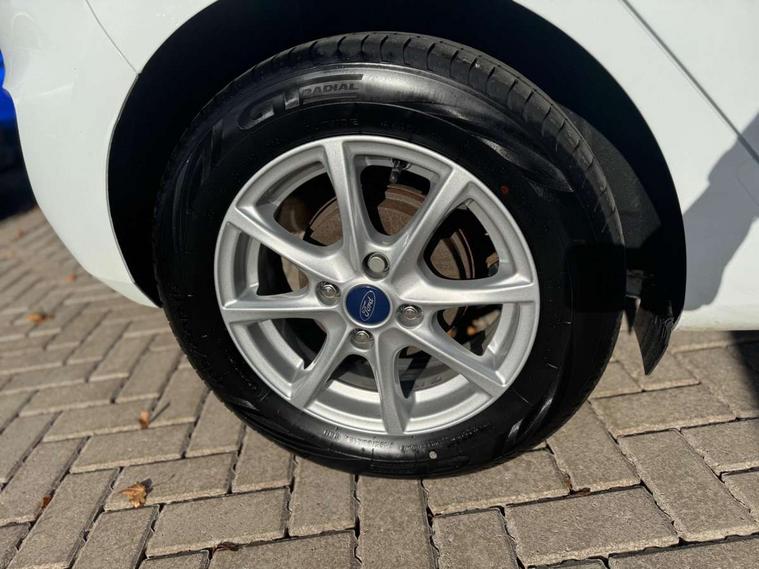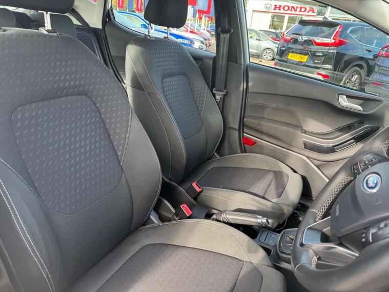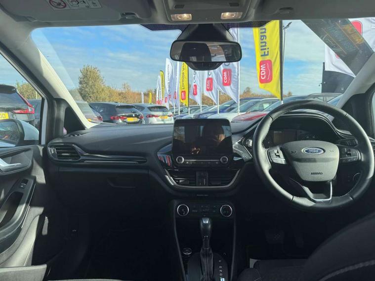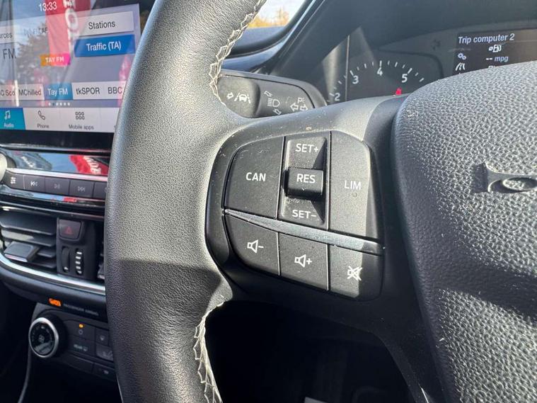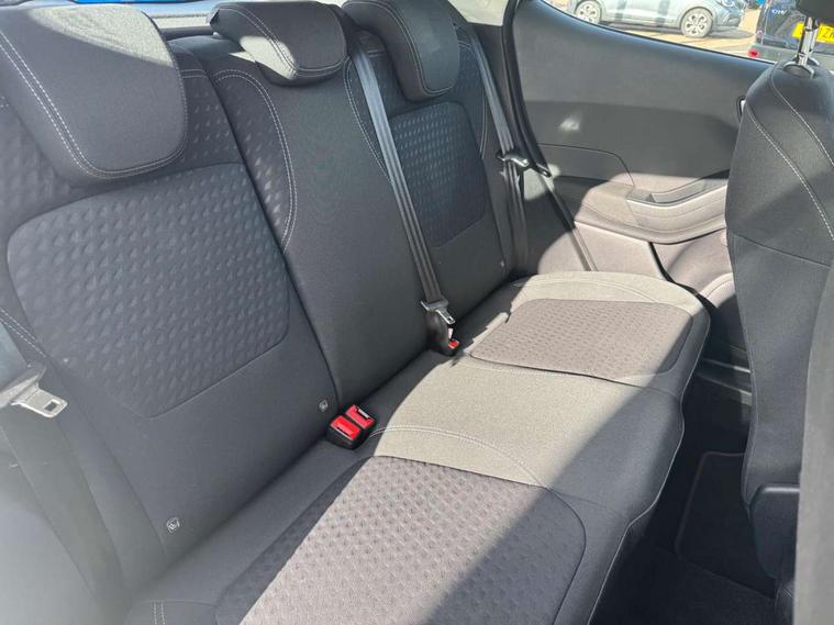 Bluetooth system, Electric power steering, Ford easy fuel, Trip computer, 2 USB ports, Auxiliary input socket, DAB Digital radio, Steering wheel mounted controls, Automatic headlights, Body colour bumpers, Body colour door handles, Body colour electric adjustable heated door mirrors with integral indicators, Body colour rear spoiler, Chrome beltline trim, Cornering front fog lights, Electric front windows/one touch facility, Halogen projector style headlights with static cornering lights + LED daytime running lights, Quickclear heated windscreen, Rear wiper, Tinted glass, Upper front grille chrome surround, 12V Accessory socket in centre console, 3 spoke leather trimmed steering wheel with audio control, 60/40 split folding rear seat, Adjustable head restraints, Boot carpet, Chrome inner door handles, Cloth upholstery, Footwell illumination, Front map reading lights, Front seat and rear pockets, Height adjustable driver's seat, Illuminated glovebox, Leather gear knob, Leather trimmed handbrake handle, Load area light, Luxury woven headliner, Manual air conditioning, Overhead console with sunglasses holder, Pollen filter, Rake/reach adjustable steering wheel, Rear centre head restraint, NCAP Pack - Fiesta, 3 point seatbelts on all rear seats, ABS+EBA, Curtain airbags, Driver and passenger airbags, Drivers knee airbag, Electronic stability control with hill start assist, Front passenger airbag deactivation, Front side airbags, Seatbelt warning, Tyre pressure monitoring system, MyKey system, Remote central locking & engine immobiliser, Thatcham Cat.1 alarm,