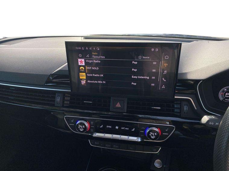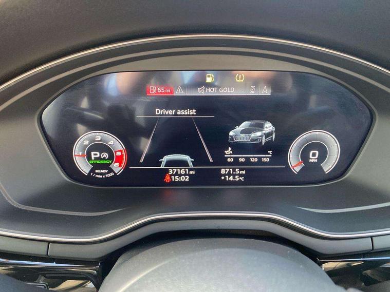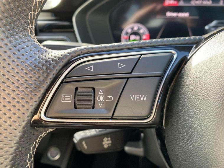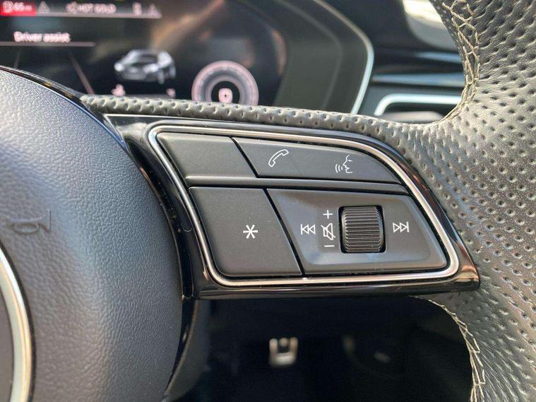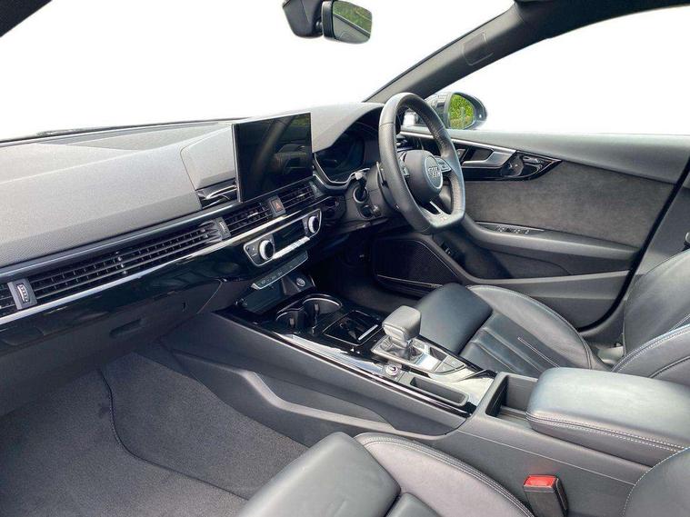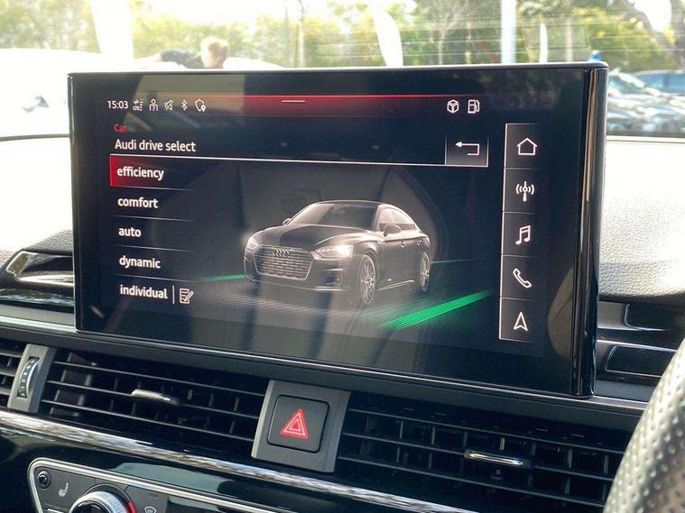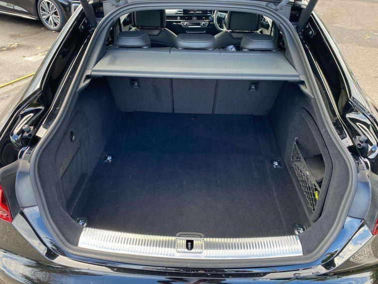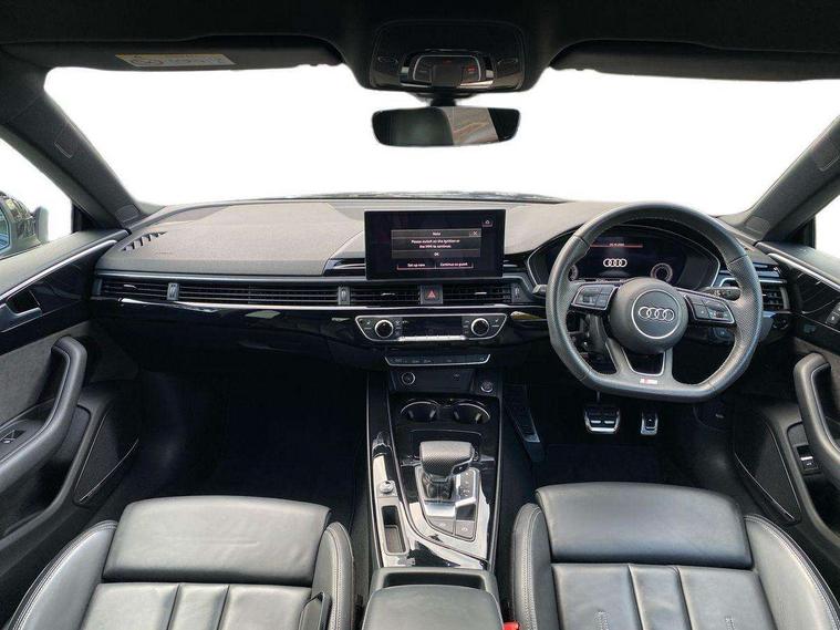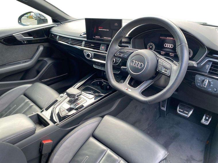 Audi connect safety and service (e-call), Audi drive select (Auto, Comfort, Dynamic, Efficiency and Individual), Audi parking system plus with front and rear sensors, Audi phone box with wireless charging, Audi smartphone interface, Audi virtual cockpit - 12.3" full colour digital instrument cluster, vehicle/engine speed, Radio/media information+Driver assistance systems, Automatic start-stop system with coasting functionality and efficiency programme, Bluetooth interface, Electro-mechanical power steering, Email, calendar and text messages displayed via MMI, MMI nav+ with MMI touch - 10.1" high resolution MMI display, touch sensitive, 3D map, route/country info, dynamic route guide, personal route assist, Power operated tailgate, Rear view camera, Service interval indicator, Voice control system, Diesel particulate filter, Sports suspension lowered by 23mm, 8 passive loudspeakers, CD player, DAB digital radio reception, Two additional USB ports for rear passenger in rear centre console, Two SDXC card slots, Auto dimming rear view mirror, Black door mirror housings, Body colour bumpers, Body colour door handles, Body colour front spoiler lip, Body colour side sill trim, Electric adjustable heated door mirrors, Electric folding door mirrors, Electric front windows, Front fog lights, Honeycomb structure radiator grille in grained matt black, Matrix LED headlights with Audi laser light, dynamic light sequencing and dynamic indicator, Matt aluminium silver tailpipe trim, Privacy glass, Rain and light sensors, Rear diffuser in matt titanium black with trim strip in matt aluminium silver, Side air inlets in grained matt black with matt aluminium silver inlay, Sport front and rear bumpers with side skirts, Towbar preparation, Windscreen with acoustic glazing, 4 way electric lumbar support for driver and front passenger, 40/20/40 split folding 3 seater rear bench seat, Adjustable steering column, Black cloth headlining, Black perforated leather gearknob, Contrast stitching on seats, steering wheel and gear lever gaiter, Deluxe 3 zone electronic climate control, Electrically adjustable front seats, Fine Nappa leather upholstery with front sports seats S embossed logo, Front centre armrest, Front head restraints, Front/rear floor mats, Heated front seats, Illuminated door sill trim with S logo, ISOFIX child seat mounting and top tether, Luggage compartment mat, Rear headrests, Stainless steel pedals, Sunvisors with vanity mirrors, Tool kit, Black styling pack - A5 Coupe/Sportback, LED interior light pack - A5/RS5, 3x3 point rear seatbelts, 6 airbags - Driver, front passenger, curtain and side airbags, Electromechanical parking brake, Electronic Stabilisation Control (ESC) including ABS, ASR and EDL, Front passenger airbag deactivation, Height adjustable front seatbelts, Hill hold assist, Multi collision brake assist, Pop-up bonnet for pedestrian protection, Seatbelt monitoring, Tyre pressure warning, Variable restraint system, Warning triangle and first aid kit, Anti theft alarm system, Anti theft wheel bolts, Immobiliser, Keyless Go, Remote central locking, Piano black finish inlay, 20" 5 twin spoke polygon design alloy wheels in gloss anthracite black and gloss turned finish, Tyre repair kit,