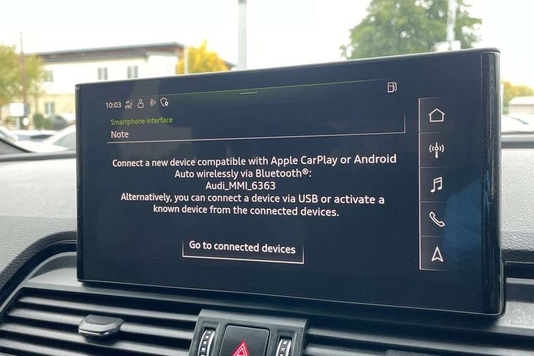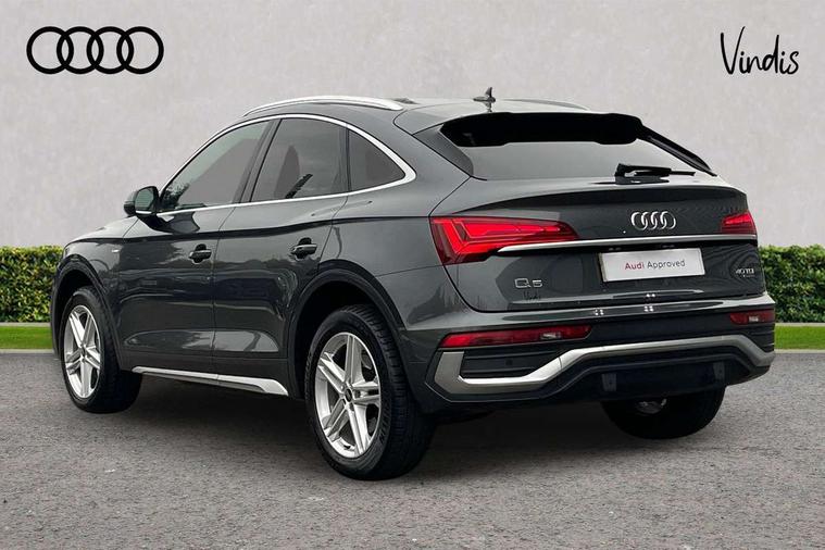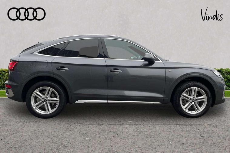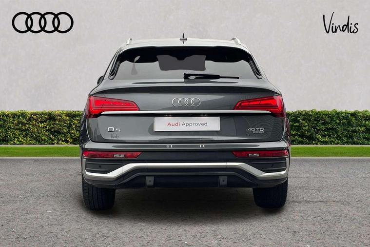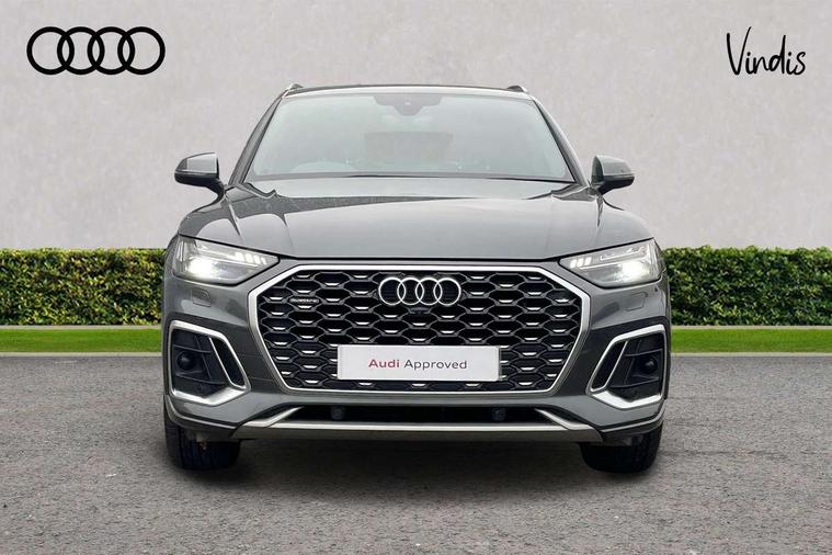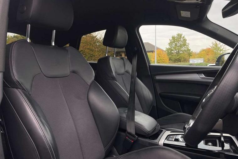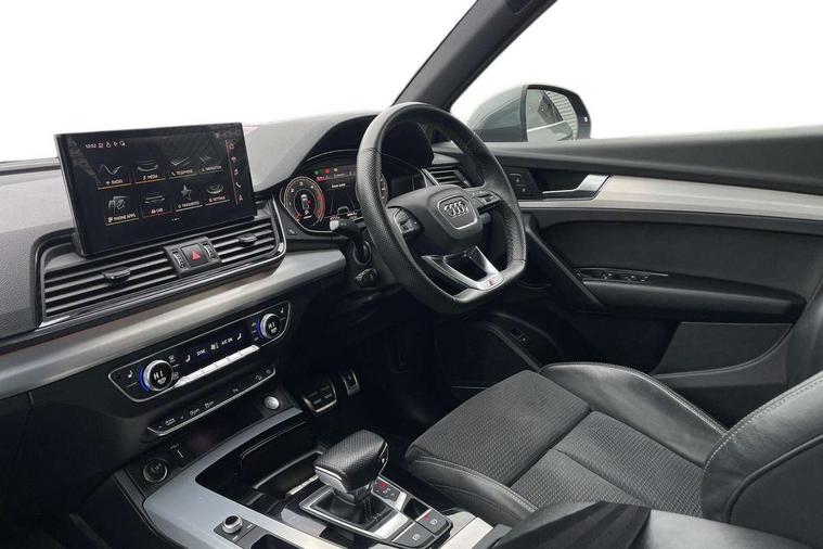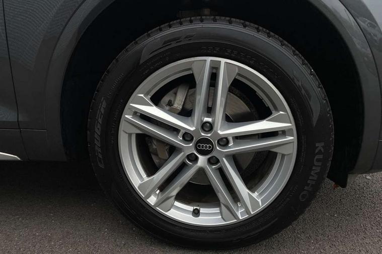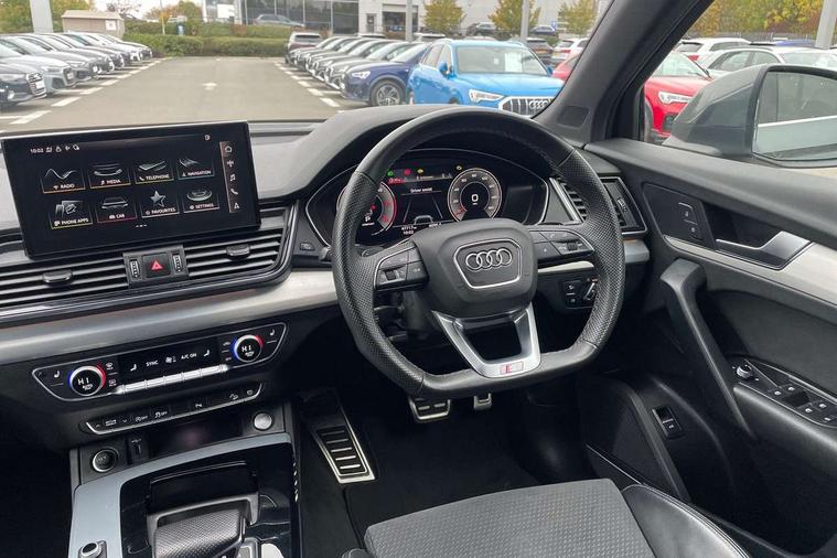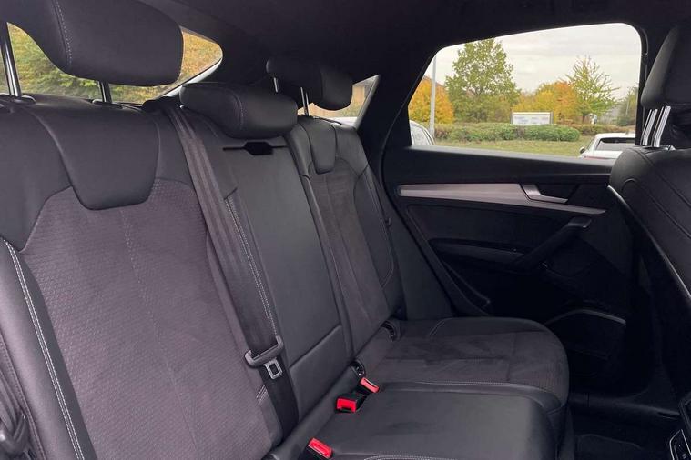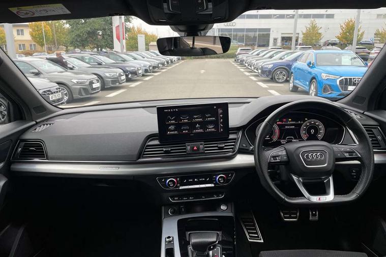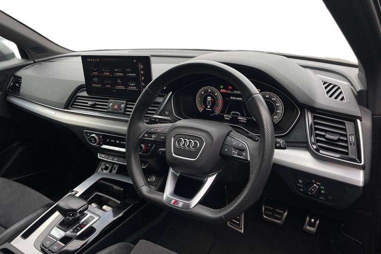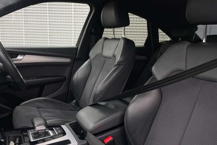 Acoustic front and rear parking sensor, Audi connect safety and service (e-call), Audi connect with Amazon Alexa Integration, Audi drive select, Audi virtual cockpit plus with 12.3" screen and three different layout designs, Audi wireless smartphone interface, Automatic start-stop system with coasting functionality and efficiency programme, Bluetooth interface, Electro - mechanical power assisted steering, MMI navigation plus with 10.1" touch screen, Power tailgate, Reversing camera, Service interval indicator, Voice control system with Audi hotword activation "Hey Audi", Diesel particulate filter, Quattro on demand, S line sports suspension, 2 x USB charging port with aux input socket, 8 loudspeakers, DAB Digital radio, Acoustic windscreen, Aluminium roof rails, Audi matrix LED headlights with dynamic front and rear indicators, Auto dimming door mirrors, Auto dimming frameless rear view mirror, Automatic headlight adjustment, Automatic headlights and windscreen wipers, Body colour door mirrors, Body colour rear diffuser with matt aluminium silver surrounds, Body colour underbody protection, Chrome plated exhaust trims, Daytime running lights, Door sills in Selenite silver, Electric adjustable/heated/folding door mirrors, Front air inlet surrounds in aluminium, Front and rear electric windows, Front radiator grille in honeycomb design, Headlight washers, High level LED brake light, Lower bumpers painted in contrast Manhattan grey, Rear chrome trim strip below lights, Rear privacy glass and rear side windows, Rear side wing doors, Rear wiper, Roof bars, S Line badges on the front wings, S Line front and rear bumpers, S Line rear spoiler, S Line side skirts, 3 rear headrests, 3 spoke leather multifunction steering wheel with S badging perforated leather grips, 40:20:40 split folding 3 rear bench seat in 2nd row with rear centre armrest, Black cloth headlining, Comfort front centre armrest, Contrast stitching on seats, steering wheel and gear lever gaiter, Deluxe 3 zone electronic climate control, Front head restraints, Front/rear floor mats, Gear lever in black leather, Heated front seats, Height/reach adjustable steering column, Illuminated door sill trims with S logo, Manual seat adjustment with 4-way electric lumbar support, Removable luggage compartment floor, Single front passenger seat, Stainless steel pedals, Sunvisors with vanity mirrors, Trunk roller cover, High gloss pack - Q5, LED interior light pack - Q5, 3 point seatbelts on all seats, 6 airbags - Driver, front passenger, curtain and side airbags, Electrically operated child locks on rear doors, Electromechanical parking brake, Electronic stabilisation control including ABS, ASR and EDL, First aid kit with warning triangle and vests, Front passenger airbag deactivation, Hill descent control, Hill hold assist, ISOFIX child seat mounting for front passenger seat and ISOFIX child seat mounting with Top Tether for outer rear seats, Multi collision brake assist, Pop-up bonnet for pedestrian protection, Pre sense city, Seat belt force limiter, Seatbelt monitoring, Tyre pressure warning, Anti theft alarm, Anti-theft wheel bolts, Keyless Go access/ignition system, Remote central locking, Air vents inserts and centre console in gloss black, Matt brushed aluminium inlays,
