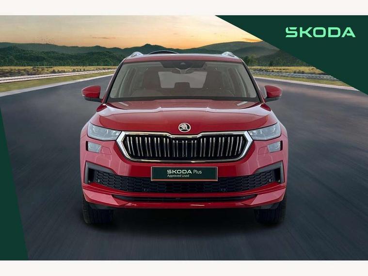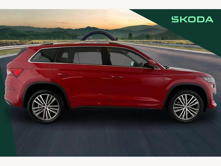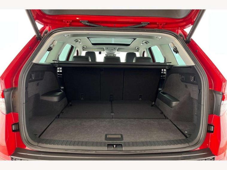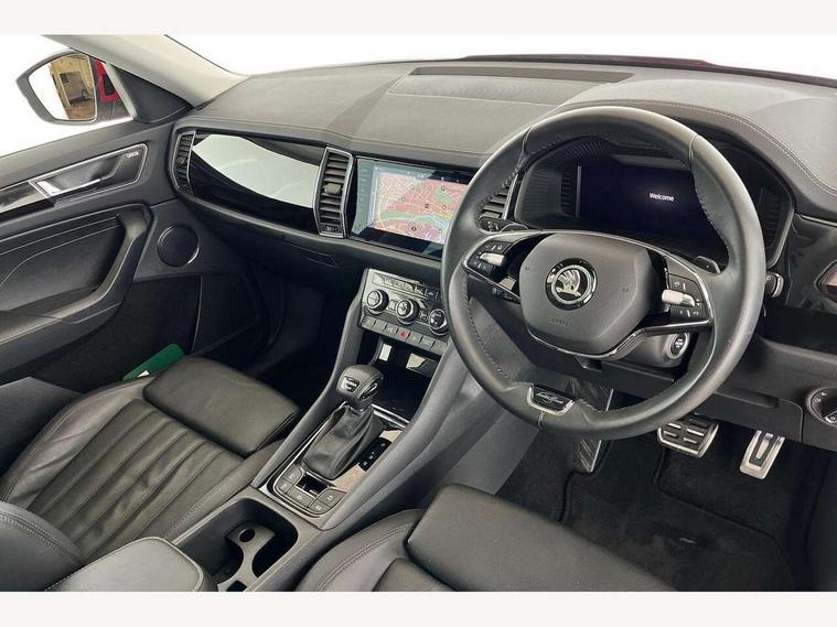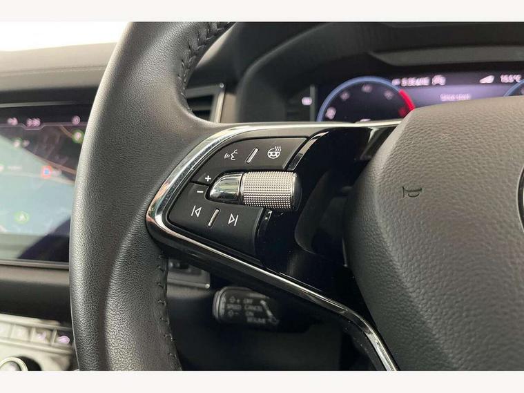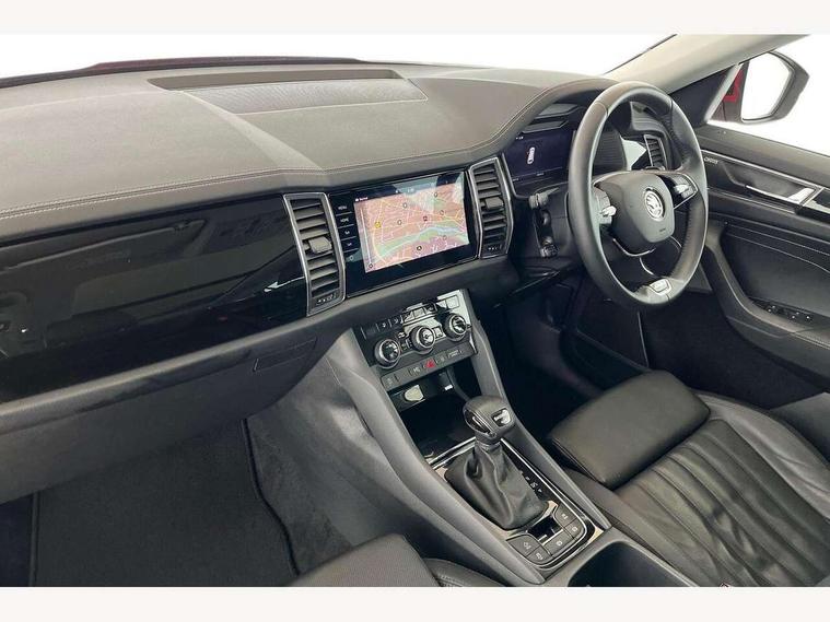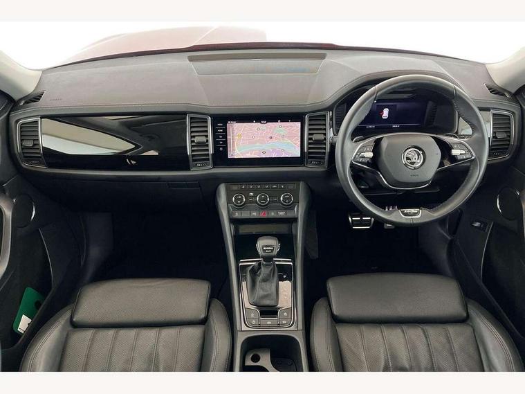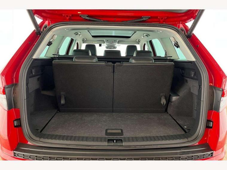 Area view, Blind spot detection system, Bluetooth system, Columbus satellite navigation with 9.2" touchscreen, integrated Wi-Fi, web radio, Digital voice enhancement, e call+, ECO Stop/start function, Exterior temperature indicator, Progressive steering, Smartlink wireless for apple carplay and wired for android auto, Speed limiter, Tailgate unlocking from outside, USB C Port x 2 in front centre console, Virtual Cockpit - 10.25" digital display, Wireless charging, Canton sound system, DAB Digital radio, Aero front windscreen wipers with intermittent function, Aero rear window wiper, Auto dimming rear view mirror, Black wheel arch surrounds, Body colour bumpers, Body colour door mirrors and handles, Body colour door panels, Chrome front grille, Chrome roof rails with chrome window surround, Electric adjustable/heated/folding door mirrors, driver side auto dimming with boarding sports and memory function, Electric front and rear windows, Extended rear spoiler with finlets in gloss black, Front fog lights, Full LED matrix headlights with AFS (adaptive front light system), cornering function and AWL (all weather lighting system), Headlight washers, Heated rear window, Invisible tailpipe, L&K front and rear bumpers including lower rear chrome strip, LED daytime running lights, LED rear fog light, LED third brake light in rear spoiler, Light assistant (coming/leaving home/tunnel light), Off-road style lower front bumper element, Panoramic sunroof, Privacy glass, Rain and light sensors, Rear LED lights (high functionality) with welcome effect and dynamic indicators, Rear side wing doors, Safety reflectors on front and rear doors, Window control switches with black trim, Without engine designation, 12V socket in boot, 2 rails with 2 hooks, 2 seat bench in 3rd row, 3 seat bench in 2nd row, 4 foldable roof handles with rear coat hooks, 60:40 foldable rear seat with sliding adjustment and backrest angle adjustment, Aluminium pedals, Bottle holders in door panel in the 1.5 litre front and 1 litre rear, Cargo storage compartments, Chrome headlight control button, Chrome interior door handles, Coat hooks on B pillar, Covered storage compartment on driver side, Decorative door sill covers, Front centre armrest with storage compartment, cup holder and 12V socket, Front courtesy lights, Gear shift lever with chrome frame and black gloss insert, Grey stitching in front and rear armrests and door armrests + door inserts, Height adjustable front headrests, Illuminated and cooled glovebox, Illuminated luggage compartment, Isofix child seat fittings in outer rear seats with top tether, Manually adjustable steering column, Net programme in boot (1x horizontal Net, 2x vertical Nets), Overhead glasses storage compartment, Pollen filter, Rear centre armrest with cupholders, Single front passenger seat, Sliding trunk cover, Small Bags on the inner sides of the front backrests, Sunvisors with illuminated vanity mirrors, Three rear height adjustable headrests, Ticket holder on A Pillar, Umbrella in door panel, Variable boot floor, LED Interior light pack - Kodiaq, Auto door release and activation of warning lights in the event of an accident, Child locks on rear doors, Driver and front passenger airbag with knee airbag and front passenger airbag deactivation, Electronic parking brake with hill start assist, Emergency rear braking signal, ESC (incl. ABS+MSR+ASR+EDS+HBA+DSR+RBS+MKB), Front assist with autonomous emergency braking, Front side airbags with curtain airbags, Fuel cut off safety device, Height adjustable front 3 point seatbelts + pretensioners, Hill hold control, Rear disc brakes, Safety vest holder in door, Seat belt reminder for all seats, Three point rear seat belts, Two tone horn, Tyre pressure monitor, Alarm with interior monitoring and tilt sensor with safe function, Anti-theft wheel bolts, Immobiliser, Keyless entry and start system (KESSY), Remote central locking with 2 keys, Grey stitching in dashboard, Piano black decorative inserts, Plaquette L&K front fenders, Temporary spare wheel (space saver),