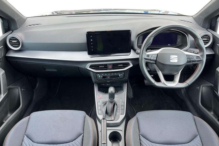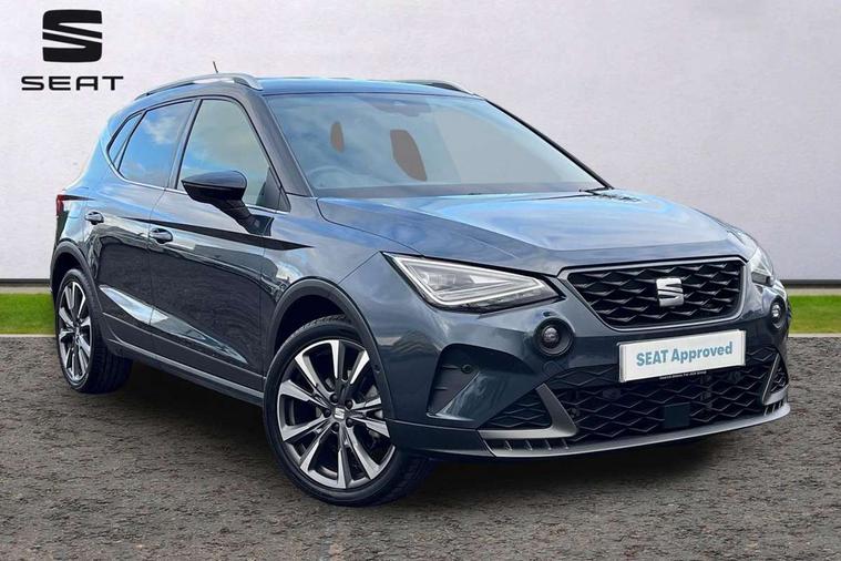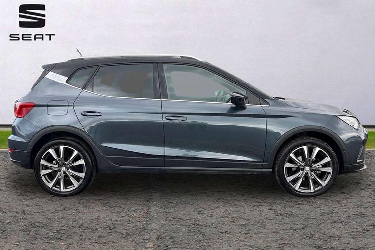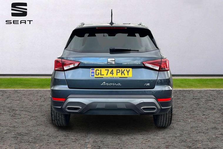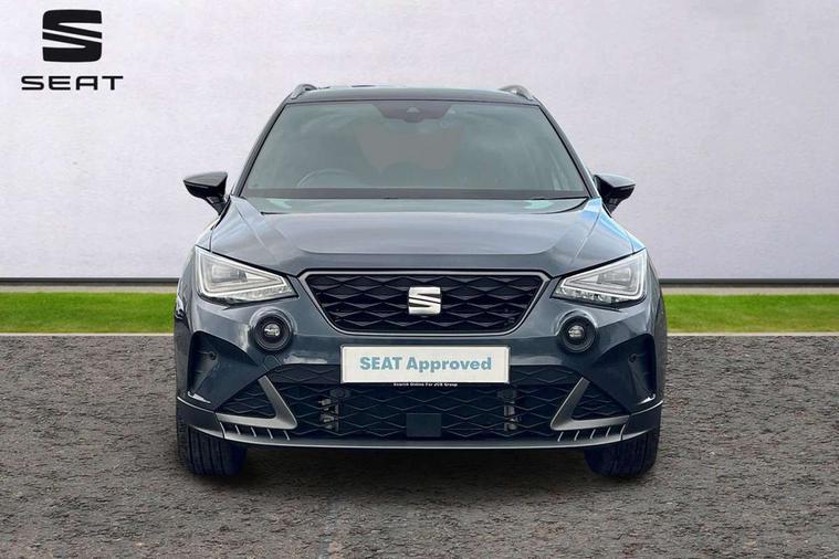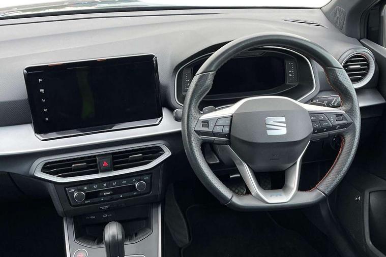 'Lights On' Reminder warning buzzer, 10" Digital cockpit, Digital clock, E-call, Electric speed sensitive power steering, Full Link Smartphone Integration with Mirror Link, Apple Car Play, Google Android Auto with USB Type C cable for Apple and Android compatibility, Lane keeping system, Low fuel warning light, Outside temperature display, Park assist system, Rear view camera, RPM counter, SEAT Drive profile - Four different models normal-sport-eco-individual, steering response, throttle response and gear shifts mode, Trip computer, Wireless phone charger, 9.2" colour touchscreen with navigation system, voice control and USB port (type c), Bluetooth interface for hands free and audio streaming, DAB digital radio and AM/FM radio, Steering wheel mounted audio controls, Anti theft roof antenna, Auto dimming interior rear view mirror, Automatic activation of hazard warning lights, Body coloured bumpers, Body coloured door handle inserts, Chrome roof rails and window surrounds, Dark tinted rear windows, Electric front/rear windows, Electrically adjustable, heated and folding door mirrors, Front fog lights with cornering function and rear fog light, FULL LED automatic headlights with dynamic headlight range control, coming and leaving home, LED daytime running lights, LED rear tail lights and licence plate lights, Protective side mouldings, Rain sensing wipers, Rear side wing doors, Rear spoiler, Rear window wash/wipe, Roof colour door mirrors, Third brake light, Twin exhaust pipe styling hidden exhaust pipe, Visible VIN plate, 2 cupholders, 3 seat bench in 2nd row, 60/40 split folding rear seat, Aircare filter, Black interior roof, Double boot floor, Driver sunvisor with covered mirror + card holder, Dual zone climate control, Front courtesy light with front reading lights, Front sport seats, Gear shift indicator, Grey interior air vents, Height adjustable front seats, Height/reach adjustable steering column, Illuminated boot, Instrument lighting with brightness control, Interior ambient lighting, Interior light in footwell, central console and door panel, ISOFIX points in outer rear seats with top tether anchorage points, Microsuede cloth upholstery + sports bucket seats, Passenger sunvisor with vanity mirror, Perforated flat bottomed leather steering wheel/gear knob/handbrake with red stitching and FR logo, Potentiometer, Single front passenger seat, Steering wheel mounted gearshift paddles, Two front and three rear height adjustable headrests, Interior chrome pack - Arona, Safe and driving pack (S) - Arona, 3 point seatbelts on all rear seats, ABS, Active front headrests, Child locks on rear doors, Driver and front passenger airbags with front passenger airbag de activation, front side and curtain airbags, Electronic Stability Control (ESC), Emergency Brake Assist (EBA) and front assist, Front and rear seatbelt reminder, Hill hold control, Multi-Collision braking, Tiredness recognition system, Traction control, Tyre pressure monitoring system, Alarm with back-up horn, Electronic engine immobiliser, KESSY Keyless entry and go, Locking wheel bolts, Remote central locking + deadlocks, Tow away protection, Titan black dashboard, 18" Performance Cosmo grey alloy wheels,