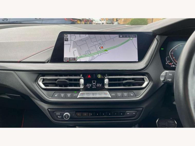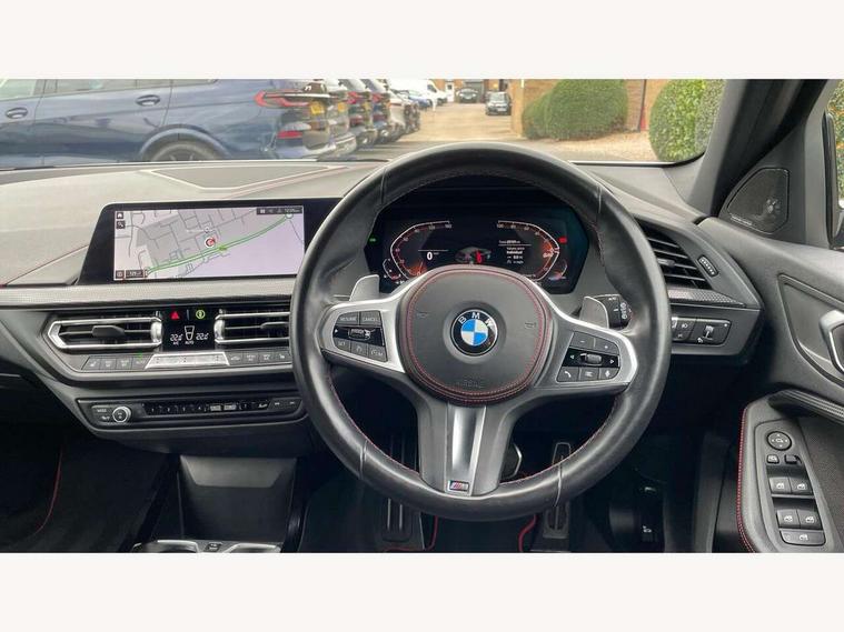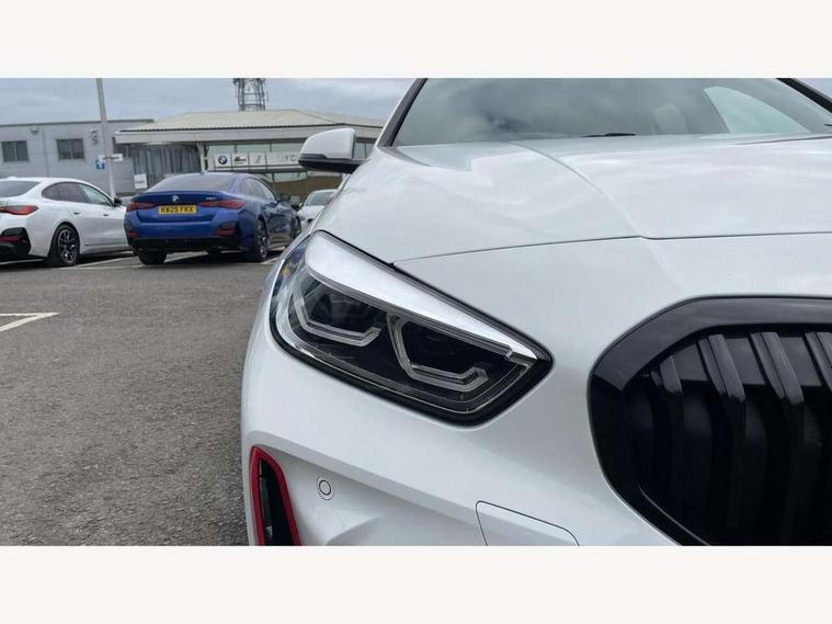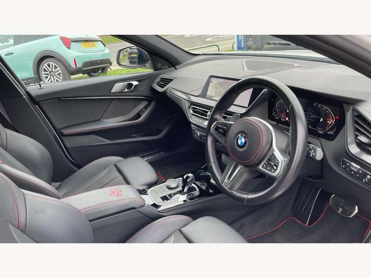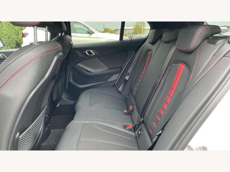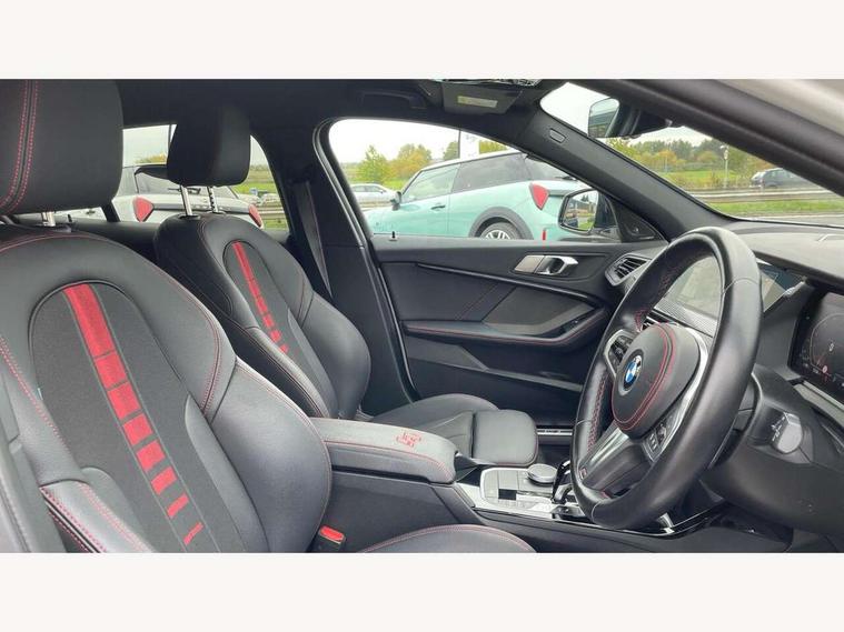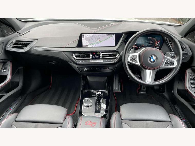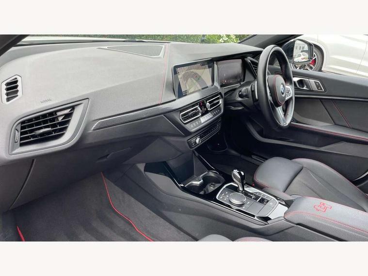 Active guard plus, Attentiveness assist, BMW ConnectedDrive online services, BMW Teleservices, Check Control warning system for monitoring of lights and door/luggage compartment open warning, Cruise control with brake assist, Eco pro mode, Electric power steering with Servotronic steering optimised at all speed ranges, Front axle single joint with specific axle kinematics to minimise drive influences on steering + provide increased rigidity agile driving behaviour, Integrated owners handbook, Lane departure warning system, Oil sensor for level and grade, On board computer, Optimum shift indicator, Personal Profile, Pull away assistant, Rigidly mounted rear subframe - Multi link construction with separate spring / damper configuration and excellent driving characteristics, Speed limit Info including no-overtaking indicator, Speed limiter, Aluminium lightweight construction, Anti roll bar front and rear, Balancer shaft, Double VANOS twin scroll turbocharging system, Drive Performance Control, Eight speed sport automatic transmission with gearshift paddle switches, Electronic differential lock, High precision injection, Larger fuel tank capacity (50 litres), M sport suspension with M128i xDrive specific settings, Petrol Particulate Filter, Twin tube gas filled shock absorbers with degressive characteristic curve, VALVETRONIC engine management, DAB Digital radio, Auto dimming rear view mirror, Automatic headlight beam throw control, Automatic windscreen wipers and automatic headlight, Black chrome tailpipe finishers, BMW individual high gloss shadow line with extended content, Body colour door handles, Body colour mirror caps, Body colour roof trims, Chrome 'M' logo side designation, Chrome kidney grille frame with Satin Aluminium struts, Direction indicator side lights in exterior mirrors, Fading support, Folding side mirrors with auto dimming/folding wing mirrors with auto dimming, Follow me home headlights, Front and rear bumper system with replaceable deformation elements, Front and rear electric windows with open and close fingertip control, anti trap facility and comfort closing, Front door sill finishers in black plastic with M designation in metallic look, Green tinted heat protection glazing, Heated, electrically adjustable exterior mirror aspheric on driver side, convex on passenger side, High gloss shadowline window frame, Recess cover mirror frames and B/C pillar embelisher trim, High level third brake light, Integrated front windscreen with washer jets, Kidney frame and struts in high gloss black extended, LED daytime running lights, LED eyebrow turn indicators, LED front fog lights, LED Headlights, Lightweight engineering, Matt black air guide grilles, Matt black wheel arch trim, Model designation on electric bootlid, Nearside reverse light in rear light cluster, Preparation for high beam assistant, Rear fog lights, Rear side wing doors, Rear window wiper, Shark fin antenna, Trailer stabilisation logic, Visible VIN plate, Welcome lighting, 12V power socket in front centre console with blanking plug, 3 rear seat head restraints, 3 seat bench in 2nd row, Anthracite headlining, Black boot net with lashing eyes, Cargo function on 2nd seat row, Centre armrest in black/red highlight including embroidered 'ti' designation in red, Child seat ISOFIX attachment for two outer rear seats and front passenger seat with anchorage points, Conditioned based service, Driver and front passenger seat heating, Floor mats with red binding, Folding rear clothes hook, Four grab handles integrated in roof lining, Front and rear door pockets with bottle holders, Front and rear side armrest integrated into door trim, Front armrest, Front sports seats, Glove compartment, Height adjustable front head restraints, Instrument panel top section , door armrests and door panels in black/red highlight, Luggage compartment for bag hooks on left and right, foldable luggage compartment liner and four lashing eyelets, Manual adjust steering wheel, Multi-function controls for steering wheel, Single front passenger seat, Storage compartment in centre console, Sun visors with vanity mirrors and insert tab, Three spoke M sport design multi function leather steering wheel in unique red stitching, Two front centre console cupholders, Two zone automatic air conditioning, Additional interior lighting pack - 1 Series, BMW live cockpit professional pack- 1 Series, Connected pack professional - 1 Series, Interior lights pack - 1 Series, M Sport exterior styling aerodynamics pack - 1 Series, 2 tone horn, 3 point seatbelts on all seats, front pyrotechnic belt tensioners, stopper and belt force limiters, rear coded belt buckles, Airbags - Front driver/passenger, front and rear curtain head protection, front side, manual deactivation of front passenger airbag, Anti lock braking system (ABS) with brake assist, BMW emergency call, Brake drying, Braking readiness, Child proof locking system in rear door, City braking function, Comfort modes, Cornering brake control, Crash sensor activating central locking release, hazard warning lights, fuel cut off, interior lighting + activation of safety battery terminal clamp, Driver and front passenger seat belt security check, Dynamic stability control + (DSC+), Dynamic Traction Control - DTC, Electrically operated hand brake including automatic hold function, Front and rear disc brakes, M Sport brakes with red calipers, M Sport seatbelts, Seatbelt warning, Side impact protection, Tyre pressure monitoring system, Warning triangle and first aid kit, Central locking switch for all doors, fuel filler cap and luggage compartment, Deadlocking function system to all doors, Drive away locking system on all doors and luggage compartment with de-activated in iDrive settings, Locking wheel bolts, Remote control with integrated key with High-gloss Black inlay and M designation and 1 button for open/ close lock, window, open luggage compartment, Start/stop button illuminated in centre console with keyless e