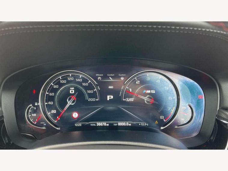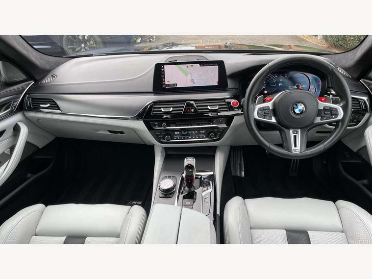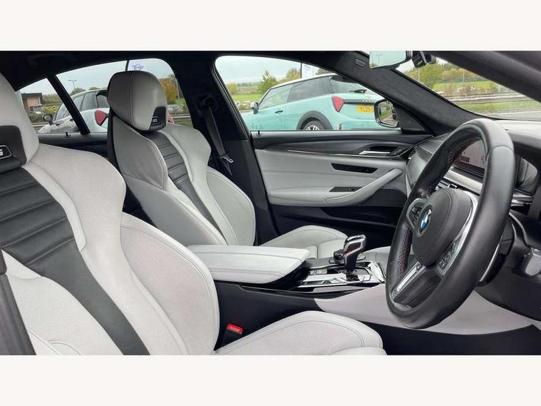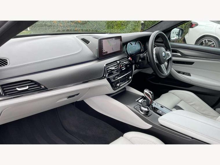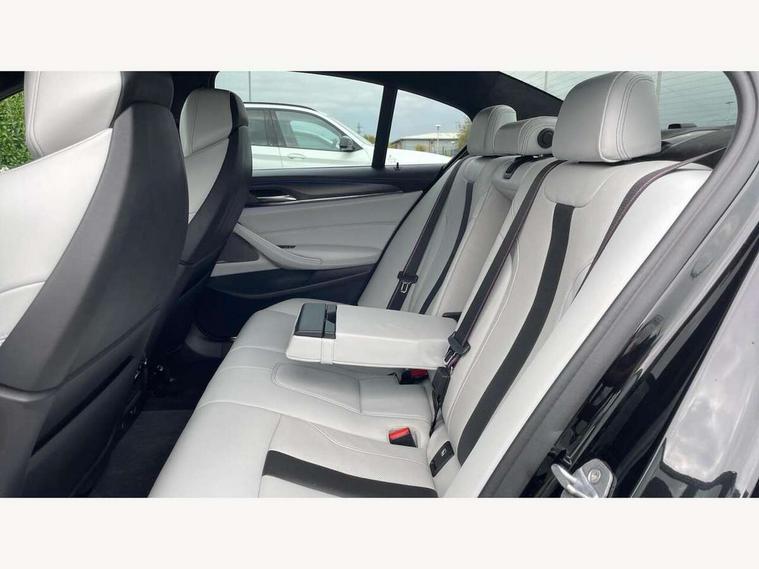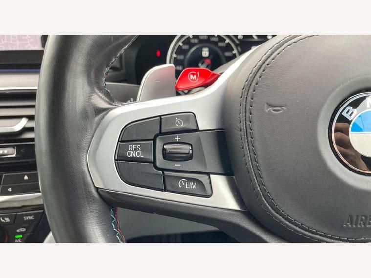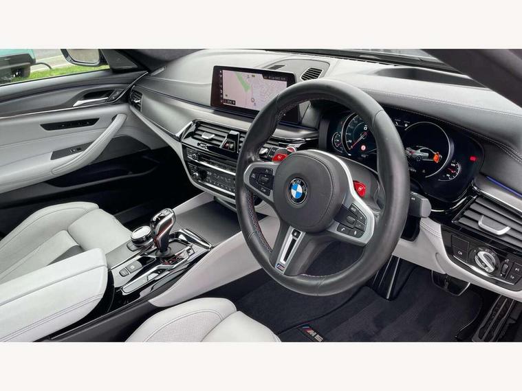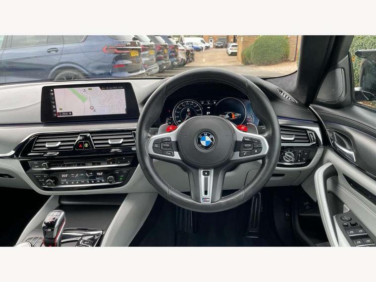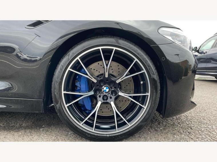 20GB Hard drive, Automatic bootlid operation, BMW Live Cockpit Professional sat nav system including 10.25" high resolution display and Intelligent Voice Assistant, BMW Online services, BMW Teleservices, Brake force display, City brake control, Comfort access system with smart opener, Enhanced bluetooth with wireless charging, Front/rear Parking distance control, Head up Display, iDrive controller and display with 10.2" colour display monitor, Lane departure and rear collision warning system, On board computer, On-board diagnosis - OBD, Outside temperature display, Park assist plus, Personal Profile, Rear cross traffic alert, Reversing camera, Service interval indicator, Servotronic PAS, Speed limiter, Voice control system, Wifi hotspot preparation, Adaptive drive with variable damper control, Anti-roll bars, Petrol Particulate Filter, BMW professional radio, DAB Digital radio, Gesture control for infotainment system, Anti-corrosion treatment, Auto dimming door mirrors, Auto dimming rear view mirror, Body colour door handles, Body coloured bumpers, Body coloured side sills, Dynamic brake lights, Electric folding/heated door mirrors with integrated indicators, Electric front and rear windows with fingertip open/close + anti-trap all round, Follow me home headlights, Heated windscreen washer jets, High beam assistant, High gloss black door mirrors, High gloss black kidney grille, High gloss black rear apron, High gloss black side gills with M5 logo, Icon Adaptive LED headlights, Illuminated door handles, Illuminated door sill finishers with M5 designation, LED daytime running lights, M rear spoiler, M side gills with M5 logo, M Sport exhaust system, Rain sensor with auto light activation system, 12V power point front, 4 zone control automatic air conditioning, Additional 12V sockets in rear and luggage compartment + twin USB charging sockets, Alcantara headlining in anthracite, Ambient interior lighting, Anthracite Velour floor mats, Battery in luggage with jump start facility, Electric adjustable steering column, Front centre armrest with storage compartment, Front cupholders x 2, Front footwell lights, Front reading lights, Front/rear armrests within door panels, Gearshift paddles, Illuminated glovebox with lock, Isofix rear child seat preparation, M leather steering wheel, M Sport multi-function front seats with electric lumbar support and driver memory, Multi-function controls for steering wheel, Rear centre armrest with 2 cupholders + storage, Rear footwell lights, Rear headrests, Connected package professional - M5, ABS/EBD, Auto hold function, Automatic Stability Control (ASC), BMW emergency call, Brake assist function, Brake energy regeneration, Cornering brake control (CBC), Crash Sensor - activates hazard/interior lighting + unlocks doors, Door reinforcements, Driver/front passenger side airbags, Driver/Passenger airbags (Impact dependent), DSC - Dynamic Stability Control, Dual horn, Dynamic brake control, Dynamic Traction Control - DTC, Electromechanical parking brake, Front and rear head airbags, Front head restraints with anti-whiplash, Front passenger airbag deactivation, Fuel cut off safety device, Hill start assist, M sport seatbelt, Motor Slip Regulation (MSR) - Engine Drag Torque Control, Seat belts front inertia reel with pyrotechnical belt latch tensioner, belt force limiter and belt restrainer, Side impact protection, Three inertia reel rear seatbelts, Tyre pressure monitoring system, Warning triangle and first aid kit, Automatic drive away locking facility, Engine immobiliser, Locking wheel bolts, Remote central locking, Remote control Thatcham category 1 alarm, 20" M Y-spoke light alloy wheels with mixed tyres in bicolour finish - style 789, Tyre mobility system,