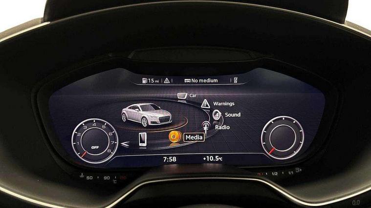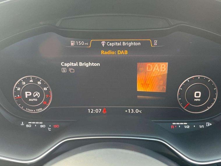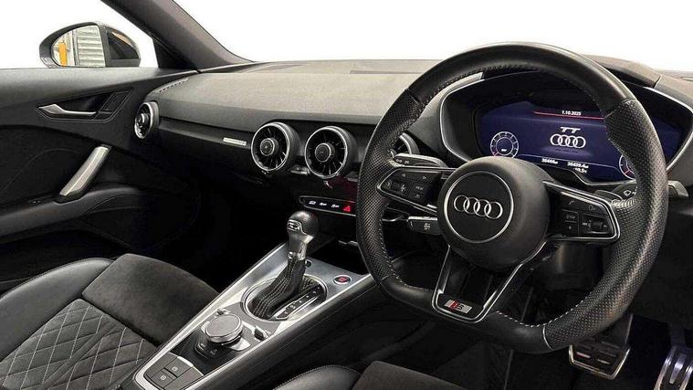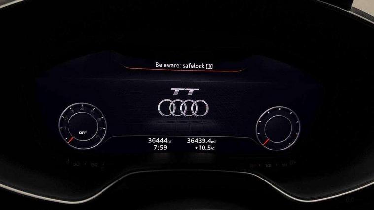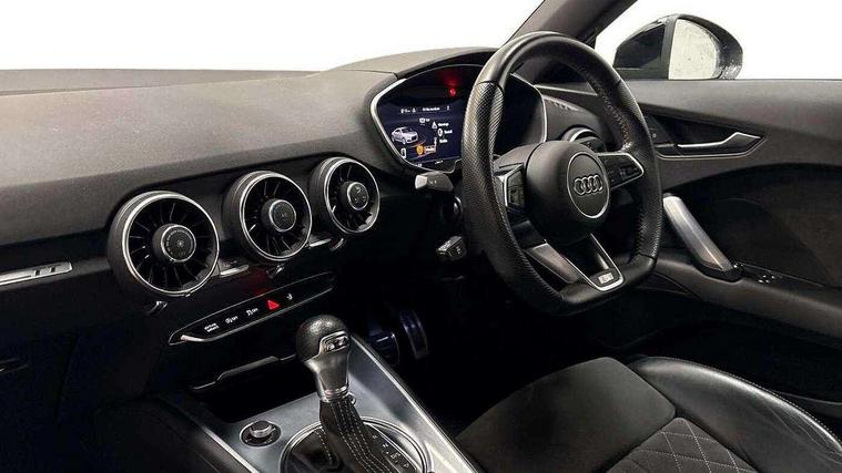 Audi drive select with 4 Pre configured modes, Audi smartphone interface, Audi virtual cockpit - 12.3" high-resolution LCD display with fully customisable instrument cluster, Cruise control + speed limiter, MMI touch panel, Mobile phone preparation with bluetooth interface, Progressive power assisted steering, Service interval indicator, Start/Stop system with energy recuperation, TP memo, S line sports suspension, AM/FM radio, Bluetooth audio streaming, DAB Digital radio, MMI Radio with CD player and SD/XC card slot, Auto dimming rear view mirror, Auto headlight range control, Body colour bumpers, Body colour electrically adjustable and heated door mirrors with built in LED side indicators, Electric folding door mirrors, Electric front windows, Front fog lights, Green tinted heat insulating glass, High gloss black radiator grille, LED daytime running lights, LED headlights with LED rear lights + dynamic rear indicators, Light and rain sensors, Retractable rear boot spoiler, S line badges on front wings, S Line front and rear bumpers, S line rear diffuser with platinum grey insert, S line side sills, Sunband for windscreen, 12V socket, 3 spoke flat bottomed high multi-function leather sport steering wheel with gearshift paddles, 4 way electric lumbar support for driver and front passenger, Black headlining, Door sill trims with S line logo, Extended aluminium look with stainless steel pedals, Front centre armrest, Front super sports seats, Heated front seats, Height adjustable driver's seat, Height adjustable front head restraints, Height/reach adjust steering wheel, ISOFIX child seat mounting for front passenger seat with airbag deactivation, Perforated leather gearknob in black, Rear head restraints, Rear top tether child seat ISOFIX attachment, S Line badge on steering wheel, Split folding rear seat, Non smoking pack - TT/TT RS, 3 point front seat belts, ABS, ASR traction control, Brake energy regeneration, Curtain airbags, Driver and front passenger airbag with front passenger airbag deactivation, EDL traction control, Electromechanical parking brake, ESP, First aid kit, Front side airbags, Head airbags, Hill hold assist, Seatbelt warning, Tyre pressure warning, Warning triangle, Anti theft alarm, Anti theft wheel bolts, Immobiliser, Keyless Go, Remote central locking, Matt brushed aluminium inlays, Tool kit, Tyre repair kit,