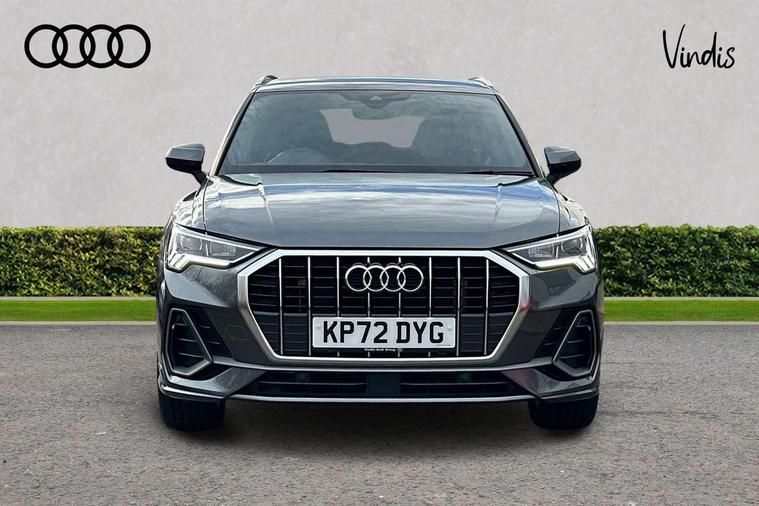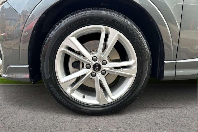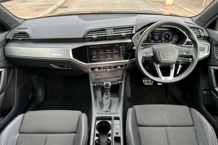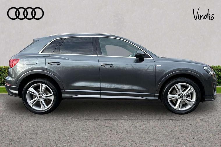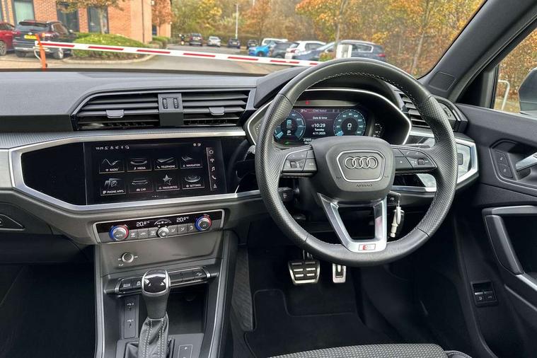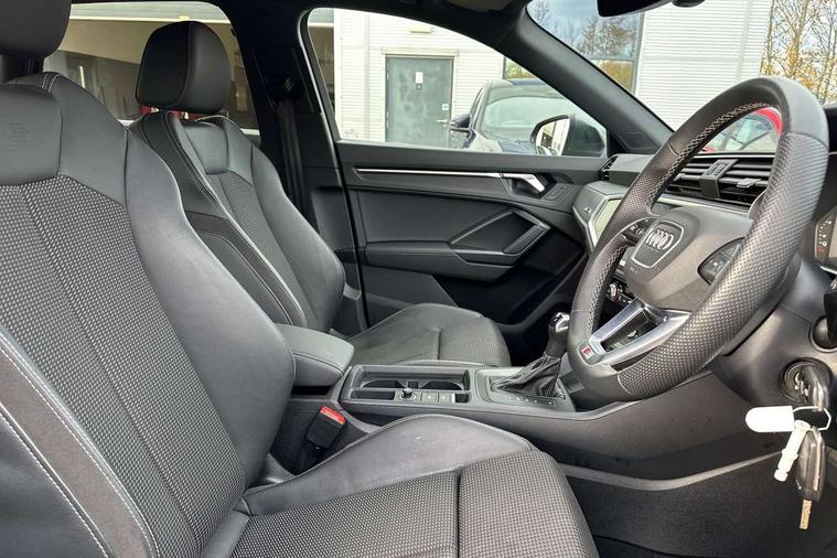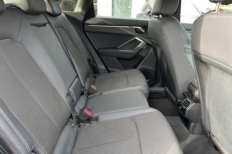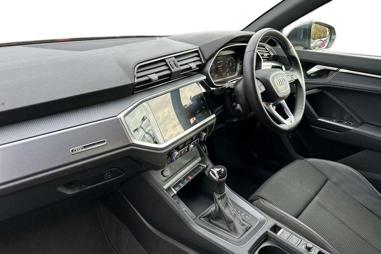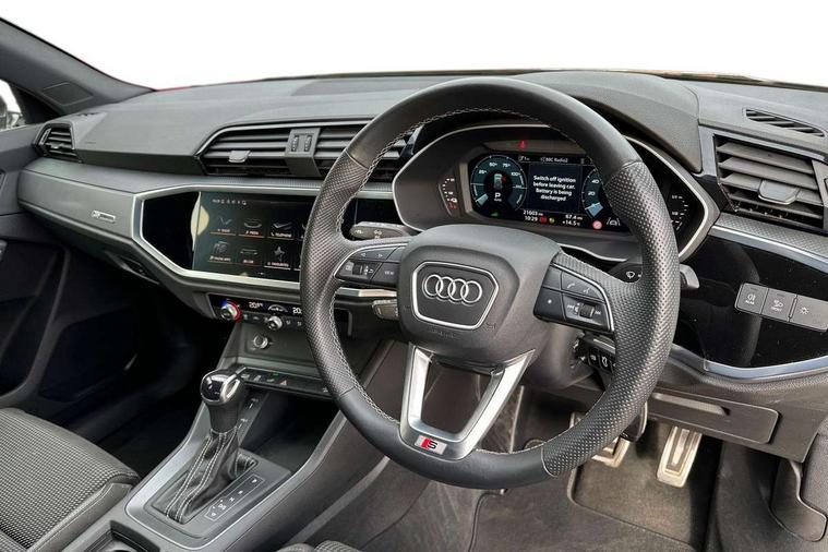 Amazon alexa Integration, Audi drive select, Audi lane departure warning, Audi Virtual Cockpit - 10.25" display, Bluetooth interface, Camera based traffic sign recognition, Legal emergency call, MMI Navigation Plus with high resolution 10.1 inch touchscreen colour display, Power operated tailgate, Progressive steering, Service interval indicator, Smartphone interface includes wireless Apple carplay/Android Auto, Start stop system with recuperation, Voice control system with natural language interaction, 3 pin 10 amp domestic charging cable, 3.6 kw On-board charger, Type 2 mode 3 32 amp charging cable, Type 2 socket for AC charging, 2 USB-C ports with charge and data functions, 6 passive loudspeakers, DAB digital radio module, Acoustic windscreen, Aluminium roof rails, Aluminium window trim, Auto dimming frameless rear view mirror, Body colour front spoiler blade, Body coloured bumpers, Electrically folding, adjustable and heated door mirrors with integrated LED side indicators and kerb view function for passenger side, Front and rear electric windows, Front fog lights, Front side air inlets in matt platinum grey, Grille vertical bars in aluminium silver/Matt, High gloss black finish B and C pillars, LED Dynamic rear indicators, LED headlights with LED daytime running lights, LED rear lights, LED third brake light, Privacy glass dark tinted rear and rear-side windows (from B-pillar backwards), Rain and light sensors, Rear diffuser grille in grained matt black, Rear diffuser strip in matt titanium black, Rear side wing doors, Rear wiper, S line badges on front wings, S Line front and rear bumpers, Side skirt insert in matt Platinium grey, Titanium black radiator grille, Variable front intermittent wipers, 12V socket in rear centre console, 3 seat bench in 2nd row, 40:20:40 folding with manual adjustment for 60:40 forwards/backwards position and backrest angle, Adjustable rear seat bench/backrest with centre armrest and cupholder, Black cloth headlining, Dual zone electronic climate control, Front and rear black floor mats with contrast stitching in rock grey, Front and rear headrests, Front and rear roof module including reading lights, Front centre armrest, Glove compartment lighting, Height and reach adjustable steering wheel, Illuminated door sill trims with S logo, ISOFIX child seat mounting for front passenger with airbag deactivation and outer rear seat including top tether attachment point for outer rear seats, Luggage compartment light, Manual front seats with height adjustment, Perforated leather gearknob, Single front passenger seat, Stainless steel luggage compartment sill finisher, Stainless steel pedals, Ambient lighting pack - Q3, Non smoking pack - Q3, 3x3 point rear seatbelts, 6 airbags - Driver, front passenger, curtain and side windows, Audi pre-sense front with pedestrain and cyclist recognition, Electrically operated child locks on rear doors, Electromechanical parking brake, Electronic stabilisation control including ABS, ASR and EDL, Front seatbelt reminder, Hill descent control, Hill hold assist, Pre sense basic, Seatbelt monitoring, Tyre pressure warning, Warning triangle and first aid kit, Anti theft alarm, Anti theft wheel bolts, Immobiliser, Remote central locking, Dark matt brushed aluminium inlay, Detail dashboard around MMI touch colour display in glass look, black with surround in aluminium look, Leatherette door armrest, Tool kit, Tyre repair kit,