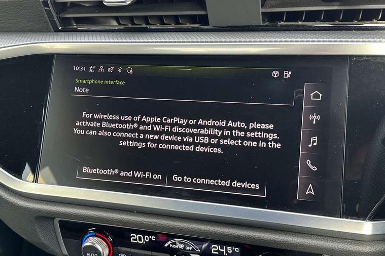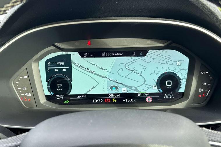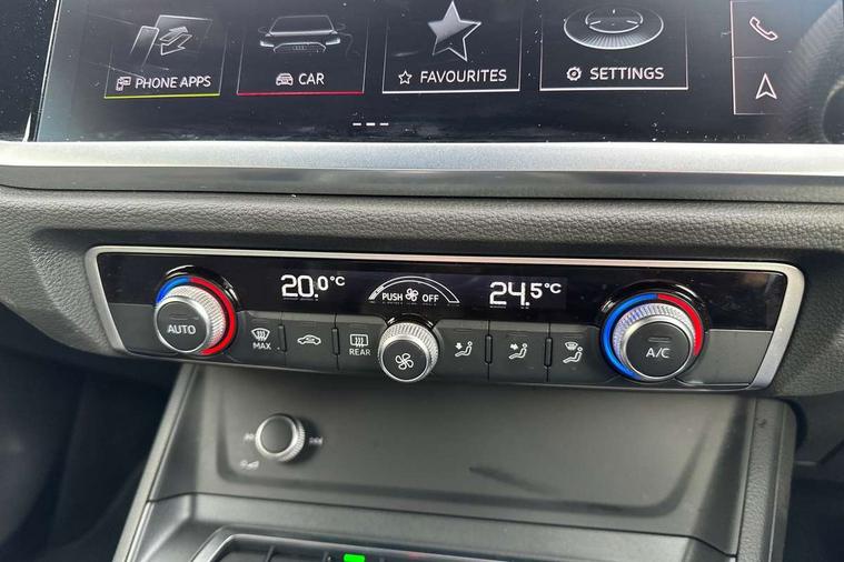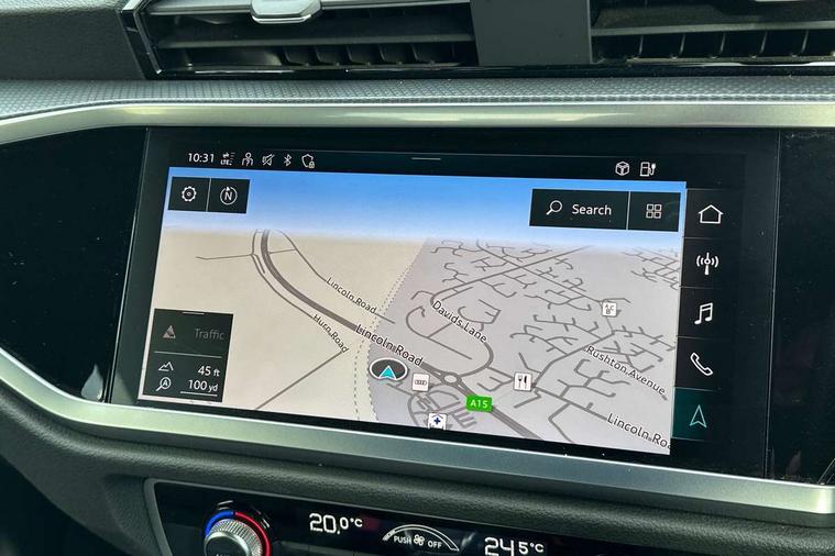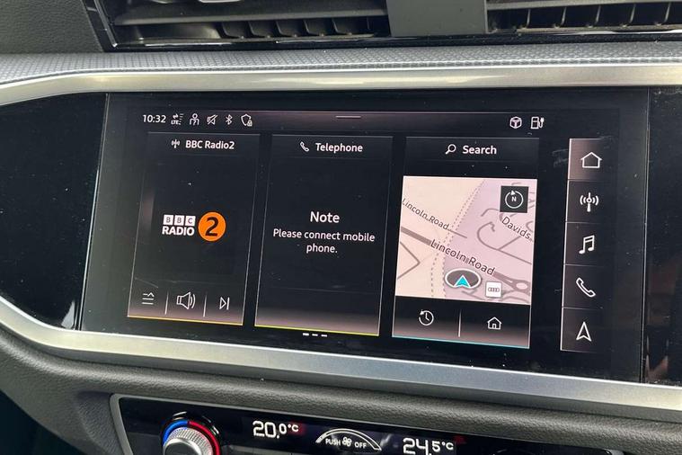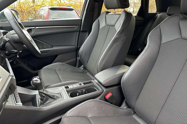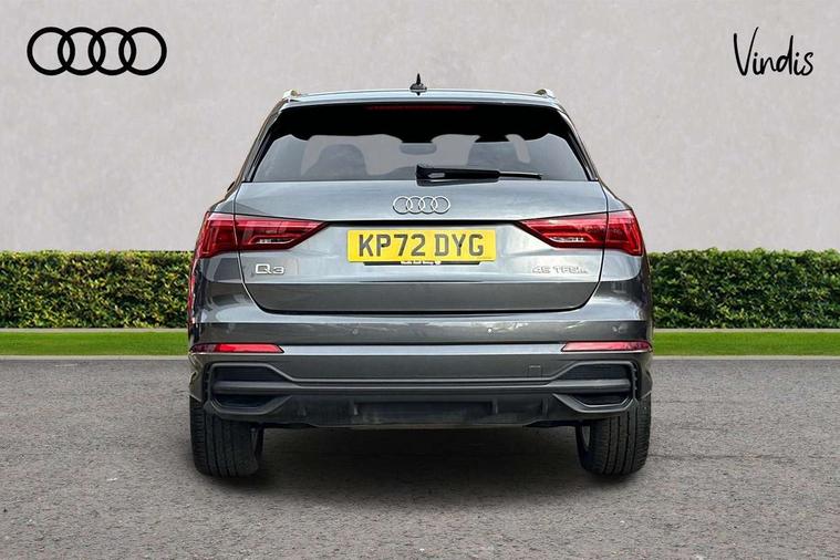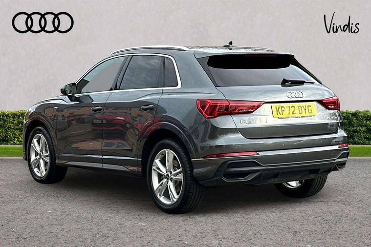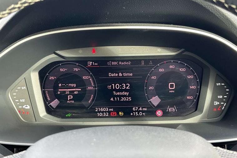 Amazon alexa Integration, Audi drive select, Audi lane departure warning, Audi Virtual Cockpit - 10.25" display, Bluetooth interface, Camera based traffic sign recognition, Legal emergency call, MMI Navigation Plus with high resolution 10.1 inch touchscreen colour display, Power operated tailgate, Progressive steering, Service interval indicator, Smartphone interface includes wireless Apple carplay/Android Auto, Start stop system with recuperation, Voice control system with natural language interaction, 3 pin 10 amp domestic charging cable, 3.6 kw On-board charger, Type 2 mode 3 32 amp charging cable, Type 2 socket for AC charging, 2 USB-C ports with charge and data functions, 6 passive loudspeakers, DAB digital radio module, Acoustic windscreen, Aluminium roof rails, Aluminium window trim, Auto dimming frameless rear view mirror, Body colour front spoiler blade, Body coloured bumpers, Electrically folding, adjustable and heated door mirrors with integrated LED side indicators and kerb view function for passenger side, Front and rear electric windows, Front fog lights, Front side air inlets in matt platinum grey, Grille vertical bars in aluminium silver/Matt, High gloss black finish B and C pillars, LED Dynamic rear indicators, LED headlights with LED daytime running lights, LED rear lights, LED third brake light, Privacy glass dark tinted rear and rear-side windows (from B-pillar backwards), Rain and light sensors, Rear diffuser grille in grained matt black, Rear diffuser strip in matt titanium black, Rear side wing doors, Rear wiper, S line badges on front wings, S Line front and rear bumpers, Side skirt insert in matt Platinium grey, Titanium black radiator grille, Variable front intermittent wipers, 12V socket in rear centre console, 3 seat bench in 2nd row, 40:20:40 folding with manual adjustment for 60:40 forwards/backwards position and backrest angle, Adjustable rear seat bench/backrest with centre armrest and cupholder, Black cloth headlining, Dual zone electronic climate control, Front and rear black floor mats with contrast stitching in rock grey, Front and rear headrests, Front and rear roof module including reading lights, Front centre armrest, Glove compartment lighting, Height and reach adjustable steering wheel, Illuminated door sill trims with S logo, ISOFIX child seat mounting for front passenger with airbag deactivation and outer rear seat including top tether attachment point for outer rear seats, Luggage compartment light, Manual front seats with height adjustment, Perforated leather gearknob, Single front passenger seat, Stainless steel luggage compartment sill finisher, Stainless steel pedals, Ambient lighting pack - Q3, Non smoking pack - Q3, 3x3 point rear seatbelts, 6 airbags - Driver, front passenger, curtain and side windows, Audi pre-sense front with pedestrain and cyclist recognition, Electrically operated child locks on rear doors, Electromechanical parking brake, Electronic stabilisation control including ABS, ASR and EDL, Front seatbelt reminder, Hill descent control, Hill hold assist, Pre sense basic, Seatbelt monitoring, Tyre pressure warning, Warning triangle and first aid kit, Anti theft alarm, Anti theft wheel bolts, Immobiliser, Remote central locking, Dark matt brushed aluminium inlay, Detail dashboard around MMI touch colour display in glass look, black with surround in aluminium look, Leatherette door armrest, Tool kit, Tyre repair kit,