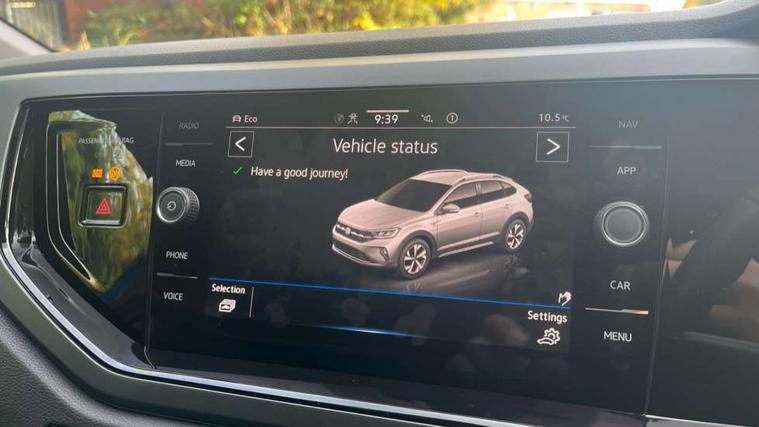 Adaptive cruise control, Advanced driver attention and drowsiness monitor, App-Connect including App-Connect Wireless, Digital cockpit pro - 10.25" high resolution TFT dash display screen with customizable menus and information, Driving profile selection, e-Call (emergency call), Power Steering, Travel assist including emergency assist, Washer fluid level indicator, Wireless Charging including Bluetooth, Start-stop system with battery regeneration (recuperation - energy recovery during braking), XDS electronic differential lock for improved traction and handling, Digital radio reception (DAB+), Diversity antenna for FM reception, WeConnect plus, Ambient lighting with logo projection, Aspherical driver's exterior mirror, Auto headlights, Body coloured bumpers, Body coloured door handles, Cornering headlights, Electric windows, External USB type C socket and charging sockets, LED rear combination lamp, LED third brake light, Left convex exterior mirror, Power folding adjustable/heated exterior mirrors and front passenger exterior mirror lowering function, Rear fog light on one side, reversing light on both sides, Rear side wing doors, Rear wash/wipe with intermittent wipe setting, 12V socket in centre console, 2 front reading lights, 3 rear head restraints, 3 seat bench in 2nd row, Air care climatronic air conditoning system with active combination filter and 2-zone temperature control, Black carpets, Black roof lining, Child seat anchor for child seat system i-Size, 2x top tether and child seat anchor in front on front passenger side, Chrome bezel for instrument cluster, vents, door handles + gear shift, Driver and front passenger seat height adjustment, Front + rear carpet mats, Front centre armrest, Front footwell illumination, Front sports comfort seats, Heated front seats, Height and reach adjustable steering wheel, Interior ambient lighting and surround lighting, Karoso artvelours cloth upholstery, Leather trimmed gear knob, Leather wrapped multifunction steering wheel, Luggage compartment floor, Luggage compartment light, Lumbar support for driver's and front passengers seat, Seat covers in grey + titanium black, Single front passenger seat, Split folding backrest with centre armrest and unsplit rear seat bench, Stainless steel pedals, Storage compartment under front seats, Sun visors with illuminated vanity mirrors, Black design pack - Taigo Black Edition, Black roof pack with mirror housing - Taigo, IQ.LIGHT - LED matrix headlights pack - Taigo, Light and Sight pack including High beam assist - Taigo, 2 x 3-point seatbelts/outer rear seats with ECE label, 3-point seat belts in front with pretensioner and height adjustment, 3-point seatbelt for centre rear seat, Adaptive driver and front passenger airbags with passenger airbag deactivation function, Driver and front passenger safety-optimised head restraints, Electronic stability control, Extended and predictive pedestrian/ cyclist protection, Front and rear disc brakes, Front curtain and side airbags with center airbag, Hill start assist, Manual rear child locks, Single tone horn, Tyre pressure loss indicator, Anti-theft alarm system with interior monitoring, backup horn, and towing protection, Grey anodised matte decorative inserts in dash and front door panels, 18" York black alloy wheels with anti theft wheel bolts, Breakdown kit, Low rolling resistance tyres,