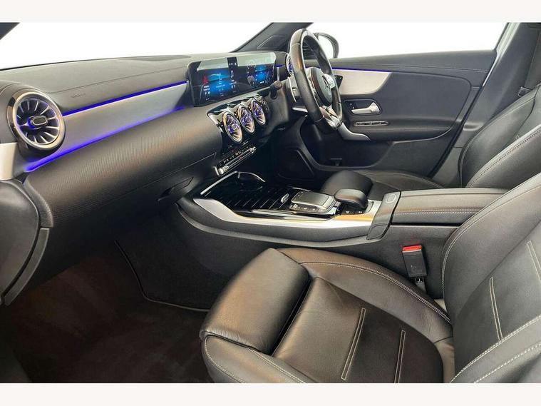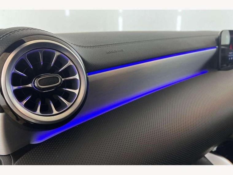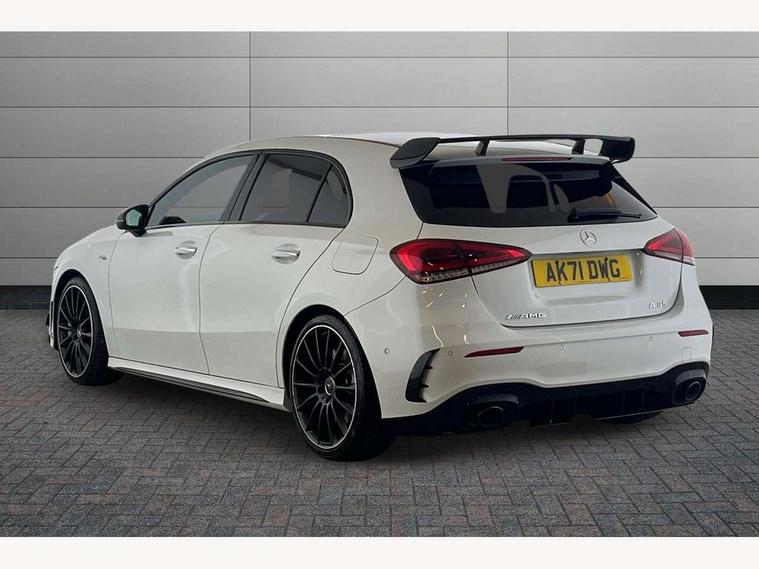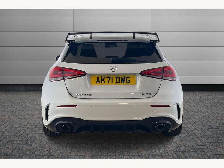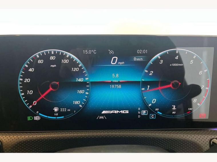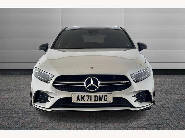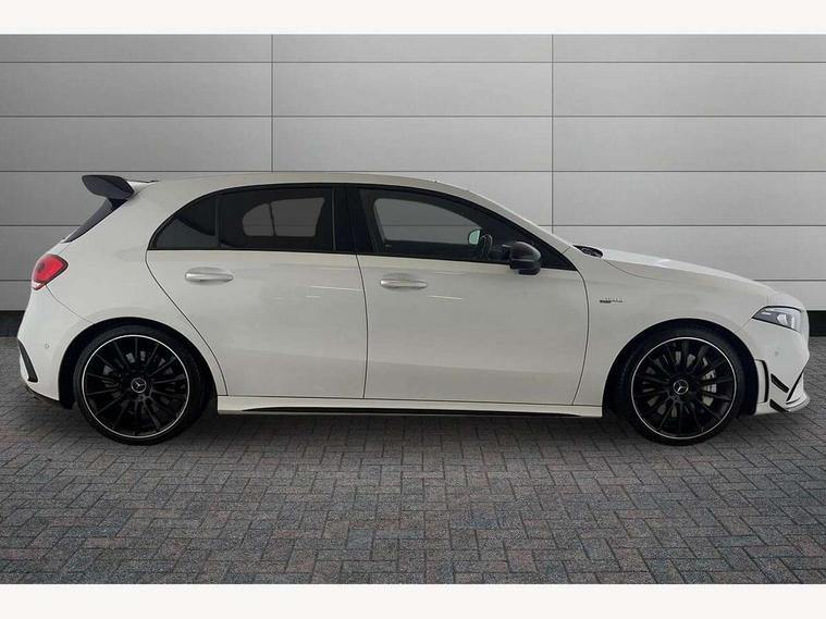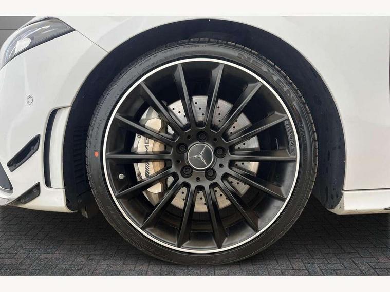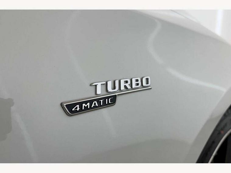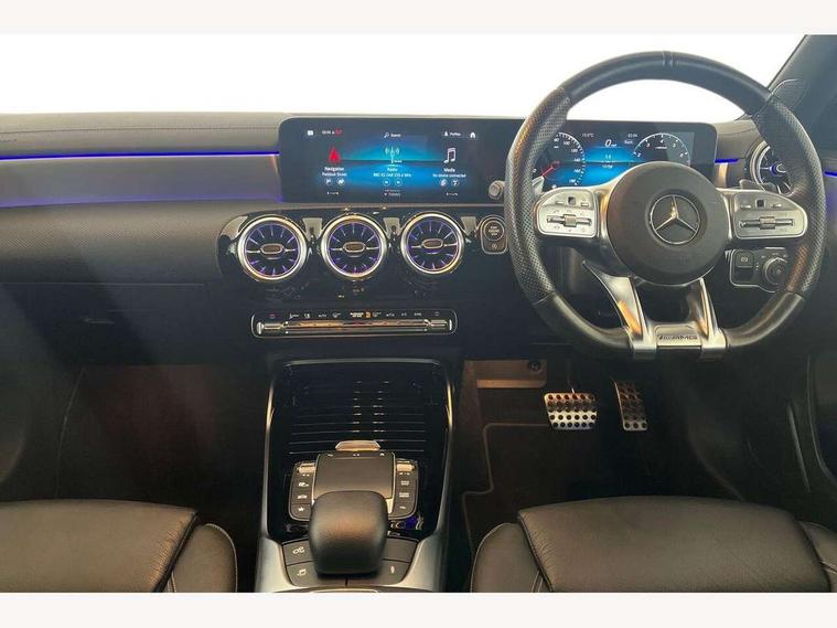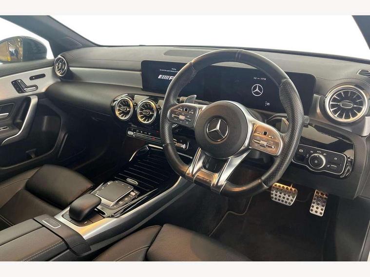 10.25" Digital instrument cluster display screen, 10.25" media display, 180 degree rear view camera with parking guidelines, Active parking assist with visual and audible warning of detected obstacles, Attention assist, Brake pad wear indicator warning light, Car wash mode, Direct steering, Dual bluetooth interfaces, DYNAMIC SELECT with driving programs (Slippery, Comfort, Sport, Sport+ and Individual), ECO start/stop function, Fluid level warning indicator for fuel, oil, coolant and washer fluid, Hard-disk navigation, Hey Mercedes Voice activation, Lamp failure indicator, Lane keeping system, Mercedes me connect including emergency call system, accident recovery, breakdown and maintenance management, Mercedes me remote services, Outside temperature gauge, Owners manual in English, Pre-installation for private car sharing, Preinstallation for Mercedes Benz link, Service indicator (ASSYST), Smartphone integration with Apple CarPlay and Android auto, Traffic sign assist, Trip computer, Ultrasonic sensors positioned in the front and rear bumpers, Rear axle multi-link, 2 USB ports (type C) in rear stowage compartment and one in front of center console, DAB Digital radio, MBUX multimedia system with DAB digital radio and touchpad including satellite navigation, Mercedes-Benz sound system - 100W, 4 Electric Front and Rear windows, Adaptive brake lights, AMG bodystyling - Front apron with splitter in chrome, rear apron with chrome trim and chrome visible trim elements in tailpipe, AMG Front apron with flics as air deflector elements on the outer air intakes, AMG radiator grille with twin blade lamella and AMG Lettering, AMG Rear apron with specific diffuser look with four vertical fins and two round chrome plated tailpipe trim elements with a diameter of 90 mm, AMG spoiler lip on roof, AMG Sports exhaust system with two round tailpipes measuring 90 mm in diameter attached in rear apron, AMG lettering plus ribbing on the inside of the, Black weather strip, Body colour bumpers, Body colour door handles, Body colour side skirt, Electric adjustable and heated door mirrors with integrated LED side indicators, Front wings wheel arches with TURBO 4MATIC lettering, Headlamp assist automatic headlamp activation, Heated glass rear windscreen + timer control, High gloss black beltline, LED High level third brake light, LED high performance headlamps with integrated LED daytime running lights, LED tail lamp, Multibeam LED with adaptive highbeam assist plus, Panoramic sliding sunroof, Privacy glass, Radio aerial, Rain sensing windscreen wipers with two sensitivity settings, Rear fog lights, Rear wiper, Trim elements on louvres in outer air inlets in high gloss black, Wider wheel arches for AMG wheels, Window line trim strip in high gloss black, 40:20:40 split folding rear seats, AMG Performance steering wheel in nappa leather, Auto Mercedes-Benz child seat recognition sensor, Black air vents with surround in silver chrome, Black roof lining, Brushed stainless steel sports pedals with rubber studs, Controller on centre console with chrome surround, Electrically adjustable front memory seats including lumbar support, Floor mats with stitched edging and AMG lettering, Front centre armrest with storage compartment, Front seat backs luggage nets, Front seat cushion length adjustment, Heated front seats, Height/reach adjustable steering column, Illuminated AMG front door sills with changeable cover, Interior lighting - 64 colour Ambient lighting, Interior mirror with reading lamps in black and frameless, Rear armrest with 2 cupholders, Rear head restraints, Seat occupancy sensor for front passenger seat, Silver coloured aluminium gear shift paddles on steering wheel, Sports seats with integrated headrests, Stowage compartment in centre console with retractable cover, Sunvisors with illuminated vanity mirrors, Touchpad on center console, Twin front cupholders, Two zone thermotronic luxury automatic climate control, Aerodynamic pack - A Class, AMG night pack - A Class, Light and sight pack - A Class, Mirror package - A Class, Seat comfort pack - A Class, 3 rear 3 point seatbelts, ABS with Brake Assist, Active bonnet, Adaptive brake assist with hold function and hill start assist, Black seatbelts, Childproof locks manually operated for rear doors and electrically operated for rear power windows, Crash responsive emergency lighting, Driver and passenger head and side airbags, Drivers knee airbag, Dual stage driver/passenger airbags, Electronic parking brake, ESP curve dynamic assist, ESP with ASR, Front and rear seatbelt reminder, Front brake calipers with AMG lettering, ISOFIX and top tether child seat fixing points in two outer rear seats, Perforated front brake discs, Tyre pressure monitoring system, Warning triangle and first aid kit, Window airbags, Alarm system/interior protection/immobiliser, Keyless entry lock/unlock, Keyless Go, Remote central locking and crash sensor with emergency opening function, Urban guard vehicle protection system with immobiliser and interior protection, Light aluminium with longitudinal grain interior trim, 19" AMG multi-spoke matt black painted light alloy wheels with high sheen finish, Summer tyres, Tirefit sealant kit,