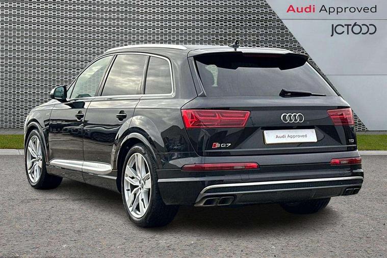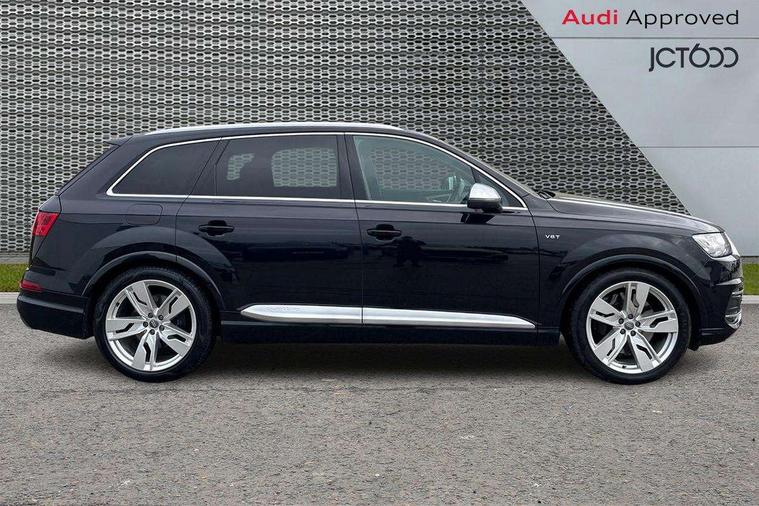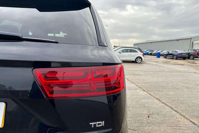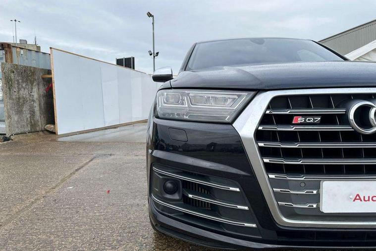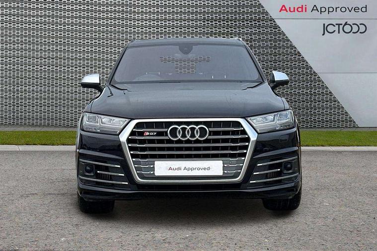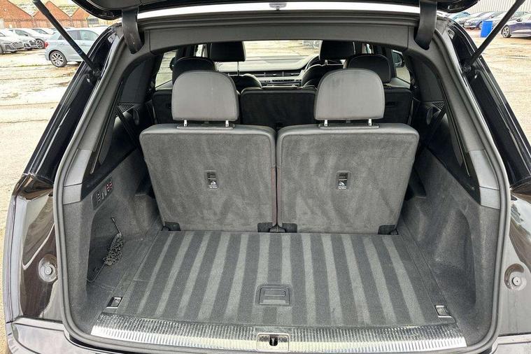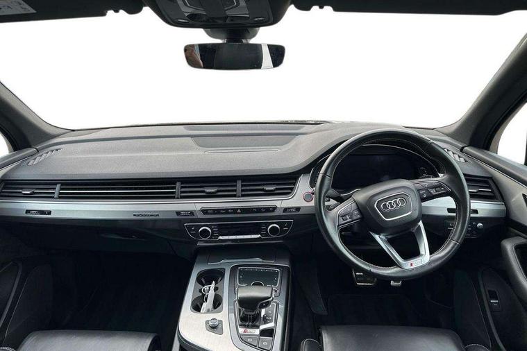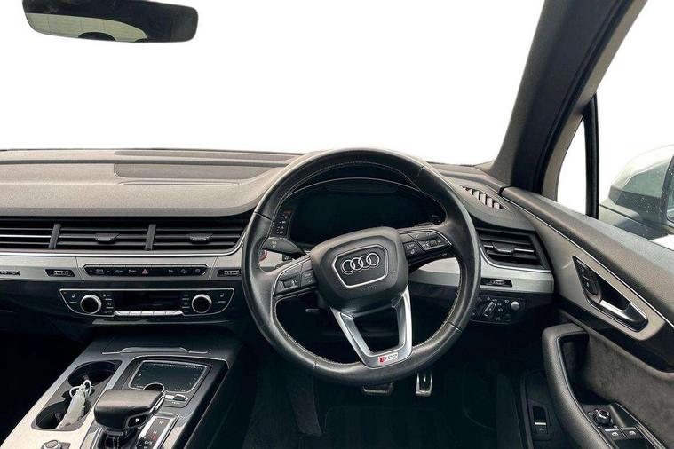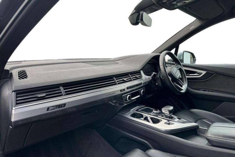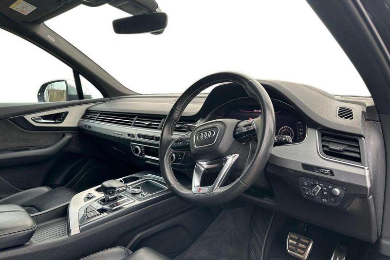 Audi drive select, Audi smartphone interface, MMI - Multi Media Interface control system, MMI navigation plus with touch and 8" colour display, DVD, SD card reader, 10GB music storage, Mobile phone preparation with bluetooth interface, Remote electric boot opening/closing, Service interval indicator, Servotronic speed related PAS, Speed limiter, Voice control system, 85 litre fuel tank, Adaptive air suspension, 2 USB ports, Audi music interface, Aux-in socket, DAB digital radio module, MMI radio plus, Acoustic windscreen, Active exhaust sound system, Aluminium effect front grille, Audi Beam uses LEDs to project the Audi Sport logo, Auto dimming rear view mirror, Body coloured bumpers, Dual branch oval twin exhaust tailpipes, Dynamic rear indicators, Electric front+rear windows, Headlight washers, High beam assist, LED daytime running lights, LED tail lights, Loading sill protector in stainless steel, Platinum grey front lip spoiler, Rain and light sensors, Rear wiper, Roof spoiler, S body styling, 2 cupholders in front centre console, 35/30/35 split fold 2nd row seats, 4 way electrically adjustable lumbar support for drivers seat, 4 way electrically adjustable lumbar support for front passenger seat, Aluminium scuff plates, Door sill trims with S line logo, Electric 3rd row 50/50 split/fold, Electric adjustable front seats, Four zone electronic climate control, Front ashtray and cigar lighter, Front centre comfort armrest with storage + cupholders, Front head restraints, Front/rear floor mats, Gearshift paddles, Heated front seats, ISOFIX on front passenger and rear outer seats, Leather gear knob, Rear centre armrest with 2 cupholders, Rear headrests, Stainless steel pedals, Sunvisors with illuminated vanity mirrors, Top tether anchor plate for isofix child seat, Interior light pack - Q7, 3 point seatbelts on all seats, ABS+Electronic Brake force Distribution, Curtain airbags, Driver and passenger airbags, EDL + ASR, Electrically operated child locks on rear doors, Electromechanical parking brake, ESP, Front passenger airbag deactivation, Front side airbags, Hill descent control, Hill hold assist, Seatbelt warning, Traction control, Tyre pressure monitoring system, Warning triangle and first aid kit, Alarm with interior monitoring, Immobiliser, Keyless Go access/ignition system, Locking wheel bolts, Remote central locking, Chrome door inserts, Tool kit, Tyre repair kit,