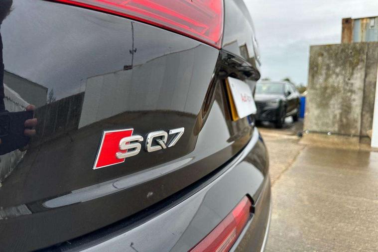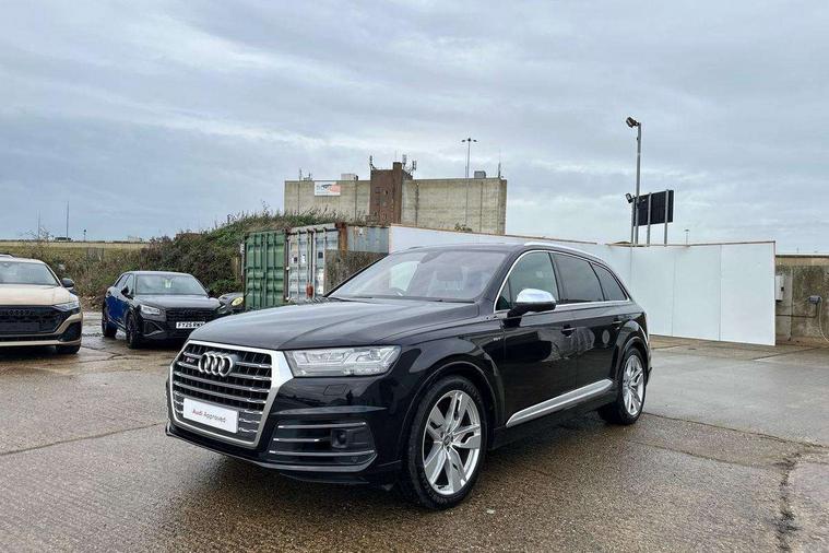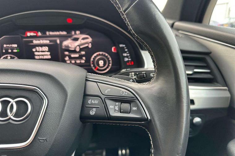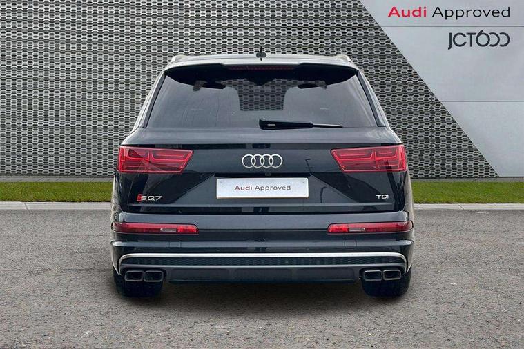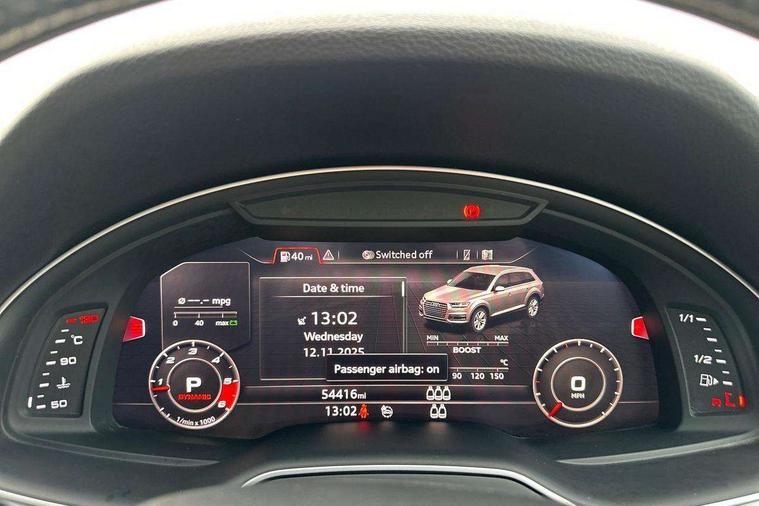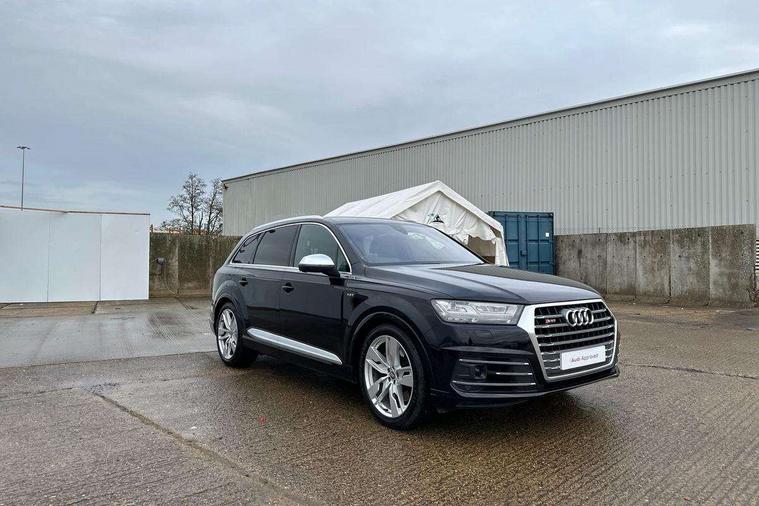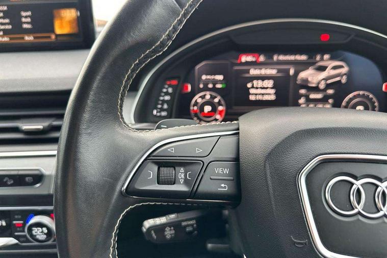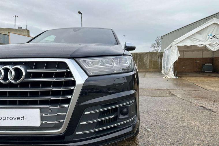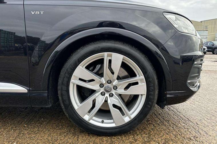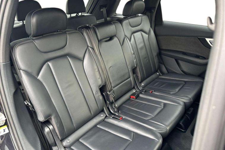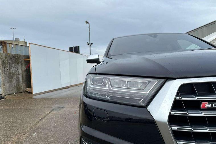 Audi drive select, Audi smartphone interface, MMI - Multi Media Interface control system, MMI navigation plus with touch and 8" colour display, DVD, SD card reader, 10GB music storage, Mobile phone preparation with bluetooth interface, Remote electric boot opening/closing, Service interval indicator, Servotronic speed related PAS, Speed limiter, Voice control system, 85 litre fuel tank, Adaptive air suspension, 2 USB ports, Audi music interface, Aux-in socket, DAB digital radio module, MMI radio plus, Acoustic windscreen, Active exhaust sound system, Aluminium effect front grille, Audi Beam uses LEDs to project the Audi Sport logo, Auto dimming rear view mirror, Body coloured bumpers, Dual branch oval twin exhaust tailpipes, Dynamic rear indicators, Electric front+rear windows, Headlight washers, High beam assist, LED daytime running lights, LED tail lights, Loading sill protector in stainless steel, Platinum grey front lip spoiler, Rain and light sensors, Rear wiper, Roof spoiler, S body styling, 2 cupholders in front centre console, 35/30/35 split fold 2nd row seats, 4 way electrically adjustable lumbar support for drivers seat, 4 way electrically adjustable lumbar support for front passenger seat, Aluminium scuff plates, Door sill trims with S line logo, Electric 3rd row 50/50 split/fold, Electric adjustable front seats, Four zone electronic climate control, Front ashtray and cigar lighter, Front centre comfort armrest with storage + cupholders, Front head restraints, Front/rear floor mats, Gearshift paddles, Heated front seats, ISOFIX on front passenger and rear outer seats, Leather gear knob, Rear centre armrest with 2 cupholders, Rear headrests, Stainless steel pedals, Sunvisors with illuminated vanity mirrors, Top tether anchor plate for isofix child seat, Interior light pack - Q7, 3 point seatbelts on all seats, ABS+Electronic Brake force Distribution, Curtain airbags, Driver and passenger airbags, EDL + ASR, Electrically operated child locks on rear doors, Electromechanical parking brake, ESP, Front passenger airbag deactivation, Front side airbags, Hill descent control, Hill hold assist, Seatbelt warning, Traction control, Tyre pressure monitoring system, Warning triangle and first aid kit, Alarm with interior monitoring, Immobiliser, Keyless Go access/ignition system, Locking wheel bolts, Remote central locking, Chrome door inserts, Tool kit, Tyre repair kit,