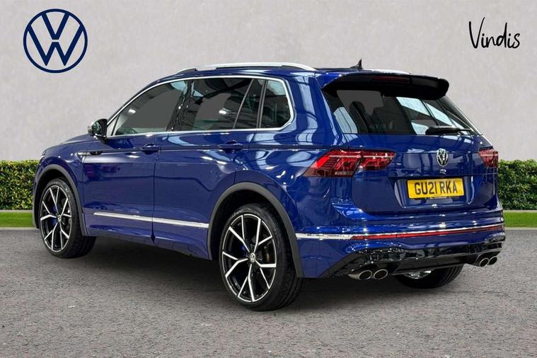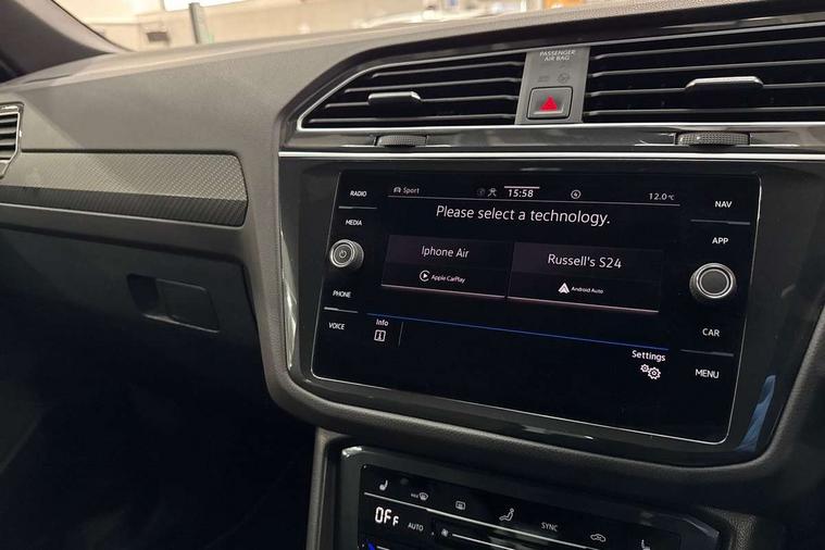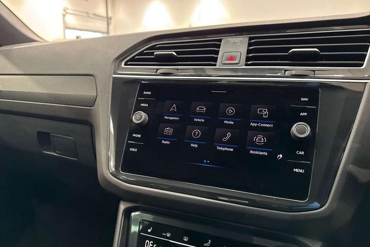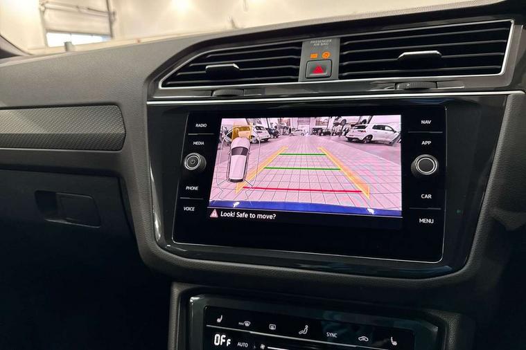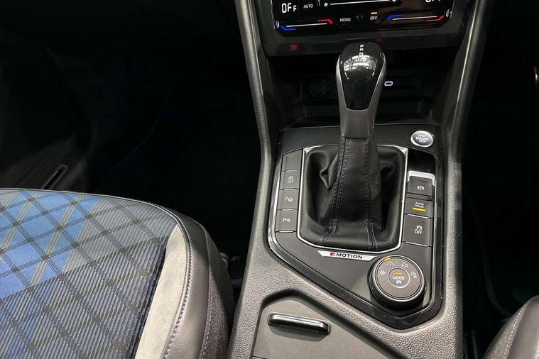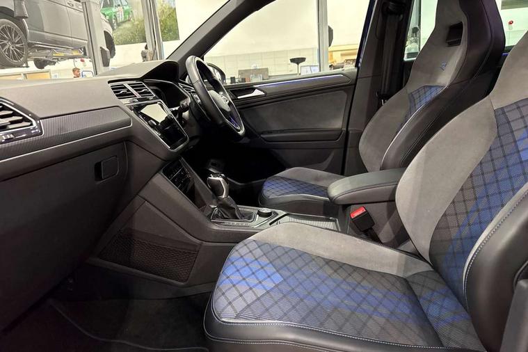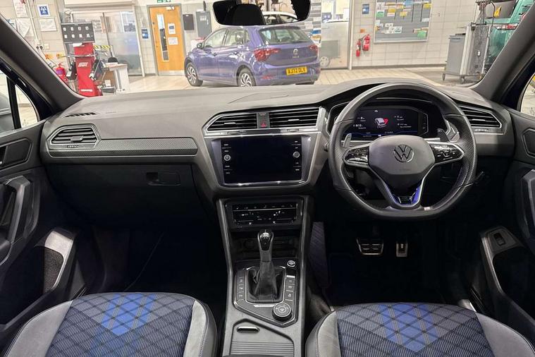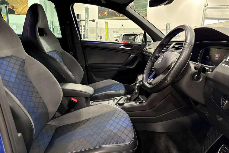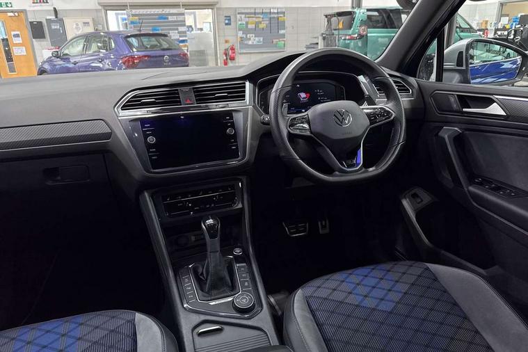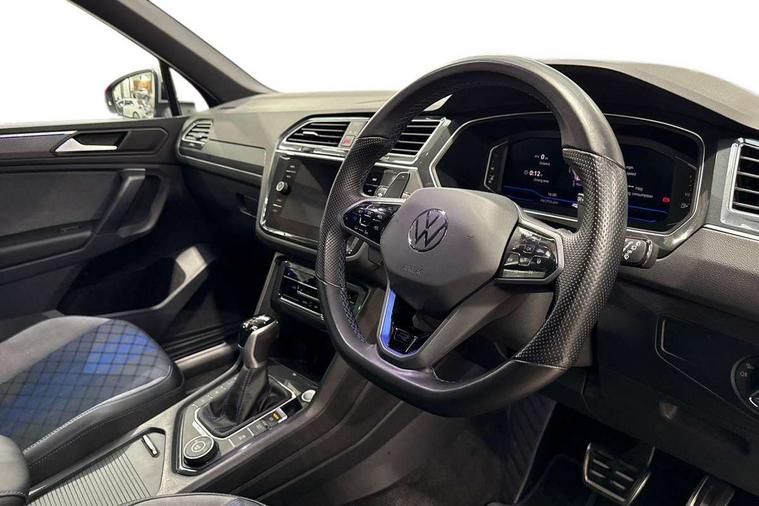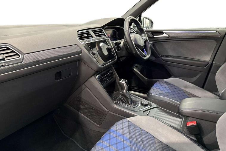 Adaptive cruise control ACC stop and go including speed limiter, App-Connect incl. App-Connect Wireless for Apple CarPlay and Android Auto, Bluetooth phone integration system, Digital Cockpit Pro - Active info display, Distance control assist, Driver alert system, Driver profile selection, Dynamic road sign display, eCall emergency call system, Electromechanical speed sensitive power steering, Keyless entry with full electric tailgate operation, Lane keeping system Lane Assist, Lights on warning, Multifunction front facing camera, Outside temperature display, Premium multifunction display with multi colour display, Service interval indicator, Start/stop system with regenerative braking, Tailgate/trunk lid unlocking from outside, Warning sound and light for doors and tailgate open, ACC - Adaptive chassis contol with adaptive dampers, Battery regeneration during braking, XDS electronic differential lock for improved traction and handling, 2 USB-C ports in the front, 1 USB-C charging socket on the center console in the rear, Diversity antenna for FM reception, Radio, SD card slot, Simultaneous pairing of 2 compatible mobile devices, SMS functionality - read, compose and send SMS messages using touch-screen display, Title and cover art display, Auto dimming interior rear view mirror, Automatic headlight control system, Body colour door handles, Chrome matt mirror covers, Chrome moldings on the side windows, Coming/leaving home lighting function, Dynamic headlight range control, Front and rear electric windows, Heated rear window, High level 3rd brake light, IQ light-Adv high beam, Dynamic light assist for LED matrix headlamp+LED separate DRL+DCL, dark red rear LED tech, Poor weather light+ cornering light, Laminated safety glass windshield, heat and sound insulating, LED rear number plate lights, License plate carrier in front and rear, Poor weather light and cornering light, Power adjustable, folding and heated door mirrors with surround lighting, front passenger exterior mirror lowering function, Privacy glass for rear side windows and rear window, R-Logo light projection, R-Logo on radiator grille with side panels and rear, R-specific diffuser, painted black with cut out for trailer hitch, R-Specific front and rear bumpers, Rain sensor windscreen wipers, Rear fog lamp, Rear spoiler in R style, Rear windscreen washer and wiper with interval delay, Side and rear windows in heat insulating glass, Silver anodised roof rails, Trailer Stability Programme, Windscreen wipers/ intermittent wipe + 4 position delay, 12V outlet in center console rear and in luggage compartment, 2 cup holders in front, 2 LED front reading lights, 2 LED rear reading lights, 3 rear headrests, 4 load lashing points, 40:20:40 split folding rear seats, Air Care Climatronic 3 zone automatic climate control with enhanced air filter and controls in the rear, Backrest release for left front seat, Black headlining, Door and side trim panel in foam film, insert in leatherette, Floor mats with R-Logo and stitching, Front footwell illumination, Front seats head restraints (x-adjustment), Height adjustable front seats, Height/reach adjust steering wheel, Instrument lighting white adjustable panel illumination, Interior light with delay, Isofix Preparation 2 Rear child seats, Leather gear knob, Lighting door sill trim at front with R Logo, Lockable cooled glovebox, Luggage compartment lighting, Pedals and footrest in stainless steel, R Performance steering wheel with R button, larger paddle shifters, blue stiching and blue steering wheel clip, R Specific key caps, R-specific sport skin with R Logo in active Info dsiplay, R-taster (direct selection of race mode/ flap control), Rear bench seat asymetrically split folding, longitudinally movable and folding with load-through hatch and center armrest, Remote unlocking for rear seat backrest, Removable luggage cover, Safety optimised front head restraints, Sliding/reclining rear seats, Standard rear seat release, Storage compartment in driver's door, Storage compartment in passenger's door, Storage compartment in rear doors, Storage compartments in luggage area left and right, Storage tray on dashboard, Sun visors with illuminated vanity mirrors, Top front comfort seats, Top sports seats integrated headrest, blue R-Logo in front seats, seat centre panels and outer rear seats in fabric inner side bolster art Velors, Variable boot floor, height adjustable and removable, Ambience pack - Tiguan, Driver assistance pack plus - Tiguan, Easy open and close pack with safelock - Tiguan, 3 point seat belt for centre rear seats, 3 point seat belts with seat belt pretensioners for the outer rear seats, Active bonnet, Curtain airbags for front and rear passengers, Driver/Front Passenger airbags, Drivers knee airbag, Electronic parking brake with auto hold, Electronic Stability Control with driver steering recommendation, ABS, ASR, EDL, EDTC and trailer stabilization, Front assist with autonomous emergency braking (for Adaptive Cruise Control ACC up to 130 mph), Front disc brakes, Front passenger airbag deactivation, Front side airbags, Height adjustable front 3 point seatbelts + pretensioners, Hill hold control, Pedestrian monitoring system, Proactive passenger protection system in combination with front assist, Rear disc brakes, Rigid safety cell with front and rear crumple zones, Two tone horn, Warning sound and light for front seat belts if unfastened, Warning triangle, Anti theft alarm system with interior monitoring, backup horn and towing protection, Anti theft wheel bolts, Central locking system with safelock radio remote control and 2 remote control folding keys, Electronic engine immobiliser, 21" Estoril black with diamond turned surface superlight alloy wheels with Airstop tyres, Tool kit, Tyre mobility kit Includes 12V compressor and tyre sealant,
