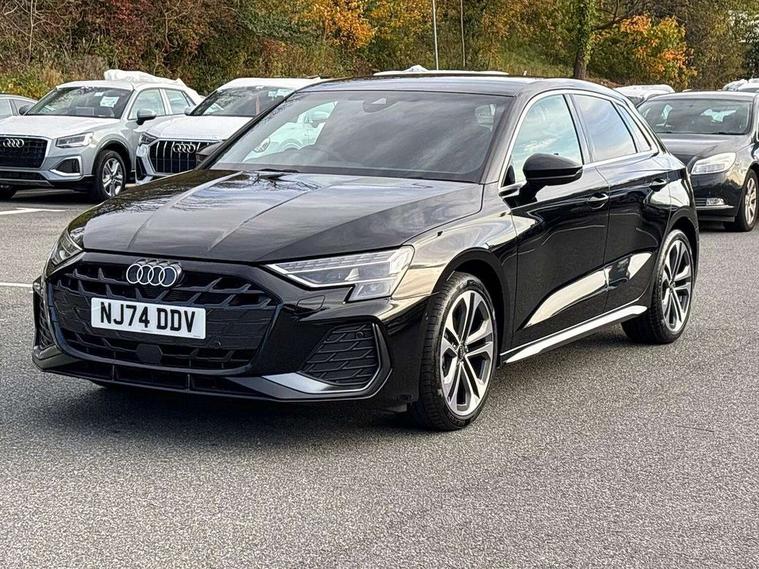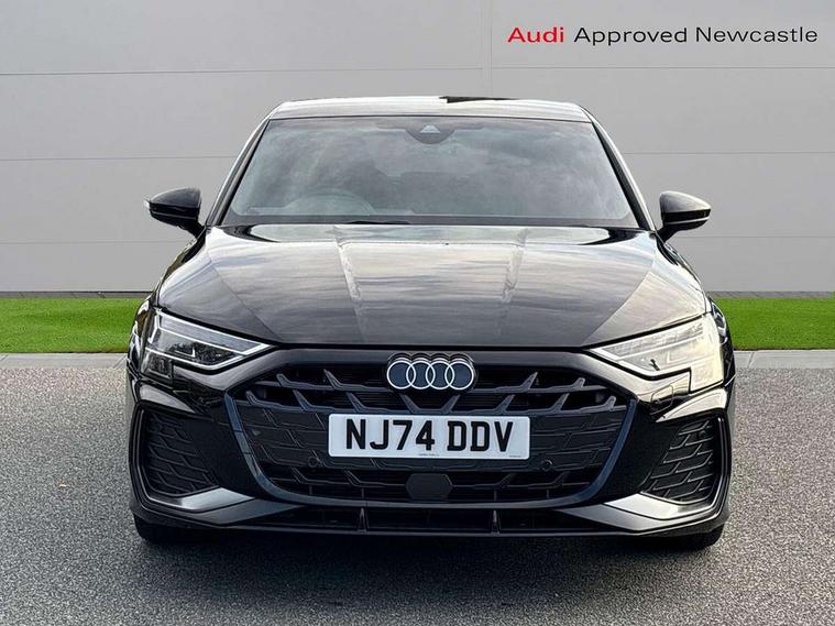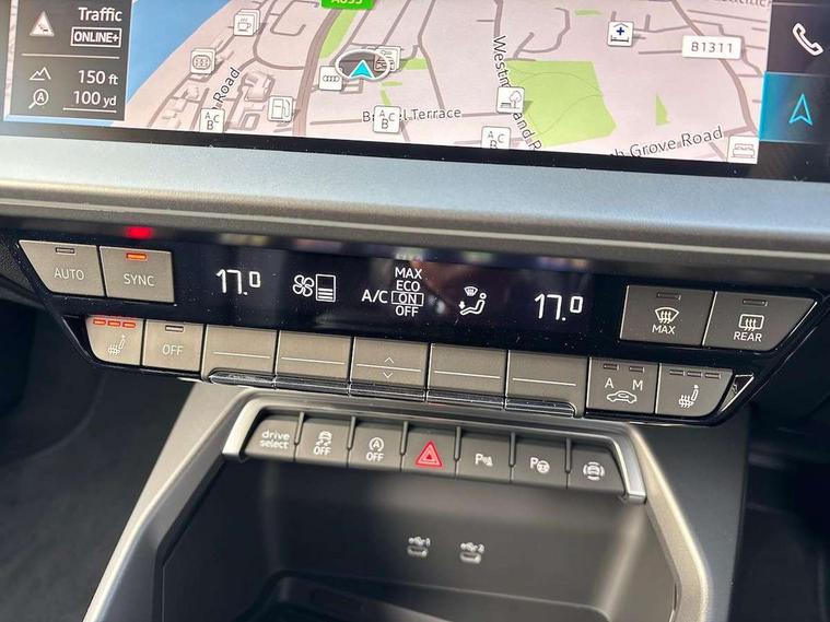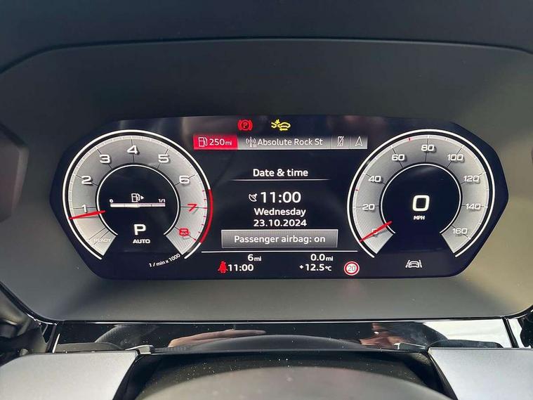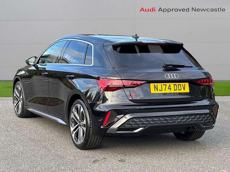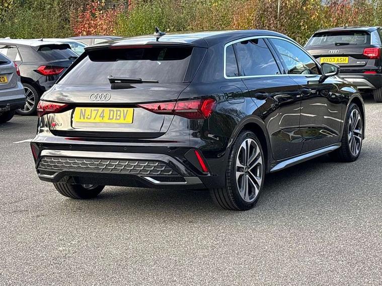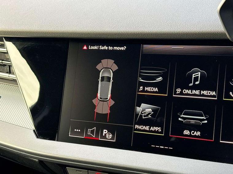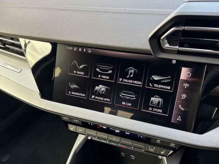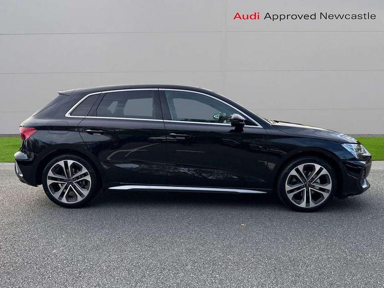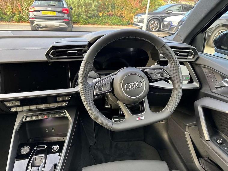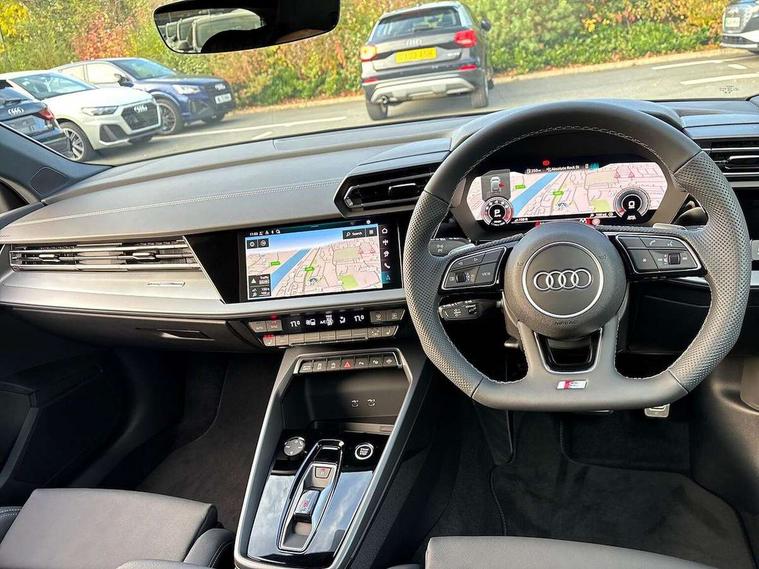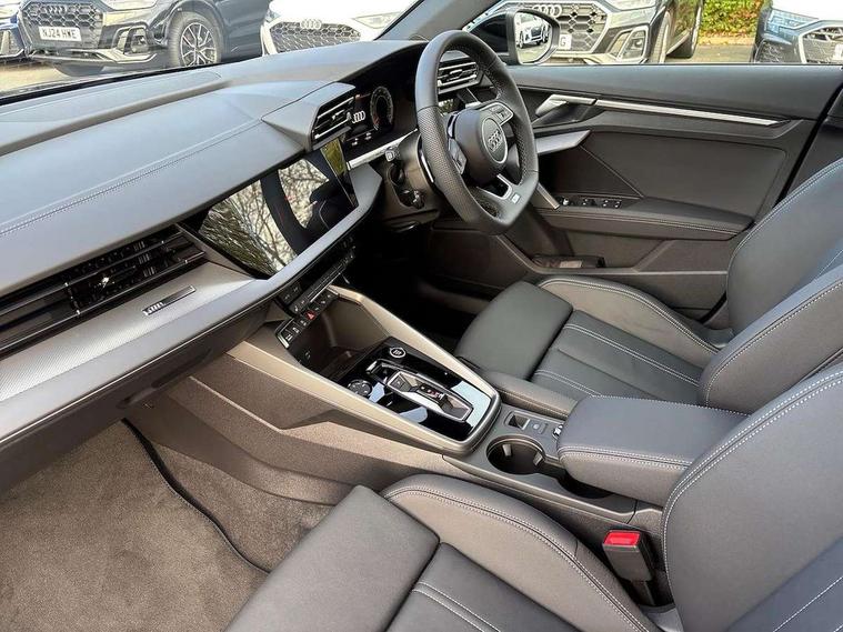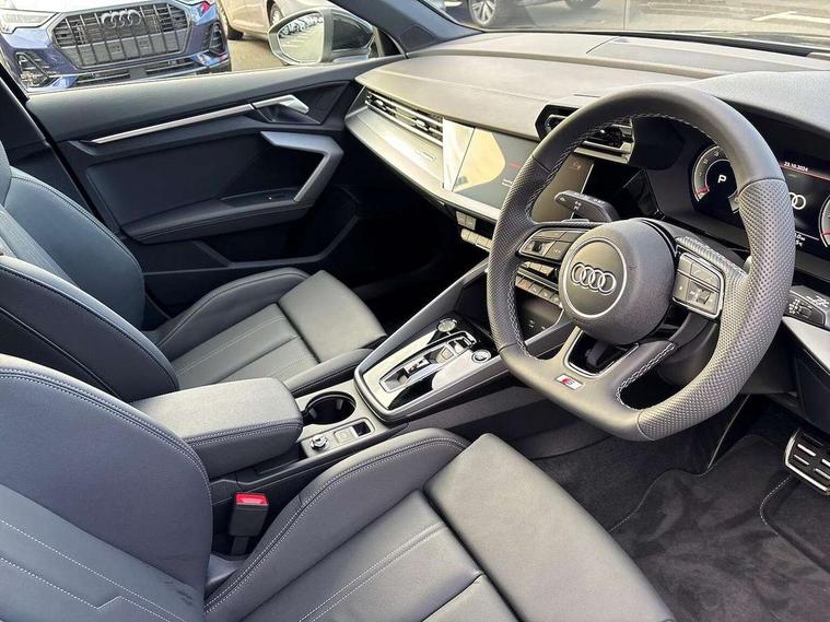 Adjustable speed limiter, Audi drive select, Audi smartphone interface with app store includes wireless Apple carplay, Android auto and Amazon alexa integration, Audi virtual cockpit plus - 12.3" full HD resolution dynamic digital instrument cluster, Automatic start/stop system with recuperation, Bluetooth interface, Camera based traffic sign recognition, Collision avoidance assistant, Cruise control, Distraction and Fatigue warning, e-Call (emergency call), Electromechanical power speed sensitive steering, Lane departure warning system, MMI Navigation Plus with high resolution 10.1" colour touch screen display, Park Assist with parking system Plus, Service indicator, Tailgate, Trip computer, Voice control system with natural language interaction, Sports suspension, Audi Phonebox light with wireless charging, Audi sound system - 10 loudspeakers including centre loudspeaker and subwoofer, DAB Digital radio, USB ports with charging function in the rear, Acoustic glass windscreen, Aluminium window trim, Auto dimming frameless rear view mirror, Body colour exterior mirrors, Chrome exhaust tailpipes, Electrically adjustable/heated/folding/auto dimming door mirrors with integrated LED indications + kerb view function for passenger side, Exterior model badging, Front and rear side air inlets in grained matt black with dark liquid chrome frame, Front electric windows, Front radiator grill in high gloss dark chrome, Heat insulating glass windscreen, Illuminated door sills with aluminium inserts at the front with S logo, LED 3rd brake light, LED daytime running lights, LED headlights with LED rear lights and dynamic rear indicators, Light and rain sensors, Privacy glass - dark tinted rear window, rear door and side windows, Rear diffuser and grill in grained matt black with inlay in dark liquid chrome, Rear electric windows, Rear side wing doors, Rear wiper, S line bumpers, S roof spoiler, Side S line emblems on front wings, Side sill trim in dark liquid chrome, 12V socket and storage compartment in front centre console, 3 seat bench in 2nd row, 3 spoke flat bottomed leather multifunction sport steering wheel with gear shift paddles, 3-zone deluxe automatic air conditioning, 4 way electrically adjustable lumbar support for driver and front passenger, 40/20/40 split folding rear seat bench, Black cloth headlining, Front and rear centre armrest in artificial leather, Front and rear headrests, Front/rear floor mats, Heated front seats, Height and reach adjustable steering wheel, Manual boot compartment lid, Manually adjustable front seats, Rear cup holders, S badging on the steering wheel, Seat side bolsters, Single front passenger seat, Stainless steel pedals and front footrest in black, Twin leather upholstery with front sports seats S embossed logo, Aluminium interior elements pack - A3 Sportback, Multi-coloured LED interior lighting package - A3, 3x3 point rear seat belts, Driver and front passenger airbag with passenger airbag deactivation, Electronic Stabilisation Control (ESC) including ABS, ASR and EDL, First aid kit with warning triangle and 2 safety vests, Front side airbags with head airbags and interaction airbag, Hill hold assist, Pre-sense front with pedestrian and cyclist detection, Seatbelt monitoring, Tyre pressure loss indicator, Anti theft alarm, Anti-theft wheel bolts, Electronically operated child locks, Immobiliser, Remote central locking with safelock, Dash & door Inlay in dark aluminium Spectrum,