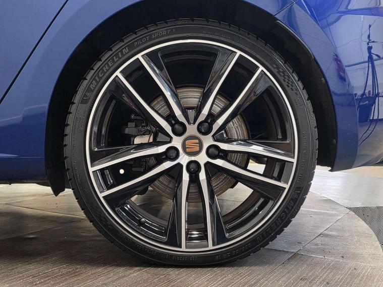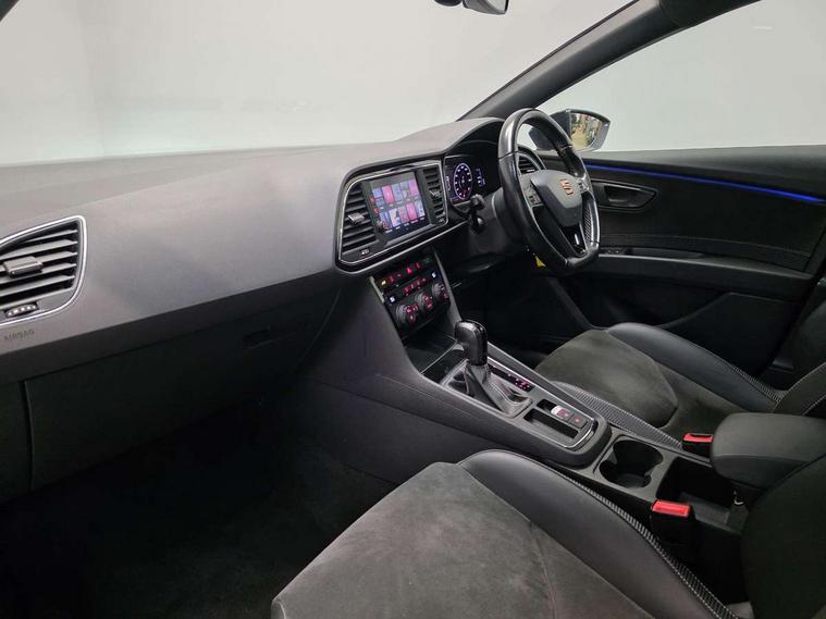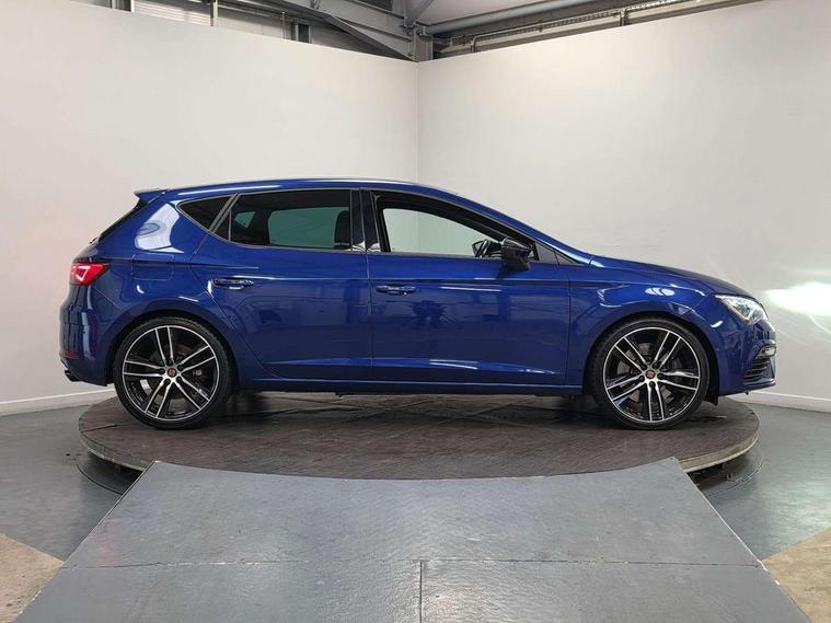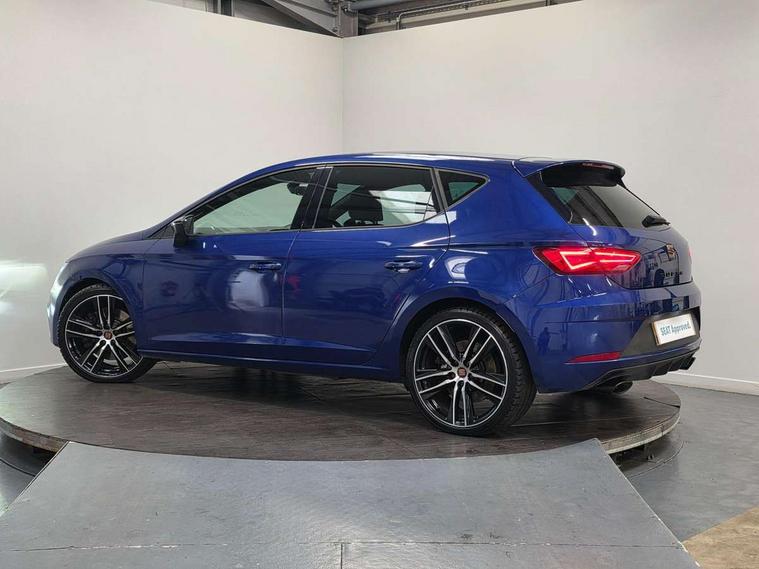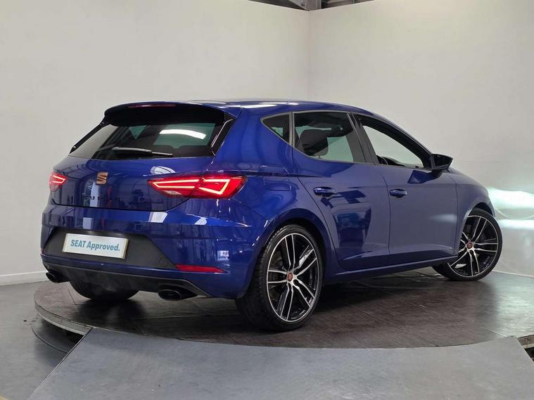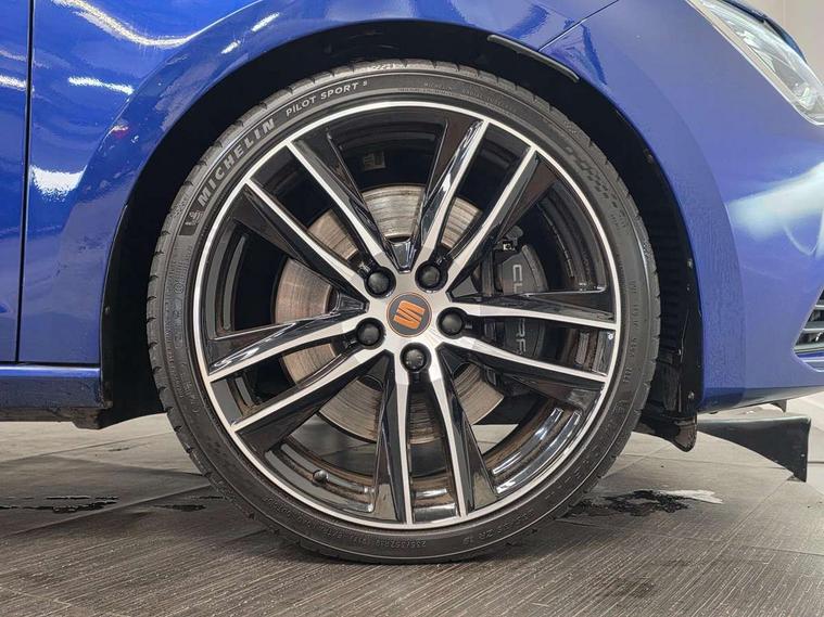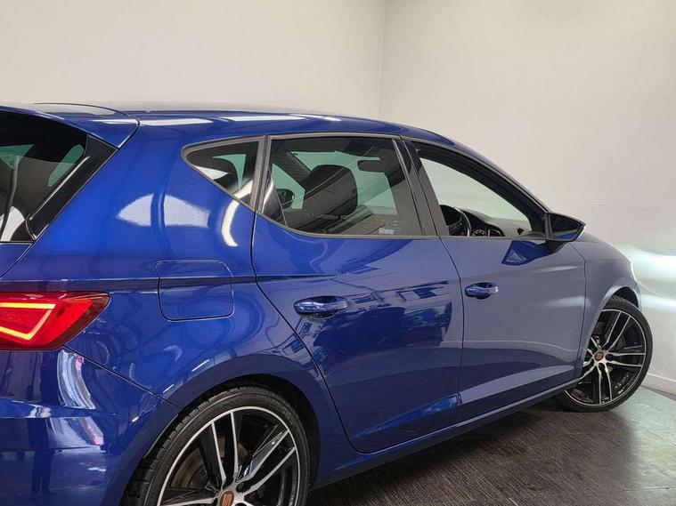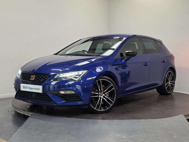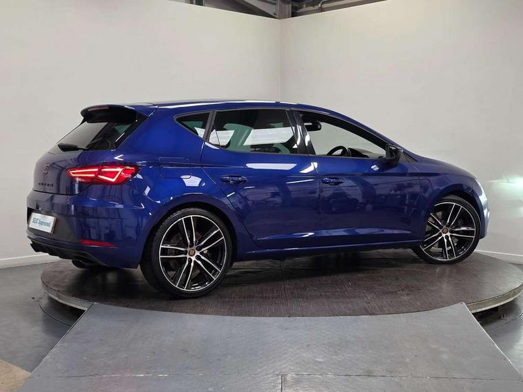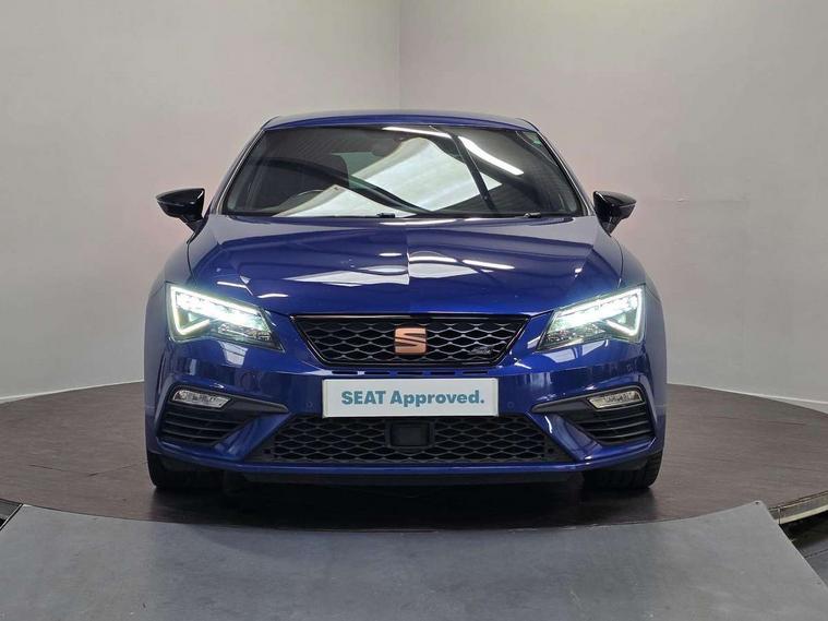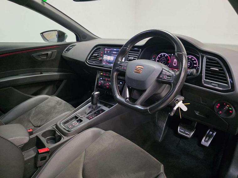CUPRA performance interface, Digital cockpit, Electro-mechanical progressive power assisted steering, Front and rear parking sensors, Front assist with pedestrian protection, Full Link Smartphone Integration with Mirror Link, Apple Car Play, Google Android Auto with USB Type C cable for Apple and Android compatibility, Media system plus with 8" display, 4 USB, 8 speakers, CD, voice control, DAB, bluetooth and handsfree, steering wheel mounted audio and phone control, Navigation system 3D map display, high resolution colour driver display, two SD card slots, RPM, trip computer, outside temp gauge, instrument light brightness, low fuel warning light, lights on reminder, gearshift indicator, SEAT drive profile CUPRA with 4 mode (Cupra/Normal/Sport/Individual), throttle response, sound actuator and gearshift, SEAT logo boot release, Service interval indicator, Dynamic chassis control, Lowered sports suspension, Auxiliary input socket, SEAT USB media cable, Black front grille, Body colour door handles, Body coloured bumpers, Dark tinted rear windows, Electric folding door mirrors, Electric front/rear windows, Electrically adjustable and heated door mirrors, Exclusive Cupra front and rear bumpers, Full LED headlights with LED day time running lights + LED rear tail lights + LED licence plate lights and LED front and rear fog lights, Gloss black exterior mirrors with integrated LED indicators, Gloss black front grille frame, High gloss black finish B and C pillars, Illuminated aluminium front door sill with CUPRA logo, Rear wash/wipe, Visible dual exhaust pipes, 12v power point in centre console, 60/40 split folding rear seat with armrest, Additional heating and ventilation outlet in rear of centre console, Aluminium pedals, Black interior roof, Boot storage net, Cargo rings in boot, Driver and passenger seat height adjust, Driver and passenger sun visor, covered and illuminated mirror, driver sun visor with card holder, Driver seat lumbar adjustment, Dual zone climate control, Dust/pollen filter, Flat bottomed perforated leather steering wheel with white stitching and CUPRA logo and leather gear knob, Front and rear head restraints, Front centre armrest with storage compartment, Front cupholders x 2, Front passenger seat lumbar adjustment, Front seatback storage pockets, Front sport seats in microsuede, Front/rear floor mats, Height adjustable front and rear headrests and third rear headrest, Height/reach adjust steering wheel, High centre console with integrated box & cup holder, rear air outlet, with armrest in front seats, Interior copper and black detailing, ISOFIX points in outer rear seats with top tether anchorage points, Luggage tie-down hooks, Multi-colour ambient interior lighting, Steering wheel gearshift paddles, Storage box under drivers and passenger seat, Convenience pack+ - Leon, 3 point seatbelts on all rear seats, ABS, traction control system and front differential lock system, Child proof door locks, Driver and front passenger airbags with front passenger airbag de-activation, front side, curtain, driver knee airbags, EBA, Electric handbrake, Electronic parking brake with auto hold, ESC with switch off key, Front and rear black brake calipers with cupra logo, Front seatbelt pretensioners, Front seatbelt reminder, Hill hold control, Multi-Collision braking, Tyre pressure monitoring system, 2 folding remote keys with window open/close function and boot opening/door mirror folding function, Central locking fuel filler cap, Engine immobiliser, Locking wheel bolts, Remote central locking + deadlocks, Volumetric alarm with back up horn, Gloss black interior detailing, 19" Cupra Machined alloy wheels 30/2, Space saver spare wheel,