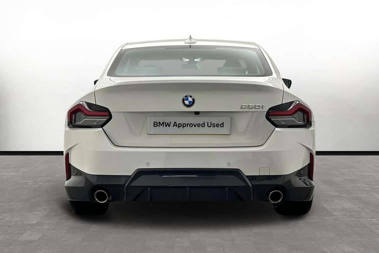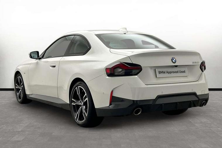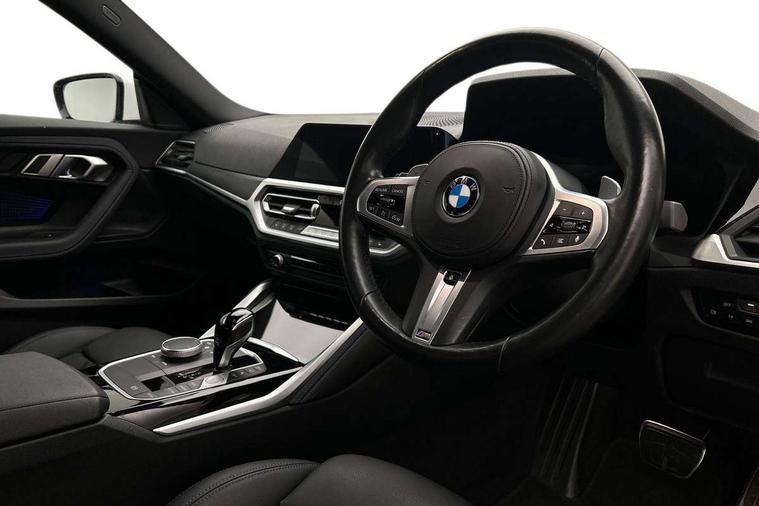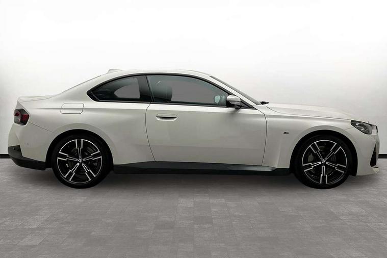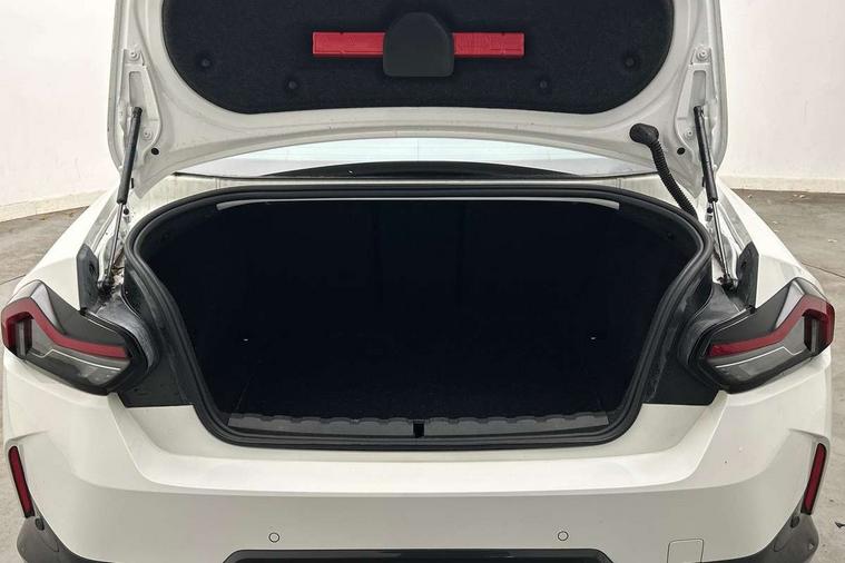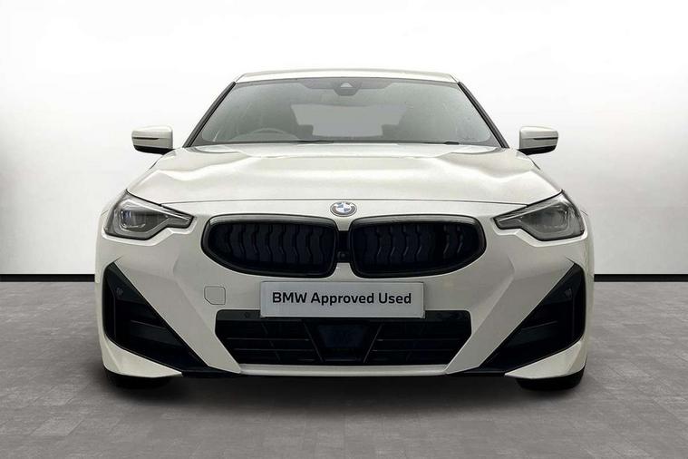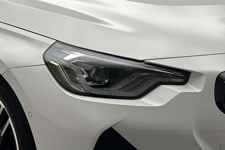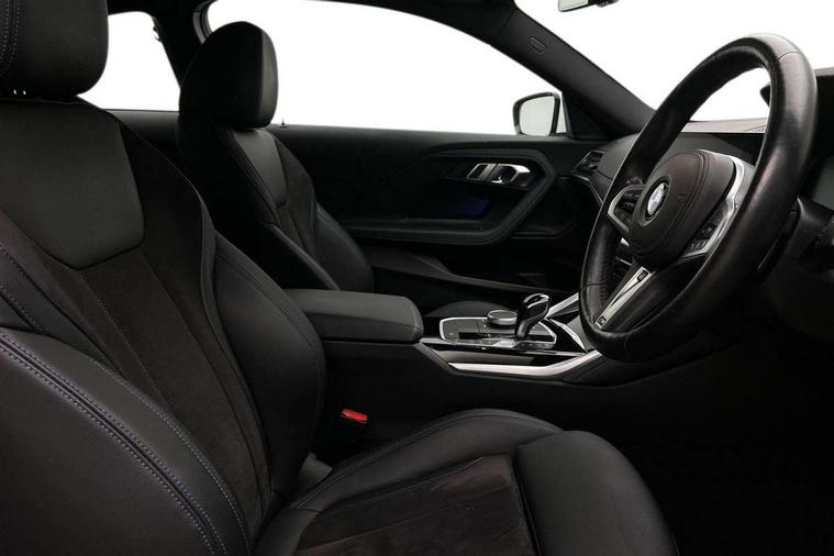 Attentiveness assist, Auto start-stop, Bluetooth, BMW ConnectedDrive online services, BMW Teleservices, Check Control warning system for monitoring of lights and door/luggage compartment open warning, Direct selection buttons, Drive off assistant, Eco pro mode, Electric power steering, Front/rear Parking distance control, iDrive controller with turn and press function, Integrated owners handbook, Intelligent functions, Live cockpit plus with nav function 12.3" instrument cluster and 14.9" centre display, Oil sensor for level and grade, Optimum shift indicator, Personal Profile, Touch operation on control display, Variable sport steering, Widescreen multi-media display, Aluminium lightweight construction, Balancer shaft, BMW TwinPower Turbo four-cylinder petrol engine, Double VANOS, Drive performance control with ECO PRO comfort + sport mode, Electronic differential lock, High precision injection, M sport suspension, Petrol Particulate Filter, Sport automatic steptronic transmission with gearshift paddles, manual gearshift time display, launch control, coasting idle ECO PRO/COMFORT modes, Twin scroll turbocharger with Valvetronic, DAB tuner, Acoustic windscreen wipers for reduced driving noise, Adaptive LED Headlights, Automatic windscreen wipers and automatic headlight, Automatically dimming rear view mirror, Body colour door handles flush with door surface, Body colour door mirrors, Body colour front and rear bumpers, Daytime running lights, Electric windows - front and rear, with open/close fingertip control and trap release, Exhaust tailpipes x2 - 90mm in left and right, Fading support, Front and rear bumper system with replaceable deformation elements, Front door sill finishers in black plastic with BMW designation, Front windscreen wipers with integrated washer jets, Green tinted heat protection glazing, High beam assistant, High gloss shadowline exterior trim in mirror triangle cover, mirror cover panel, mirror bezel and window border, High level third brake light, Indicators integrated int mirror housing, LED registration plate light, LED technology rear tail lights, brake lights and turn indicators, Lightweight engineering, Model designation on right side of tailgate, One piece kidney grille with hight gloss chrome surround, Rear boot, Rear fog lights, Reversing light in rear light cluster, Shark fin antenna, Single part LED rear lights with smoked glass components, Trailer stabilisation logic, Visible VIN plate, 12V power socket in front centre console with blanking plug, 2 cupholders in front centre console, 3 zone automatic air conditioning, Ambient lighting, Compartment in front of cupholder, Conditioned based service, Driver seat backrest width adjustment, Front and rear side armrests integrated into door trim, Front armrest, Front door pockets, Front head restraints, Front sport seats, Heated front seats, Illuminated glove compartment with separate small compartment, M headliner Anthracite, M sport leather steering wheel, Manually adjustment steering wheel column, Rear seat backrest with manual 40:20:40 split folding, Rear seat centre foldable armrest with integrated cup holder, Single front passenger seat, Storage compartment between rear seats, Storage tray and compartment with cover in centre console, Sun visors with vanity mirrors and insert tab, Through loading system with 40/20/40 split folding 2 rear seat in 2nd row, Two folding rear seat headrests, Velour floor mats, Additional storage compartment pack without USB - 2 Series Coupe, Connected pack professional - 2 Series Coupe, Interior and exterior mirror pack - 2 Series Coupe, M Sport exterior styling aerodynamics pack - 2 Series Coupe, 2 tone horn, Anti lock braking system (ABS) with cornering brake control, Automatic Stability Control (ASC), BMW emergency call, Brake drying, Child seat ISOFIX attachment for the two outer rear seats, Crash sensor activating of airbags, Unlocking doors, hazard warning lights, interior light, safety battery terminal, Deactivation of fuel pump in the event of a crash, Driver and front passenger airbags, Driver and front passenger side airbags, integrated in the door side seat backrest bolsters for all seat variants, Dynamic brake control, Dynamic stability control + (DSC+), Dynamic Traction Control - DTC, Electrically operated hand brake including automatic hold function and automatic release when driving off, Front and rear disc brakes, Front passenger airbag deactivation, Head airbags for all 4 outer seats, Manual deactivation of front passenger airbag, Seat belt security check for driver and front passenger, Seatbelt warning, Side impact protection, Three point seat belts on 4 seats including front belt stopper, pyrotechnic belt tensioners and belt force limiters, Tyre pressure sensor, Warning triangle and first aid kit, Alarm system (Thatcham 1) with remote control and electronic engine immobiliser, Central locking switch for all doors, fuel filler cap and luggage compartment, Deadlocking function system to all doors, Drive away locking system on all doors and luggage compartment, Locking wheel bolts, Start/Stop button (illuminated) in centre console with keyless engine start and Auto Start-Stop deactivation button, Two remote control key with integrated key - one button for open and close doors/fuel flap/tailgate and separate button for unlock luggage compartment, BMW mobility tyre sealing system, Electrically powered 12V compressor, Reduced rolling resistance tyres,