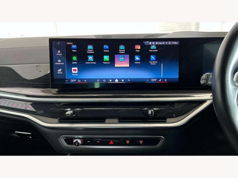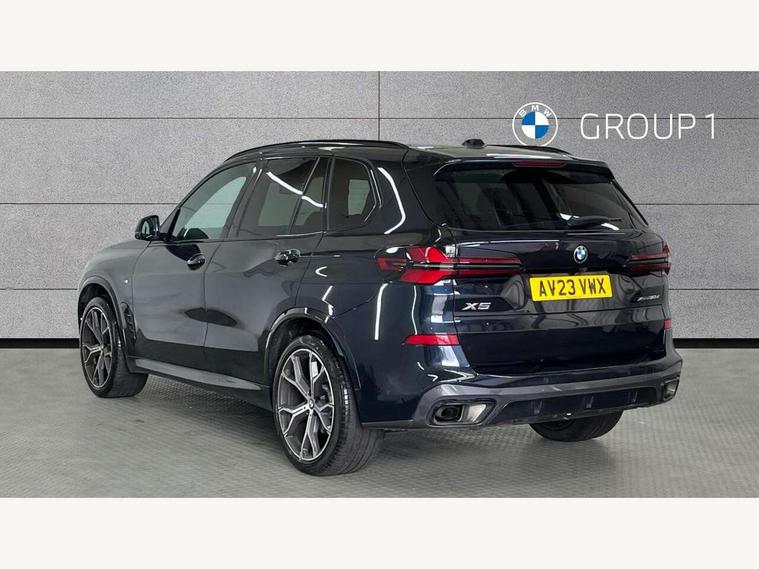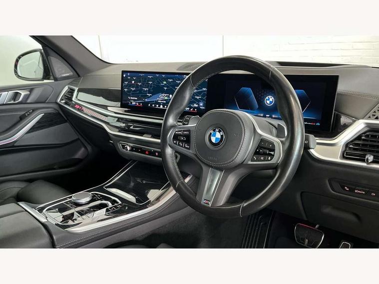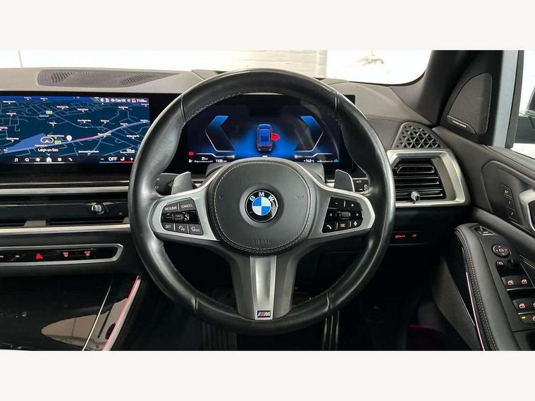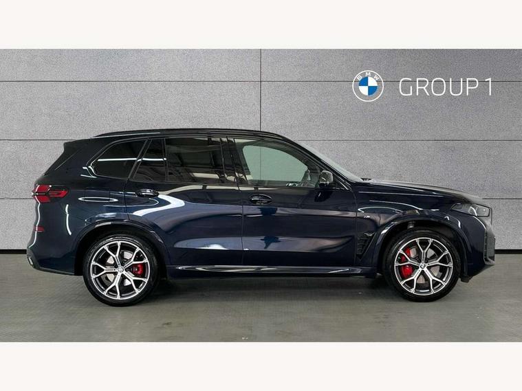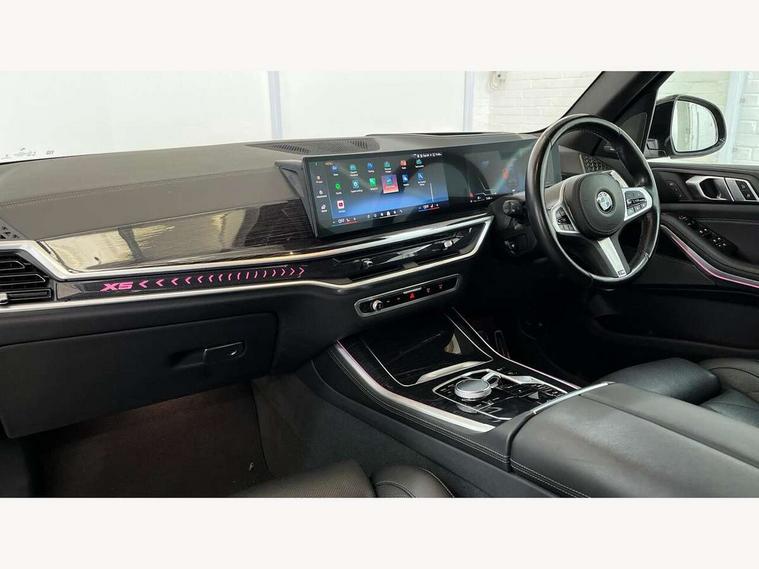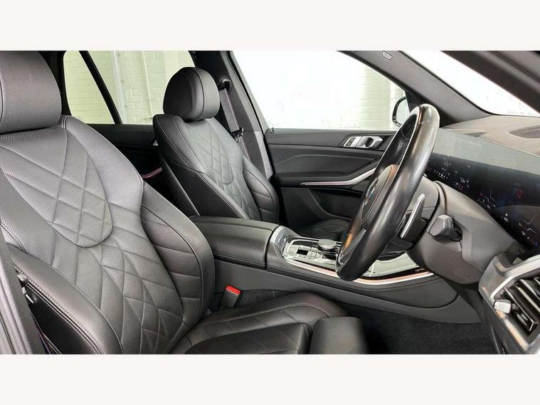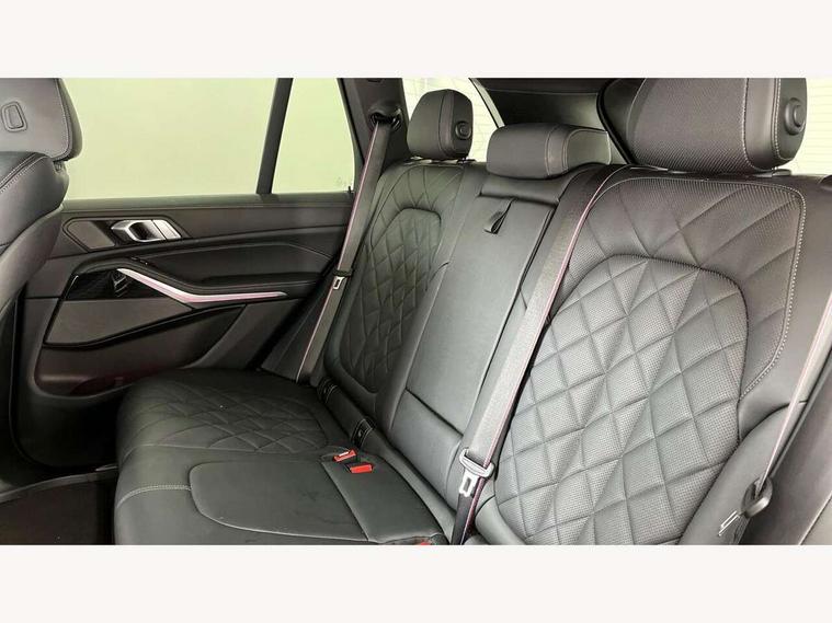 Attentiveness assist, Automatic tailgate operation, BMW ConnectedDrive online services, BMW live cockpit + with curved 12.3 instrument cluster/14.9 central display, nav/Tuner with diversity reception, RDS/4GLTE/remote software upgrade, BMW Recovery system, BMW Teleservices, Condition based service, Cruise control with brake assist, eCall emergency call system, Enhanced bluetooth with wireless charging, Integrated owner's handbook, PAS, Speed limiter, Wi-Fi hotspot, Drive performance control with ECO PRO comfort + sport mode, Eight speed steptronic sport automatic transmission and gearshift paddles on the steering wheel, Hi-Fi loudspeaker system, Adaptive LED Headlights, Front and rear electric windows, High beam assistant, High gloss black shadow line roof rails, LED daytime running lights, Rear side wing doors, Third brake light in rear spoiler, Variable intermittent rear wash/wipe, 12V - Power sockets with 2x centre console and 1x luggage compartment, 3 seat bench in 2nd row, Foldable rear centre armrest with 2 cupholders and storage compartment, Front and rear side armrest integrated into door trim, Headrests for all seats, Luggage compartment separating net, Single front passenger seat, Three spoke sport M leather steering wheel, Velour floormats, Ambient light interior pack - X5, Driving assistant pack with radar based driver assistance system - X5, Expanded exterior mirror pack - X5/X5 M, M aerodynamics pack - X5, 3 rear seatbelts, Active protection, Airbags - driver/front passenger, rear and side, first and second row seats head airbags, front passenger seat airbag deactivation + knee airbag, Anti-lock braking system (ABS), Automatic Stability Control (ASC), Brake energy regeneration, Cornering brake control (CBC), Crash sensor activating central locking release, hazard warning lights, fuel cut off, interior lighting + activation of safety battery terminal clamp, DSC - Dynamic Stability Control, Dynamic Traction Control - DTC, Electromechanical parking brake with automatic drive away release and auto hold function, Electronic brake force distribution, Hill start assistant, M Sport blue painted brake calipers with 'M' designation, Mechanical child proof lock on rear doors, Tyre pressure monitoring system, Tyre pressure sensors, Ventilated front and rear disc brakes, Warning triangle and first aid kit, Closing system with central locking, Comfort access system, Locking wheel bolts, Sensatec instrument panel,