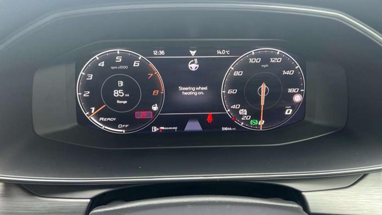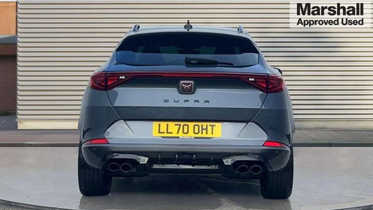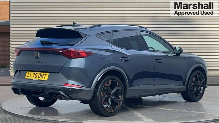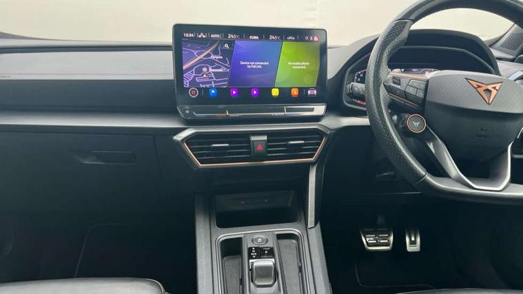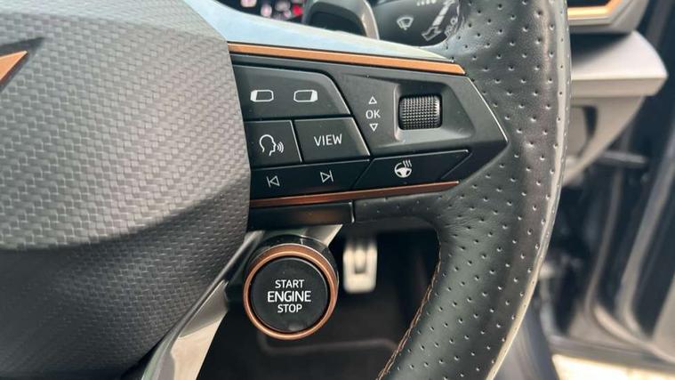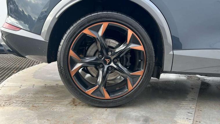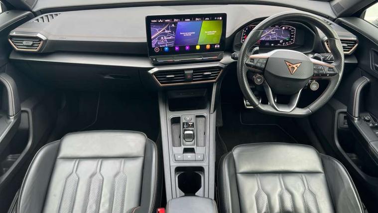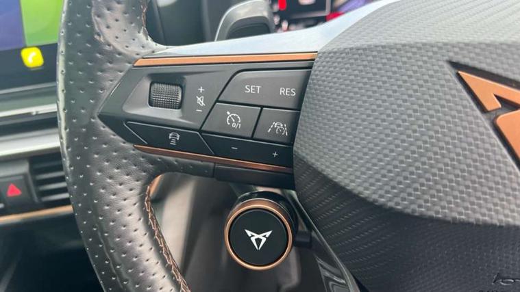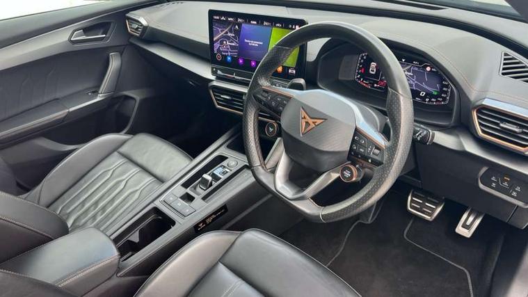 Digital cockpit and configurable dashboard, Driver alert system, Dynamic chassis control with driving profile selection (Comfort, Sport, CUPRA, Individual), Forward collision warning with automatic braking, Park assist (inc front/rear parking sensors), Predictive adaptive cruise control with speed limiter, Rear view camera, RPM, trip computer, outside temp gauge, instrument light brightness, low fuel warning light, lights on reminder, gearshift indicator, Service interval indicator, Speed sensitive power steering, Start/stop system with regenerative braking, Virtual pedal and electric tailgate, Wireless apple carplay, Wireless phone charger, Electronic locking differential and dynamic traction support, Sports suspension with front shock absoption, 2 front and 2 rear USB type C sockets, Auxiliary input socket, DAB radio, Auto dimming rear view mirror, Body colour door handles, Body coloured bumpers, Dark grey wing mirror, Daytime running light with automatic headlight control and coming home feature, Dynamic headlight range control, Electric front/rear windows, Electrically adjustable, heated and folding door mirrors, Front fog lamps with cornering function, Gloss black roof rails and window surrounds, LED Headlights, LED Taillights with dynamic indicator, Metallic paint, Panoramic sunroof, Rain sensing wipers, Rear diffuser with twin exhaust pipe on each side, Rear wash/wipe, Sports bumpers, Tinted rear windows, Welcome lights, 12v power supply in centre console, 12v socket in loadspace, 2 front and 2 rear reading lights, 230V socket, 60/40 split rear bench seat with armrest and mechanical seat release, Black headlining, Cupra sports pedals, Dust/pollen filter, Front and rear head restraints, Front centre armrest, Heated steering wheel, Height/reach adjust steering wheel, Illuminated interior front door sills, Illuminated sunvisor with mirror, Interior ambient lighting, Isofix, Leather multi-function sports steering wheel with start stop, CUPRA mode button and gear shift paddles, Luggage tie-down hooks, Three zone climate control, Three zone climate control with control panel in rear, Variable luggage/load compartment floor, Wraparound lighting, Genuine Nappa leather Pack - Cupra, Navigation system pack - Formentor, Safety and driving pack (XL) - Formentor, 3 point seatbelts on all rear seats, ABS, Brake control system - ESC and brake booster, Brembo brakes, Child proof door locks, Driver and front passenger airbags with front passenger airbag de-activation, Electronic parking brake, Front side curtain airbags, Hill hold control, Seat belt reminder for front and rear seats, Tyre pressure monitoring system, Anti theft alarm system, Keyless entry and start system (KESSY), Locking wheel bolts, Copper and aluminium interior detailing, 19" Sport copper/black alloy wheels with 94W tyres, Breakdown kit, Emergency tyre repair kit,
