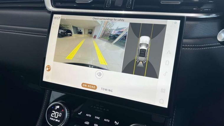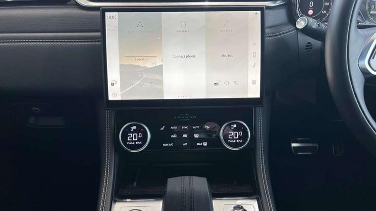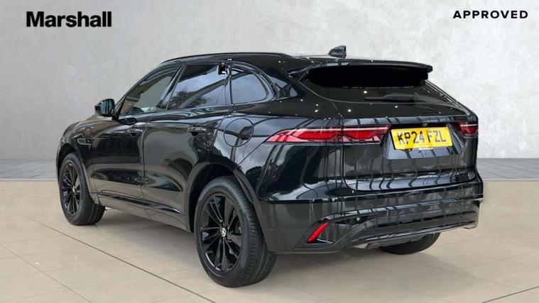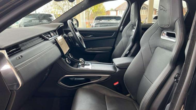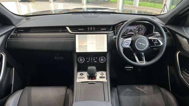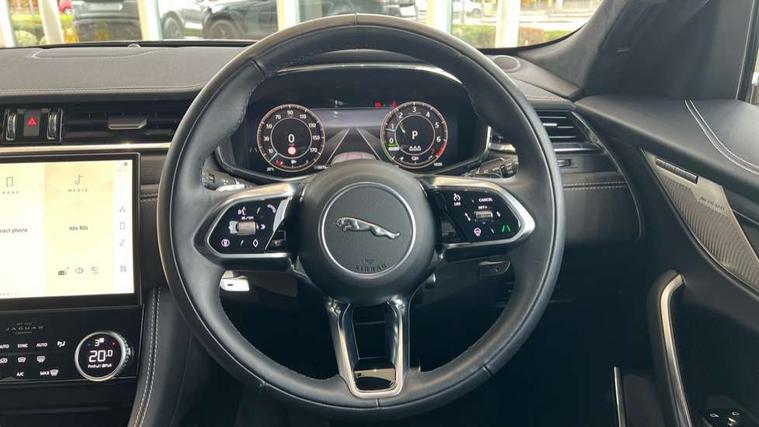 11.4" touchscreen, Adaptive cruise control with steering assist, Android Auto, Apple car play, Blind spot assist, Bluetooth connectivity, Clear exit monitor, Driver alert system, Driver condition monitor, eCall emergency call system, Eco driving style assistant, Electric power assisted steering, InControl remote, Interactive driver display digital with 12" TFT display, Jaguar Toggle shift selector, Lane departure warning system, Lane keep assist, Outside temperature gauge, Personalisation profile management, Pivi pro connected navigation system with app interface and media storage, Pro services and wifi hotspot, Push button starter, Rear collision monitor, Rear traffic monitor, Service interval indicator, Speed proportional steering, Start up sequence with movement in dials and lighting, Traffic sign recognition with adaptive speed limiter, Trip computer, Voice control system, Wireless device charging, 7 kW onboard charger, 8 speed automatic transmission, AC/DC charging, Adaptive dynamics, All terrain progress control, All Wheel Drive (AWD), Configurable dynamics, Home charging cable, Open differential with torque vectoring by braking, Public charging cable, AM/FM radio, Bluetooth streaming, DAB Radio (Digital Audio Broadcasting), Dynamic volume control, InControl apps, InControl protect, iPod integration, 3 flash lane change indicators, AHBA and animated directional indicators, Approach Illumination, Auto dimming rear view mirror, Automatic headlights, Electric heated/power fold memory door mirrors with approach lights and auto dimming driver side, Electric windows with one touch open/close and anti trap, F-Pace and R Dynamic badge, Green tinted glass, Heated front windscreen + heated washer jets, Heated rear window with timer, Illuminated metal tread plates with Jaguar script, Jaguar script and leaper, LED High level third brake light, LED tail lights, Metal load space scuff plates, Non acoustic front windscreen, P400e AWD badge, Privacy glass (rear side windows and rear screen), R Dynamic badge on side door, Rain sensor windscreen wipers, Rear fog lights, Rear metal tread plates, Rear side wing doors, Rear wiper, Trailer stability assist, Variable front intermittent wipers, 12V power point front, 3 rear headrests, 3 seat bench in 2nd row, Additional power sockets - Two additional USB sockets in rear centre console and one 12V socket in trunk, Air distribution speed, Bright metal foot pedals, Centre armrest console, Centre console with side storage, Configurable cabin lighting, Deletion loadspace storage rails, Door sill tread plates, Ebony suede cloth headlining, Electrically adjustable steering column, Fold flat front seats, Front centre armrest with storage compartment, Front door storage space, Glovebox finisher with jaguar script, Heated steering wheel, Hooks in loadspace, Illuminated glovebox, Interior front door handles with separate locking switches, ISOFIX on outer rear seats, Jaguar sense, Leather steering wheel, Luggage tie downs in loadspace, Mist sensing, Multifunction steering wheel, Overhead lighting console, Overhead stowage for sunglasses, Passive front head restraints, Premium carpet mats, Rear air vents, Rear armrest with twin cupholders, Rear centre headrest, Rear door storage space, Reversible boot floor, Satin chrome gearshift paddles, Shopping bag hook, Single front passenger seat, Sunvisors with illuminated vanity mirrors, Twin front cupholders with cover, Online Pack with data plan - F-Pace, 380mm front brakes and 325mm rear brakes, 3x3 point rear seatbelts, ABS, All surface progress control (ASPC), Brake pad warning light, DSC - Dynamic Stability Control, Electric parking brake (EPB), Emergency brake assist, Front airbags with passenger seat occupant detector, Front and rear seatbelt reminder, Front side airbags, Full length side window curtain airbag, Hill launch assist, Power operated child locks, Traction control, Tyre pressure monitoring system, Immobiliser, Keyless entry, Keyless Start, Locking wheel nuts, Perimeter alarm, Remote central locking, Valet mode,