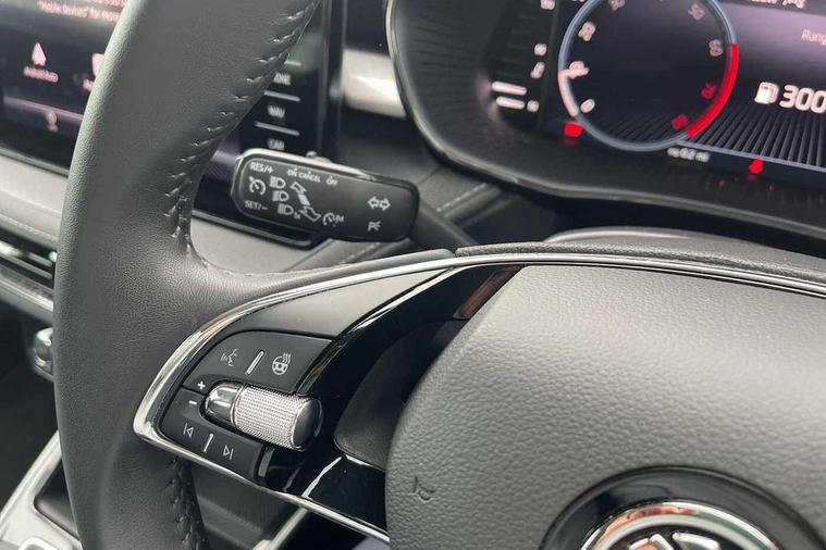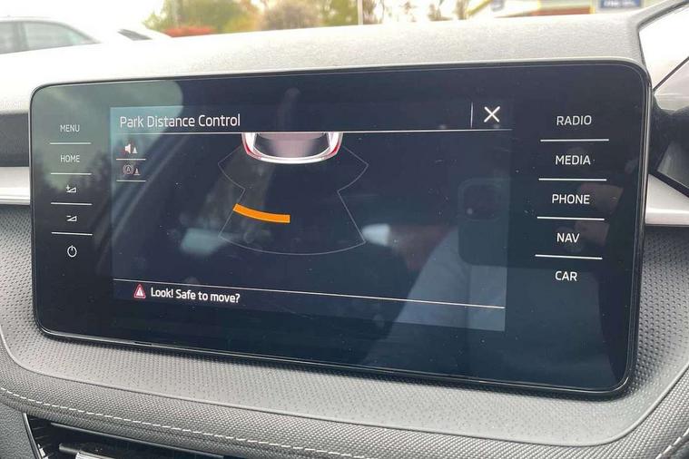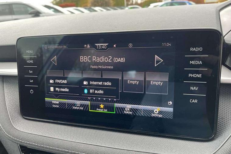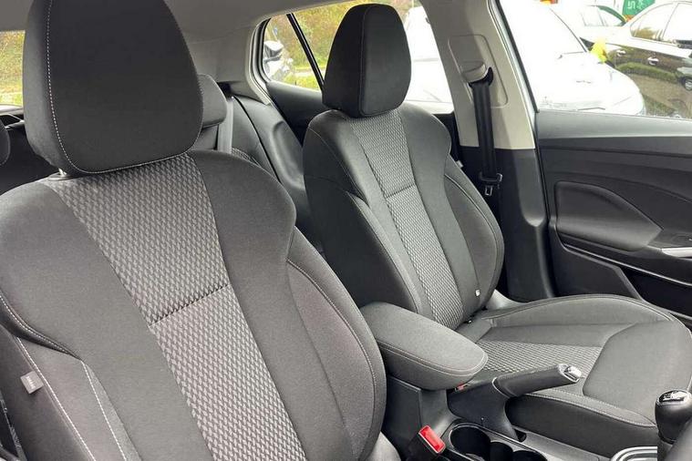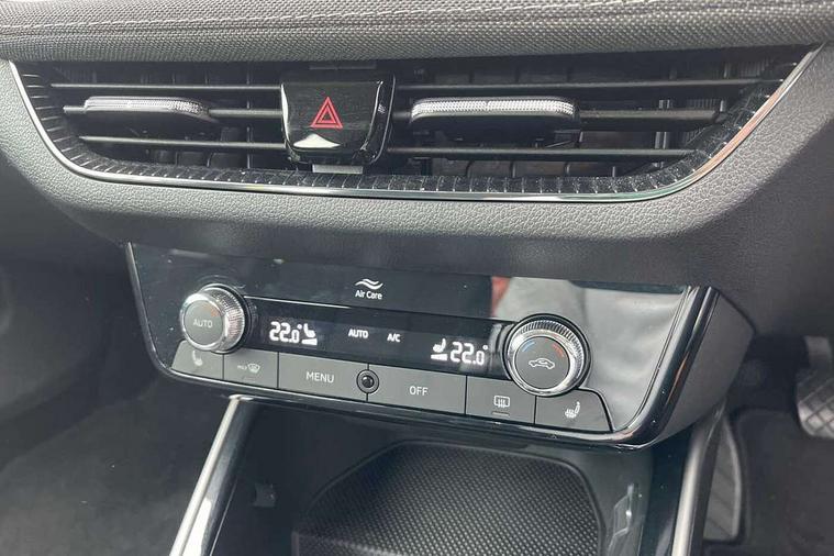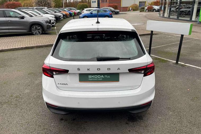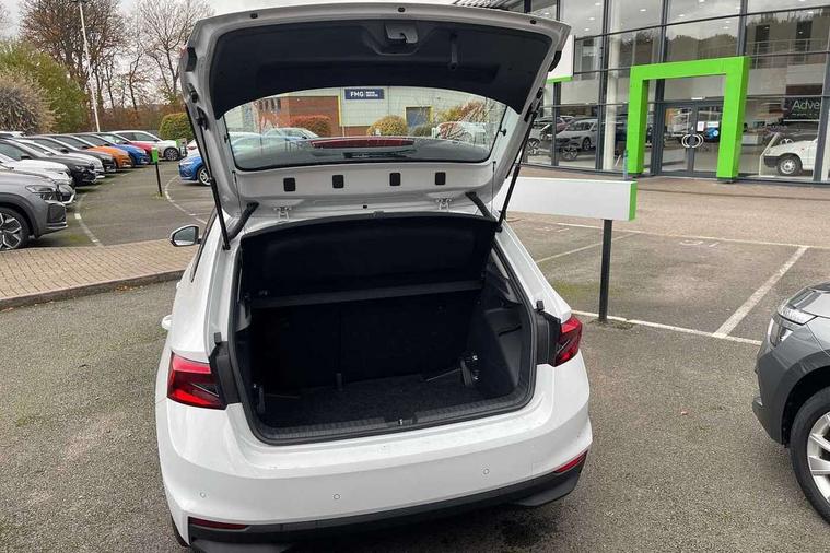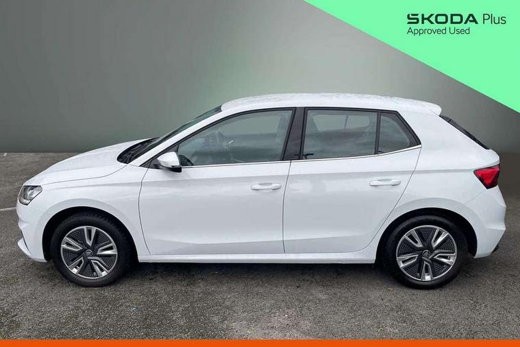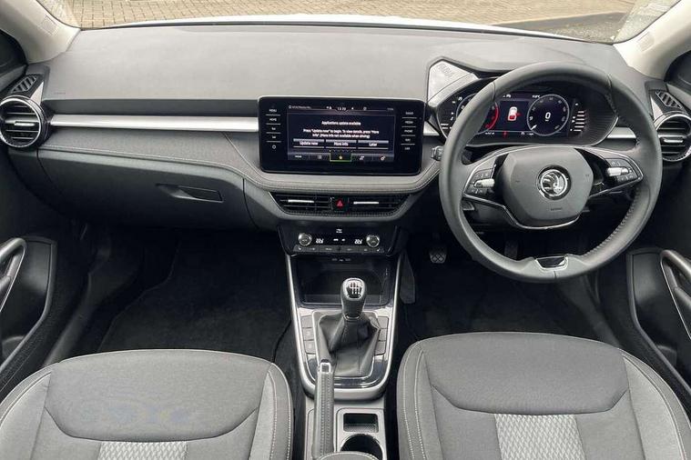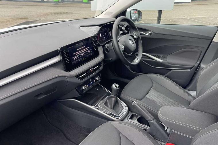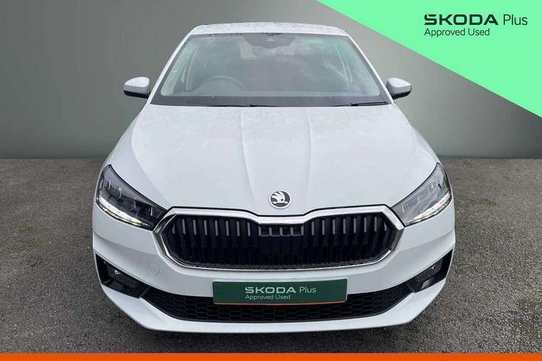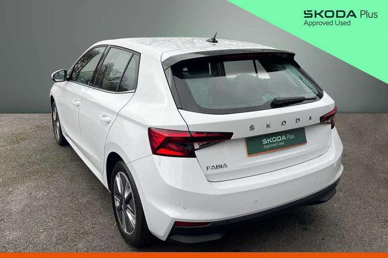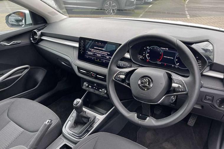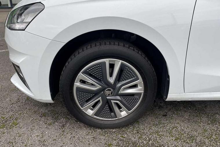 Bluetooth connection, Driver alert system - DAS, Electromechanical power steering, Exterior temperature gauge, Service interval indicator, 2x USB-C in the front (for data transmission and charging), 6 Speakers (4 in front and 2 in rear), Auxiliary socket for external MP3 player, DAB digital radio reception, Web radio, Auto dimming rear view mirror, Body colour door mirrors, Body coloured bumpers, Chrome window surround, Door mirror integrated indicators, Electrically adjustable and heated door mirrors, Front and rear electric windows, Front window wiper intermittent control, Headlight range control - Automatic, Ice scraper in fuel cap, LED daytime running lights with coming and leaving home feature, Rear LED fog light, Rear side wing doors, Rear window wiper with washing nozzles, Roof mounted spoiler, SKODA tailgate lettering in chrome, Third brake light, 3 rear headrests, Backrest split and folding, Central console with fixed cup holder and storage box, Chrome handbrake release button, Comfort seats, Fabric upholstery, Front centre armrest, Gearshift knob/handle in leather, Hand brake lever handle in leather, Height adjustable front headrests, Height adjustable front seats, Height adjustable steering wheel, ISOFIX and TopTether anchorage points to the outer rear seats, ISOFIX and TopTether on the front passenger seat, Luggage compartment lighting, Manually adjustable lumbar support in front seats, Pollen filter, Rear seat bench unsplit, Removable cup holder, Single front passenger seat, Storm grey headlining, Sun visors with mirror and airbag label on passenger side, Textile floor mats, Ticket holder, Umbrella in drivers door, Ambient lighting pack 2 - Fabia Hatchback, 3-point height adjustable front seats belts with pretensioner and force limiter, Automatic warning lights in case of crash, Driver and passengers airbag with switch off function, e-Call+, ESC including ABS, MSR, ASR, EDS, HBA and XDS, Front and rear seat belt warning, FRONT ASSIST (AEB City and AEB Inter Urban), Front side airbags, Head airbags, One tone horn, Pedestrian protection, Three rear 3-points safety seat belts with pretensioner and force limiter including stop function for outer rear seat belts, Tyre pressure monitoring system, Anti-theft alarm system including immobiliser, interior monitoring, backup horn, and towing protection, Chrome edged air vents, Satin black door and side trim panel in front, Anti-theft wheel bolts protection, Super-low rolling resistance tyres,
